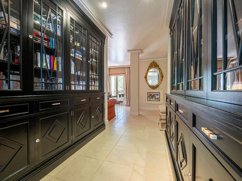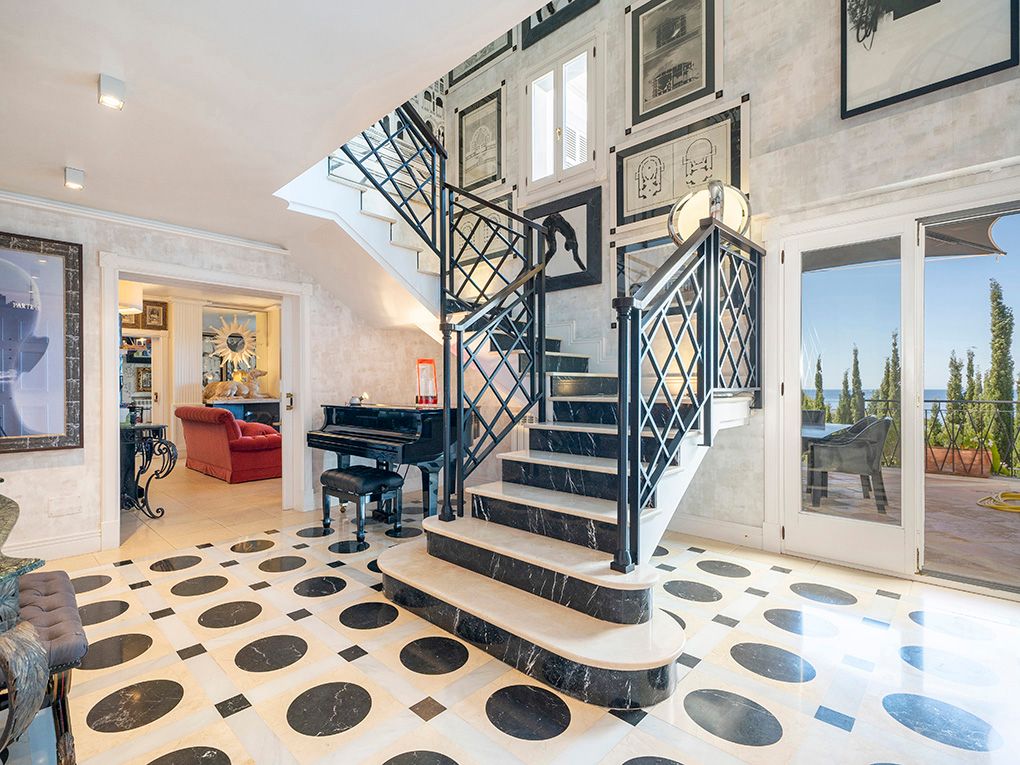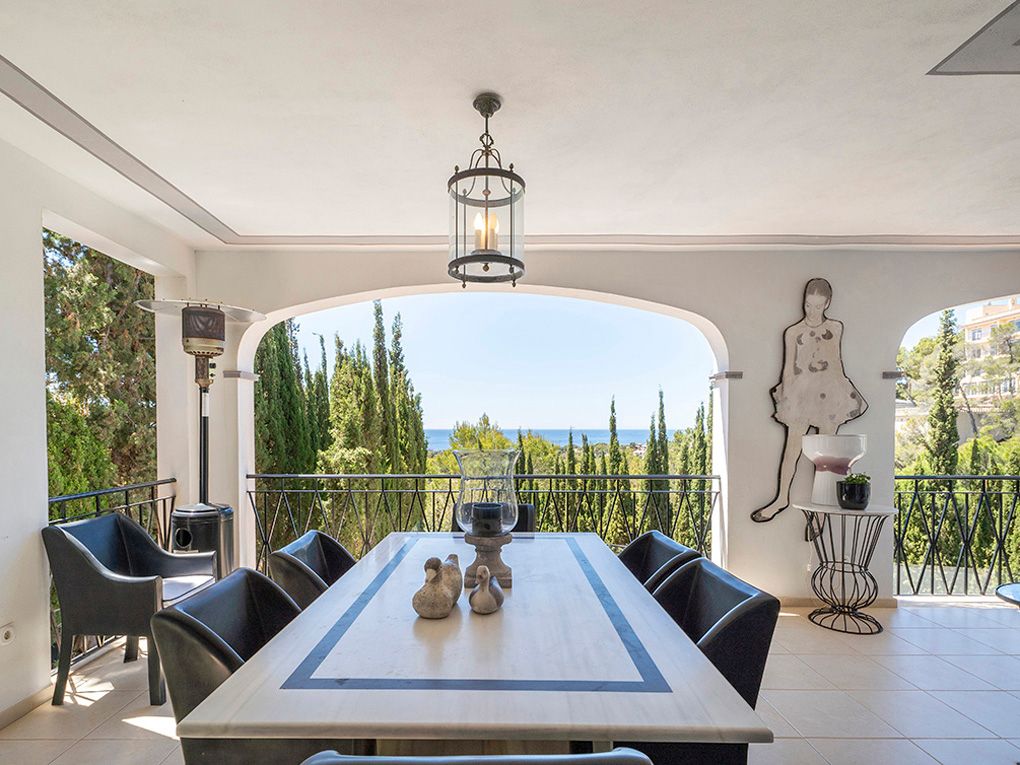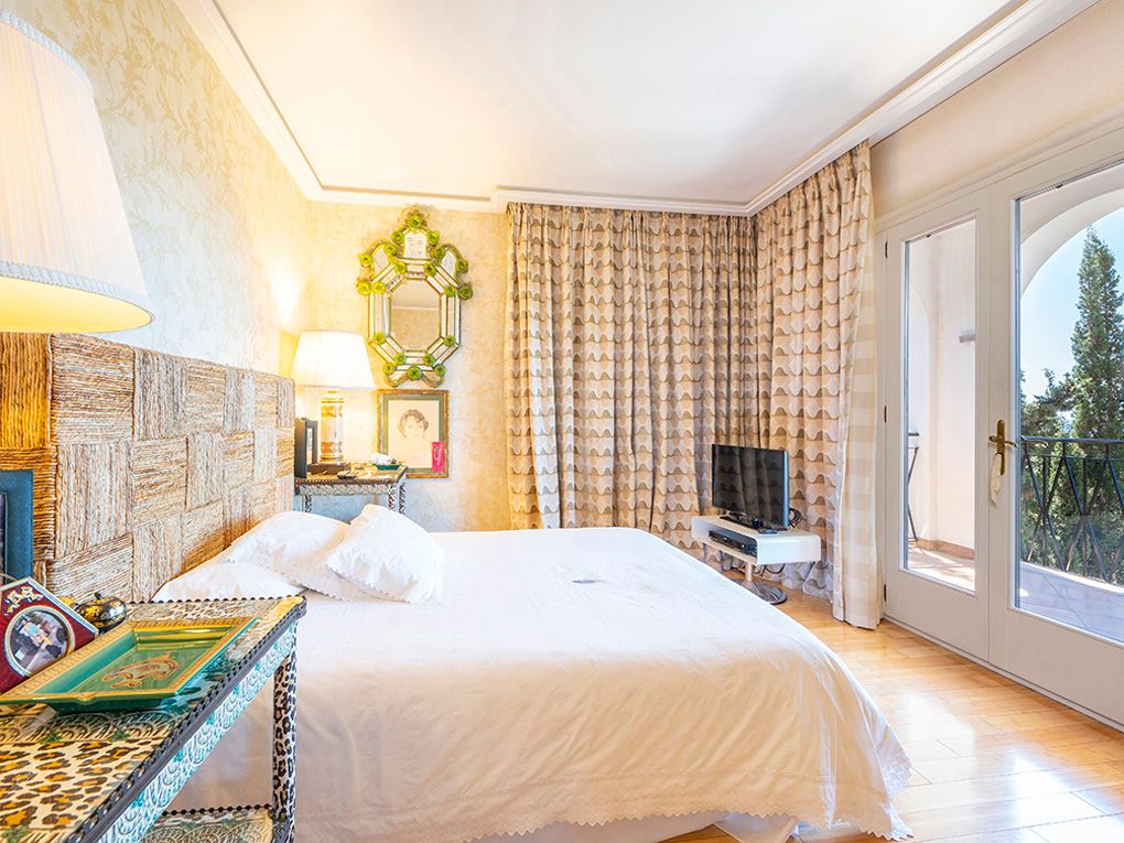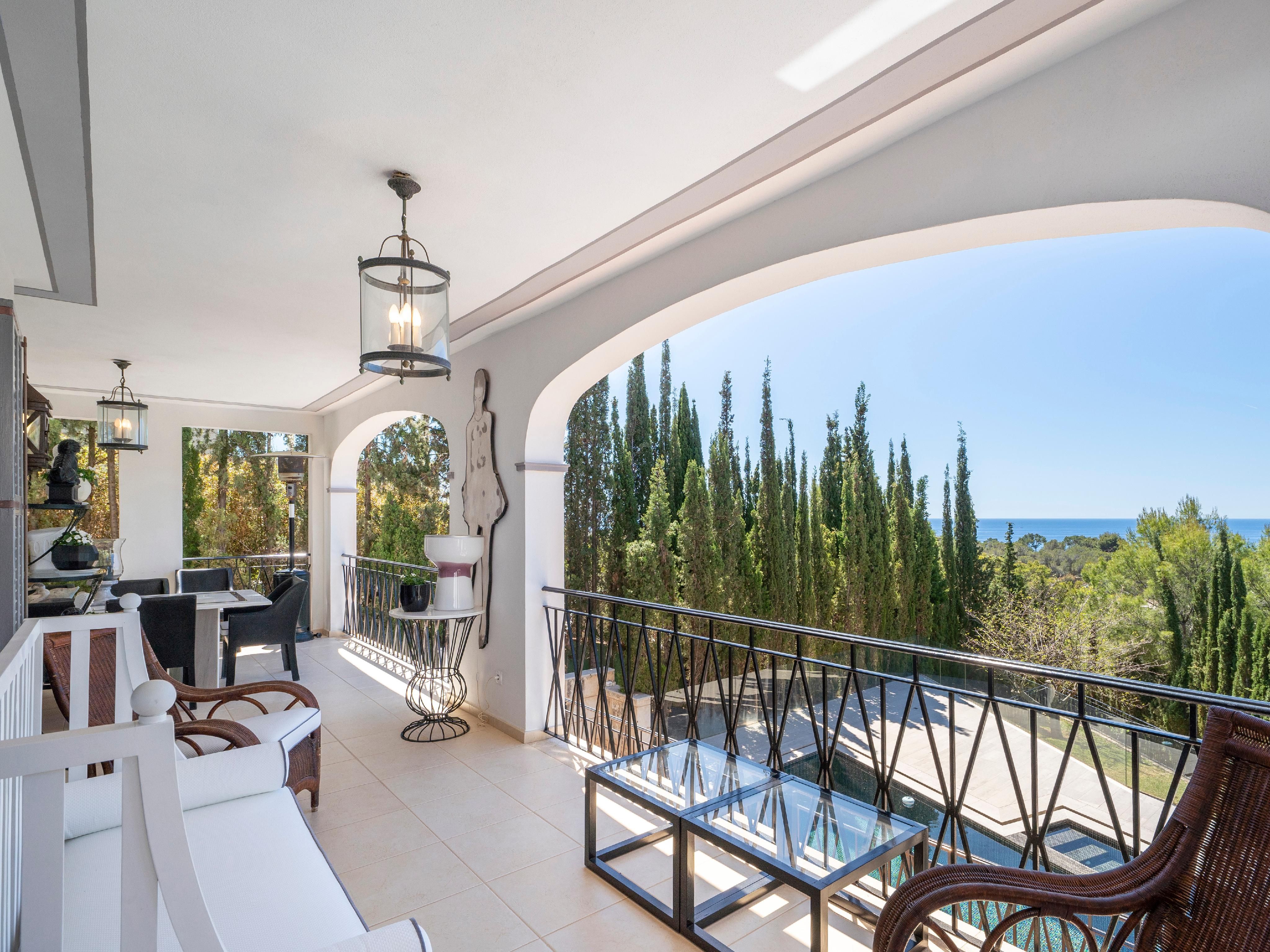 Denne stilfulde villa ligger i et roligt boligområde og imponerer med sin privilegerede beliggenhed med fantastisk havudsigt og nærhed til strande og indkøbsmuligheder. Den ligger på en grund på ca. 1.260 m² og tilbyder masser af privatliv og kombinerer eksklusiv boligkomfort med en middelhavsstil. Huset strækker sig over to etager. I stueetagen er der to rummelige soveværelser med en-suite badeværelser og omklædningsrum - begge med udsigt over haven, poolen og havet. Den lyse opholds- og spisestue har udgang til den store poolterrasse, mens det rummelige køkken har et separat morgenmadslokale. Andre funktionelle rum som et strygerum, et spisekammer, et stuepigeværelse og et badeværelse fuldender rummet. Ovenpå er der et enkelt soveværelse og et soveværelse med badeværelse, påklædningsværelse og fransk altan med havudsigt. En stilfuld lounge/bibliotek med terrasse giver plads til at slappe af. Det store soveværelse med eget badeværelse, påklædningsværelse og adgang til et andet soveværelse med badeværelse har udgang til den store terrasse med fantastisk udsigt. Højkvalitetsfunktioner inkluderer et fitnessrum, elevator, aircondition, gasopvarmning, fine gulve (marmor, granit, bambus), termoruder, indbyggede skabe, elektriske porte, persienner, alarmsystem og en rummelig saltvandspool. En eksklusiv ejendom for den mest kræsne køber - roligt beliggende, finish i høj kvalitet og enestående havudsigt.