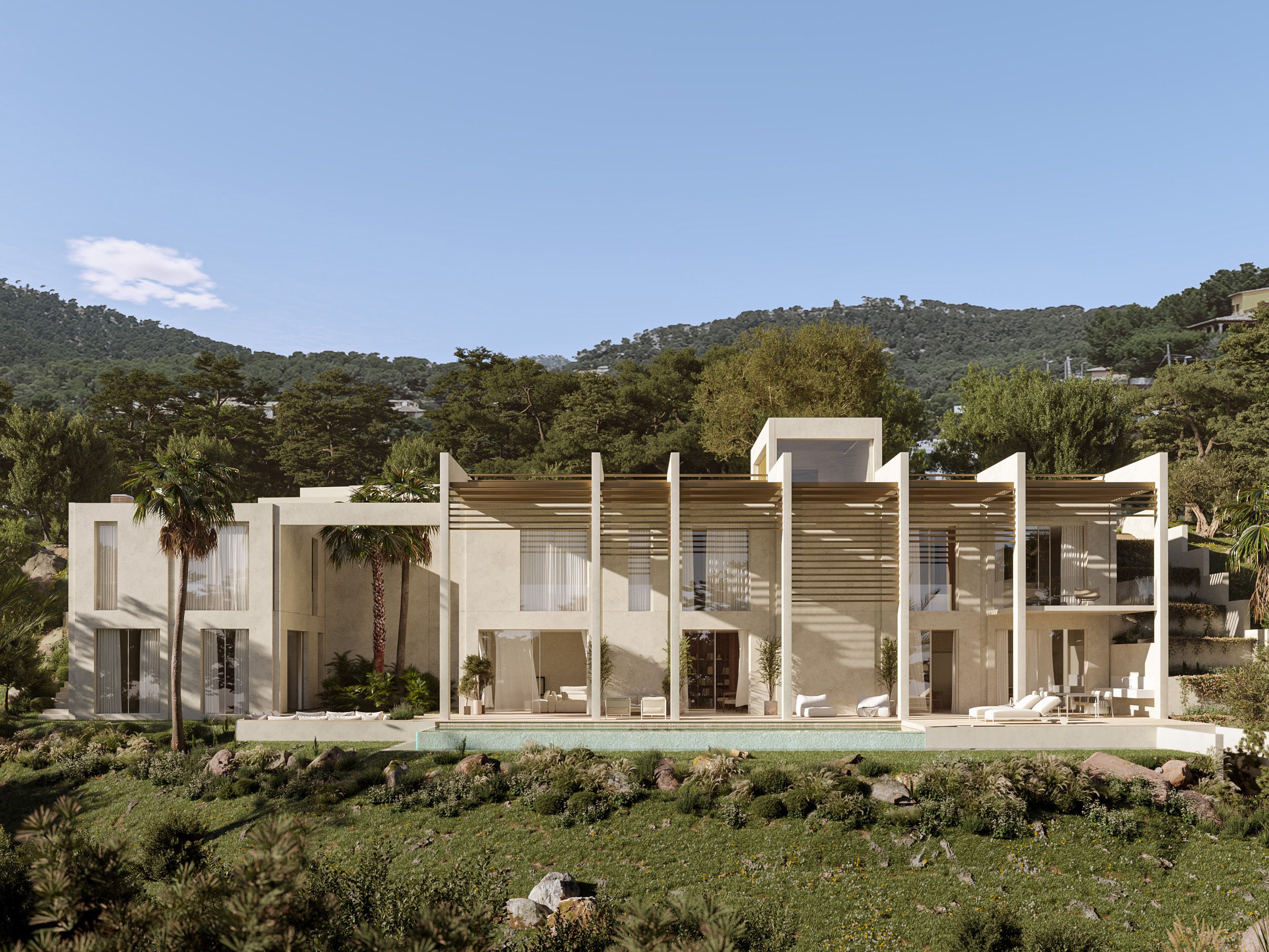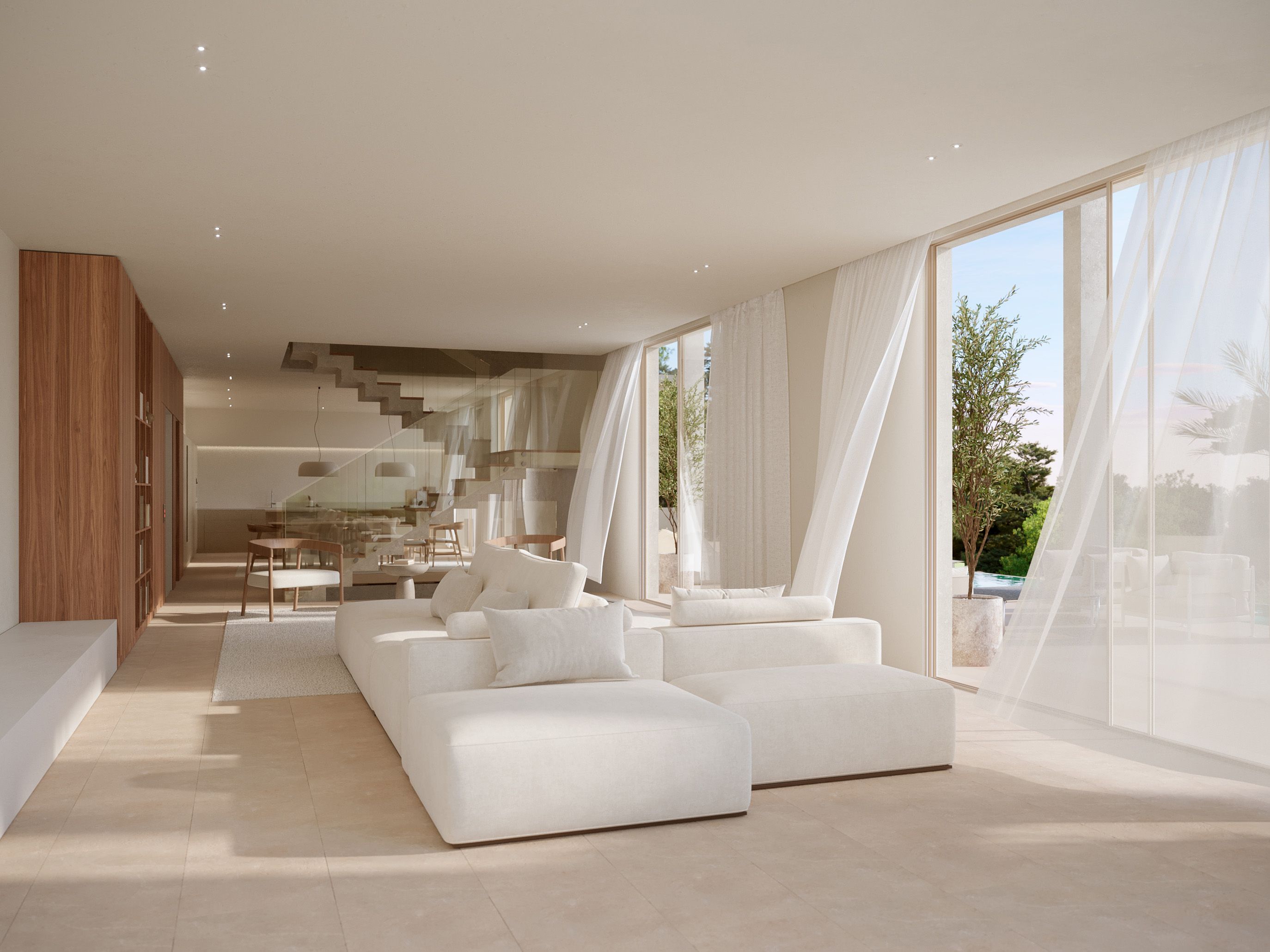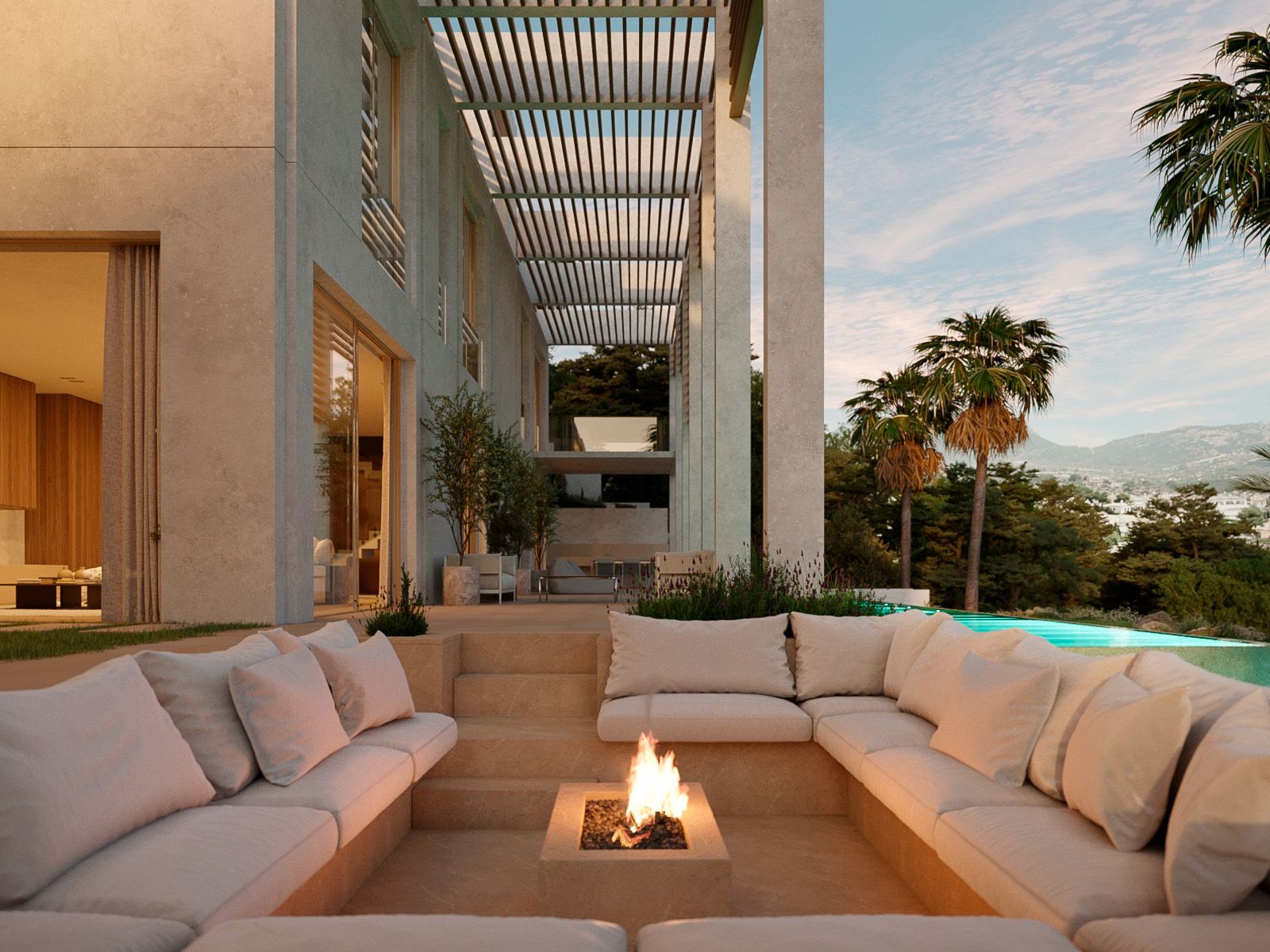 Denne enestående nybyggede villa ligger i et af de mest eksklusive områder i det sydvestlige Mallorca og tilbyder en perfekt kombination af luksus, komfort og privatliv takket være dens design og layout. Det forreste område imponerer med en rummelig indgang med en privat asfalteret indkørsel og parkering til tre køretøjer. En foyer fører til en udvendig trappe, en indvendig trappe og en elevator, der forbinder alle etager. På øverste etage ligger det store soveværelse med et stort en-suite badeværelse, et påklædningsværelse og en privat terrasse, der indbyder til afslapning. Yderligere to soveværelser, hver med eget badeværelse og balkon, tilbyder privatliv og komfort. Derudover er der endnu et gæsteværelse i to etager, som kun er tilgængeligt via en separat trappe. Dette værelse har også sit eget badeværelse og en balkon, hvilket gør det til det perfekte tilflugtssted for gæster. I stueetagen ligger den rummelige stue med tilstødende åbent køkken af det prestigefyldte Bulthaup-mærke, der er udstyret med højkvalitetsapparater fra Gaggenau. Alle værelser har direkte adgang til den delvist overdækkede terrasse, som fører til den elegante swimmingpool og kombinerer maksimal komfort indendørs og udendørs. På denne etage ligger også det nederste niveau af duplex-gæsteværelset med egen stue og spisestue, hvilket giver gæsterne fuldstændig uafhængighed. Vaskeriet og de tekniske rum ligger i kælderen. Yderligere funktioner inkluderer: udendørs bålplads, 4-personers jacuzzi, gårdhave, elevator til alle niveauer, pool på 17 m længde og en ekstern gæstelejlighed.