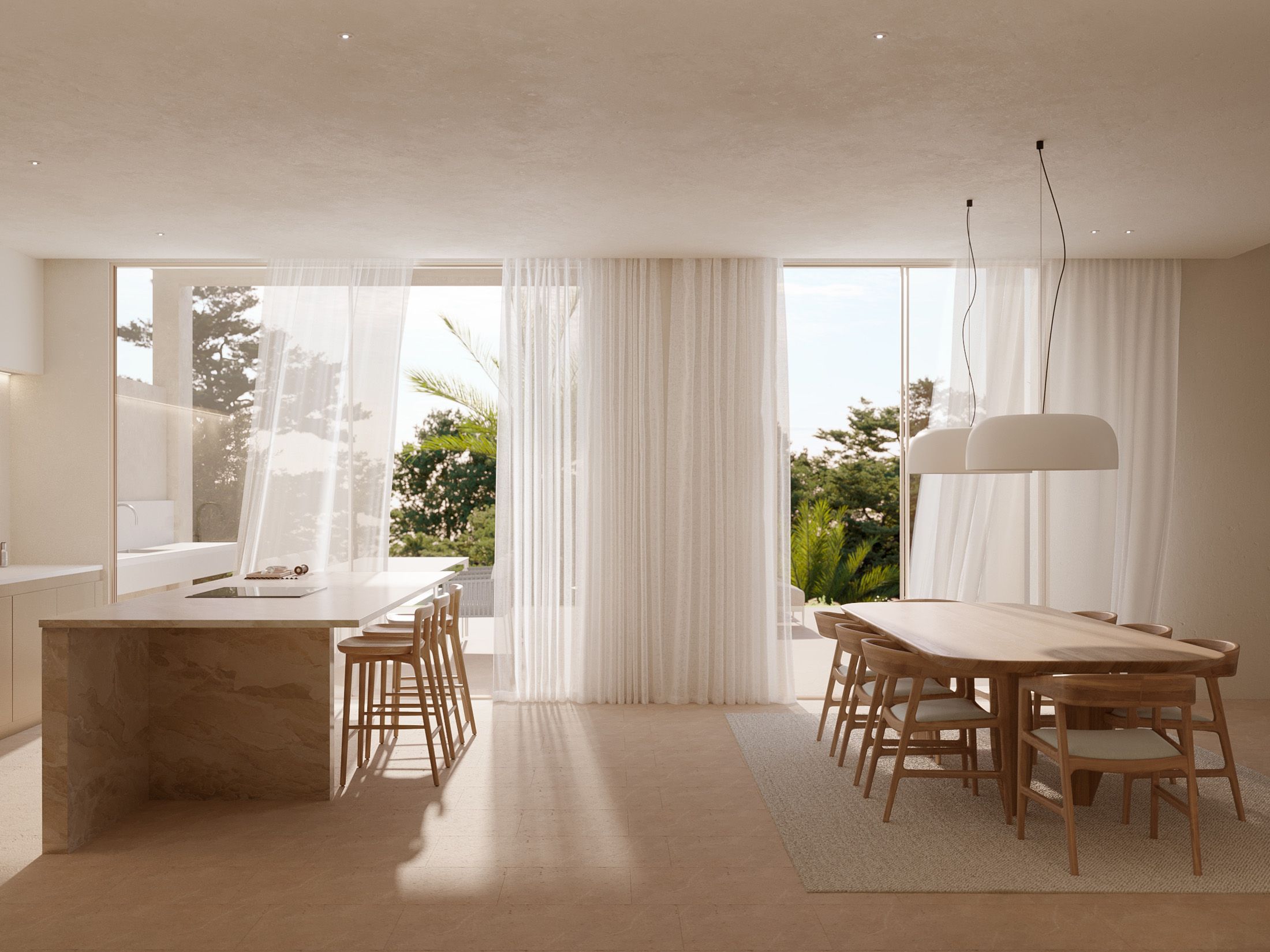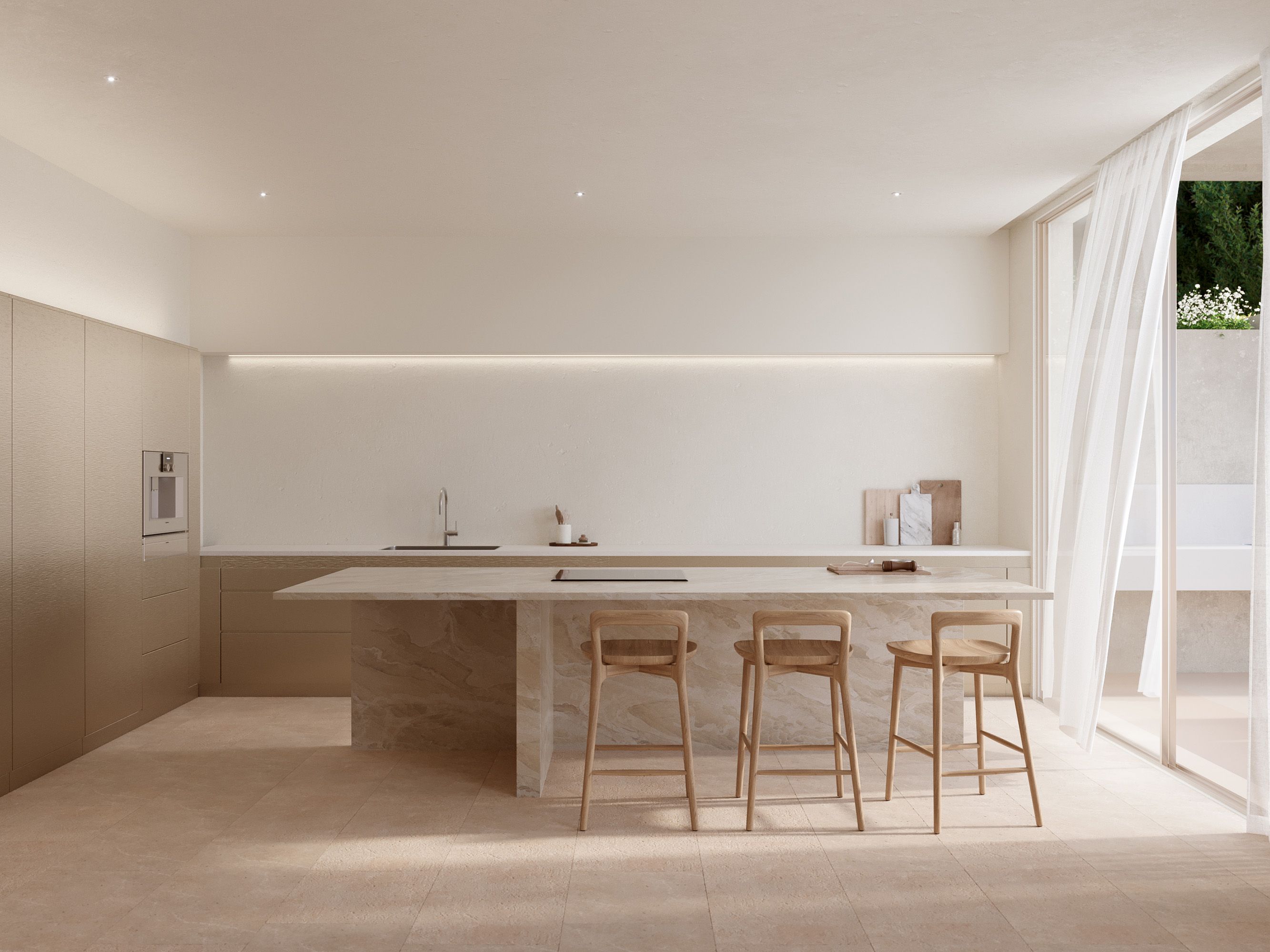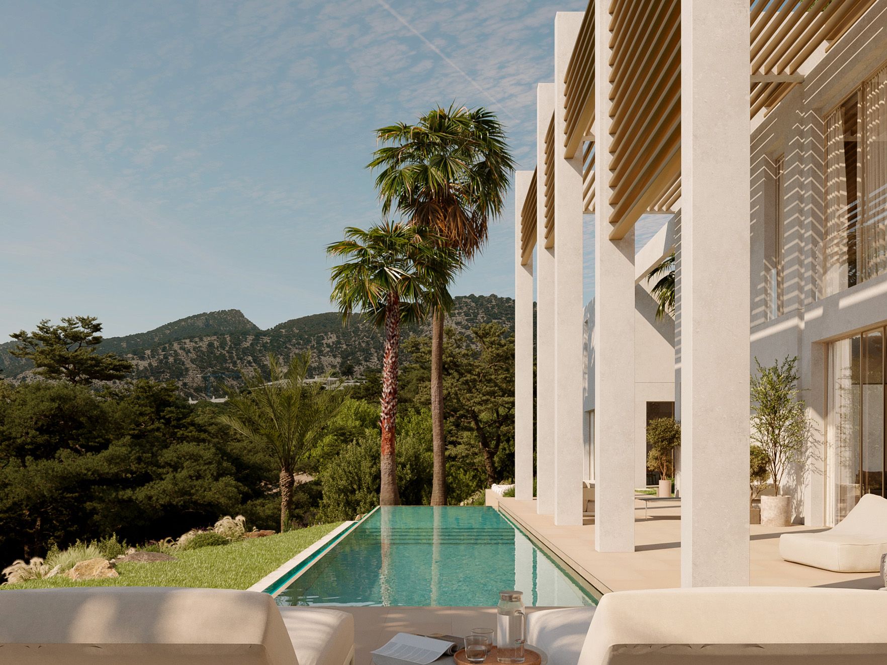 Denne enestående nybyggede villa ligger i et af de mest eksklusive områder i det sydvestlige Mallorca og tilbyder en perfekt kombination af luksus, komfort og privatliv takket være dens design og layout. Det forreste område imponerer med en rummelig indgang med en privat asfalteret indkørsel og parkering til tre køretøjer. En foyer fører til en udvendig trappe, en indvendig trappe og en elevator, der forbinder alle etager. På øverste etage ligger det store soveværelse med et stort en-suite badeværelse, et påklædningsværelse og en privat terrasse, der indbyder til afslapning. Yderligere to soveværelser, hver med eget badeværelse og balkon, tilbyder privatliv og komfort. Derudover er der endnu et gæsteværelse i to etager, som kun er tilgængeligt via en separat trappe. Dette værelse har også sit eget badeværelse og en balkon, hvilket gør det til det perfekte tilflugtssted for gæster. I stueetagen ligger den rummelige stue med tilstødende åbent køkken af det prestigefyldte Bulthaup-mærke, der er udstyret med højkvalitetsapparater fra Gaggenau. Alle værelser har direkte adgang til den delvist overdækkede terrasse, som fører til den elegante swimmingpool og kombinerer maksimal komfort indendørs og udendørs. På denne etage ligger også det nederste niveau af duplex-gæsteværelset med egen stue og spisestue, hvilket giver gæsterne fuldstændig uafhængighed. Vaskeriet og de tekniske rum ligger i kælderen. Yderligere funktioner inkluderer: udendørs bålplads, 4-personers jacuzzi, gårdhave, elevator til alle niveauer, pool på 17 m længde og en ekstern gæstelejlighed.