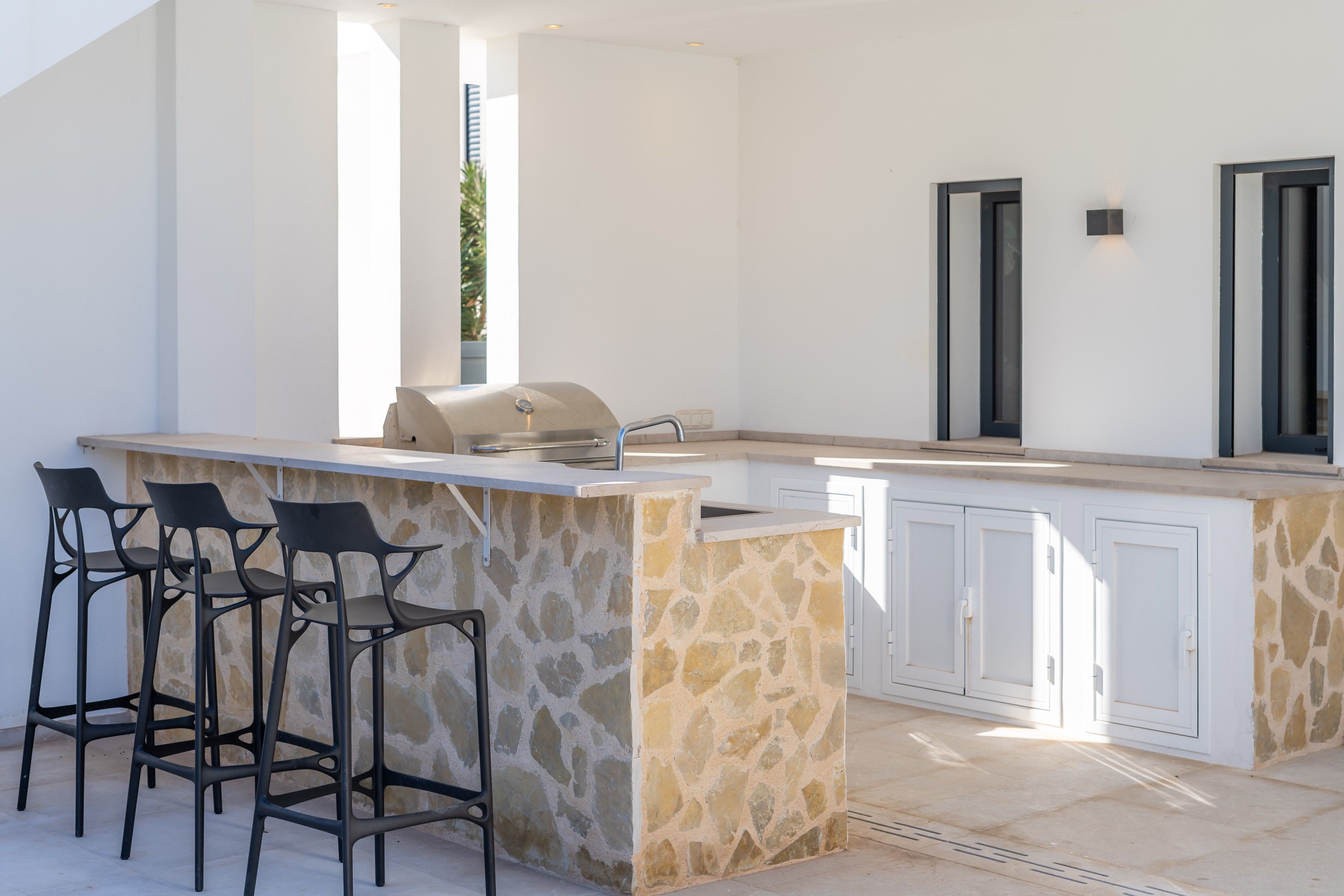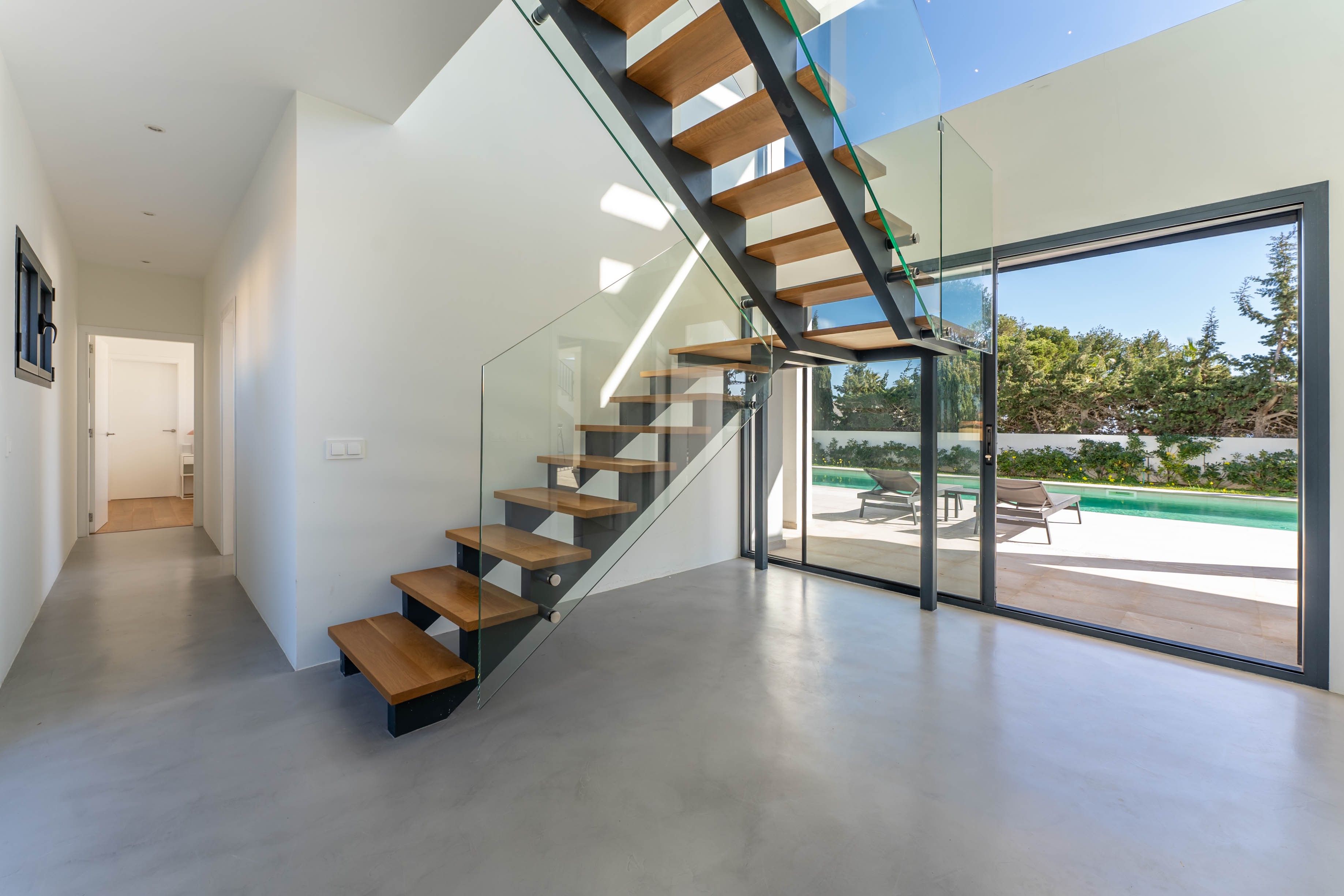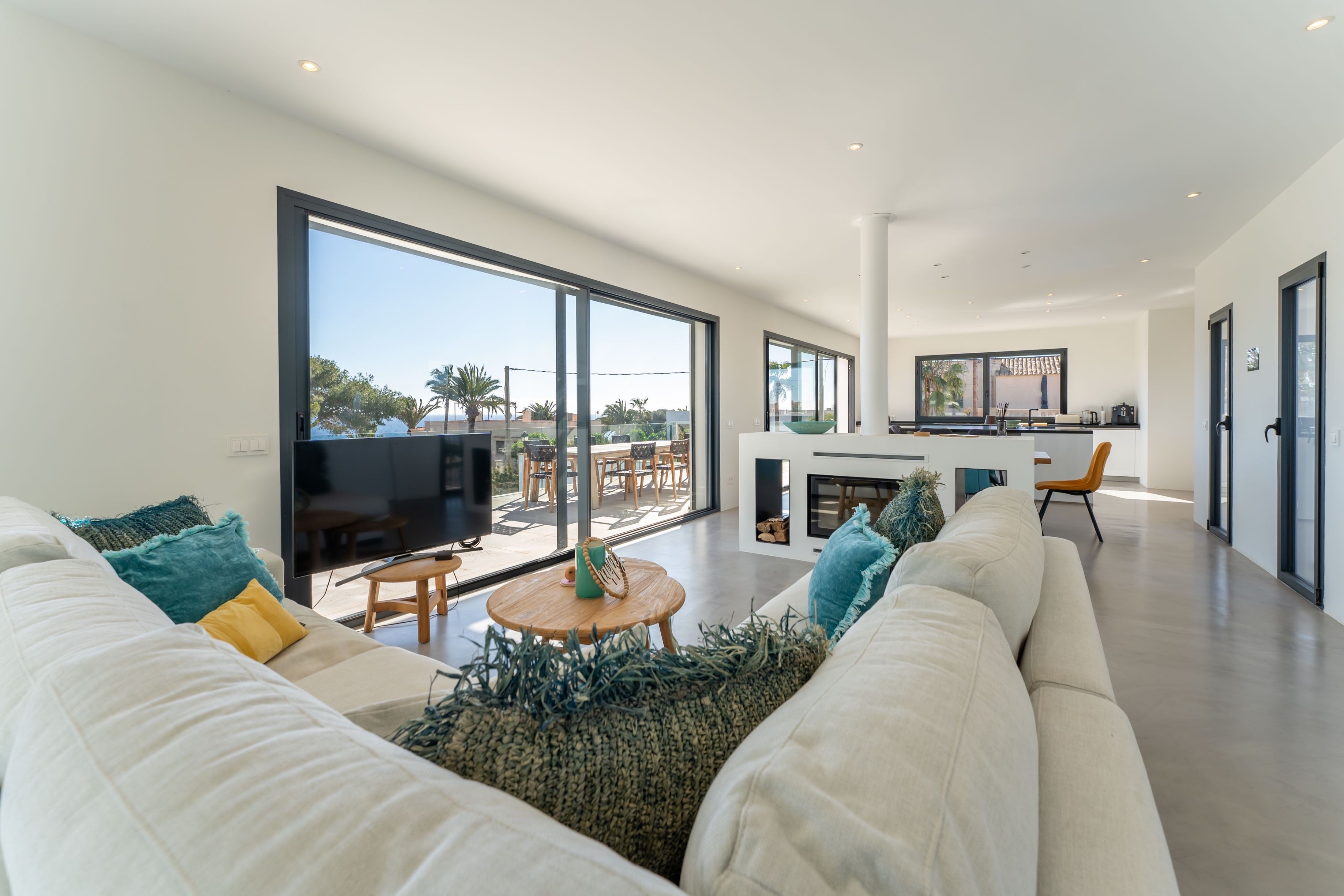 Denne moderne villa ligger på en 600 m² stor grund i Cala Llombards, og boligarealet på 280 m² er fordelt på to etager. Vinduer fra gulv til loft og store vinduesfronter lukker masser af naturligt lys ind og åbner op for en imponerende udsigt over havet. Huset ligger i et meget roligt kvarter og har alligevel fremragende forbindelser. Cala Llombards-bugten ligger kun 8 minutters gang væk, mens den maleriske Cala des Moro og S'Almunia kan nås til fods på ca. 25 minutter. Supermarkedet og de to restauranter i Cala Llombards kan nås til fods på 10 minutter. I stueetagen er der tre moderne, lyse soveværelser med eget badeværelse, alle med direkte adgang til haven. Det åbne opholds- og spiseområde med elegant pejs venter på dig på øverste etage. Det tilstødende, veludstyrede køkken med fryser og vinkøleskab giver ikke kun masser af plads, men også direkte adgang til den rummelige balkonterrasse. Det store soveværelse med eget badeværelse ligger også på øverste etage, hvorfra man også har adgang til balkonterrassen. En udvendig trappe fører til tagterrassen med 360° udsigt over det charmerende landskab og havet - det perfekte sted til en sundowner. Der er også solpaneler her, som sikrer en bæredygtig energiforsyning. Haven i middelhavsstil indbyder til afslapning med en 15 meter lang, opvarmet pool og en velplejet græsplæne. En terrasse med grillplads afrunder udendørsområdet. En garage med plads til et køretøj fuldender tilbuddet. Et centralt klimaanlæg og gulvvarme i hele huset sikrer maksimal boligkomfort og behagelige temperaturer året rundt. Denne eksklusive villa kombinerer moderne design med middelhavscharme og tilbyder maksimal boligkomfort på et af de mest eftertragtede steder på Mallorca. Ejendommen vil være tilgængelig igen fra november 2025.