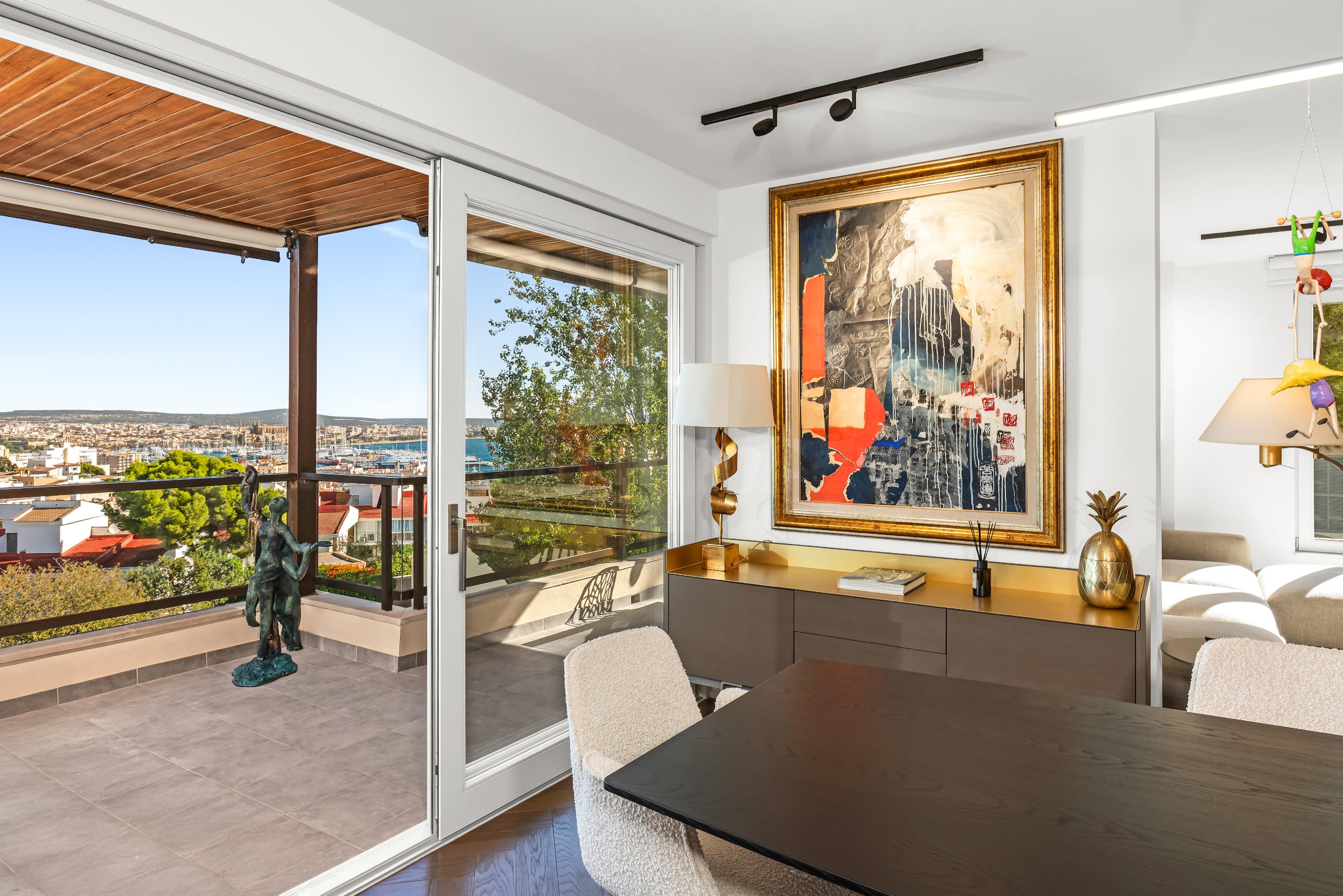 Lejlighed på 180 m², med en rummelig og moderne fordeling, opdelt i dag- og natområder for større komfort. Hovedområdet består af en lys stue-spisestue med direkte adgang til en terrasse med panoramaudsigt over Castillo de Bellver, katedralen og havnen. Køkkenet, der er integreret, men visuelt uafhængigt, har forbindelse til den anden terrasse, der vender ud mod havet.
