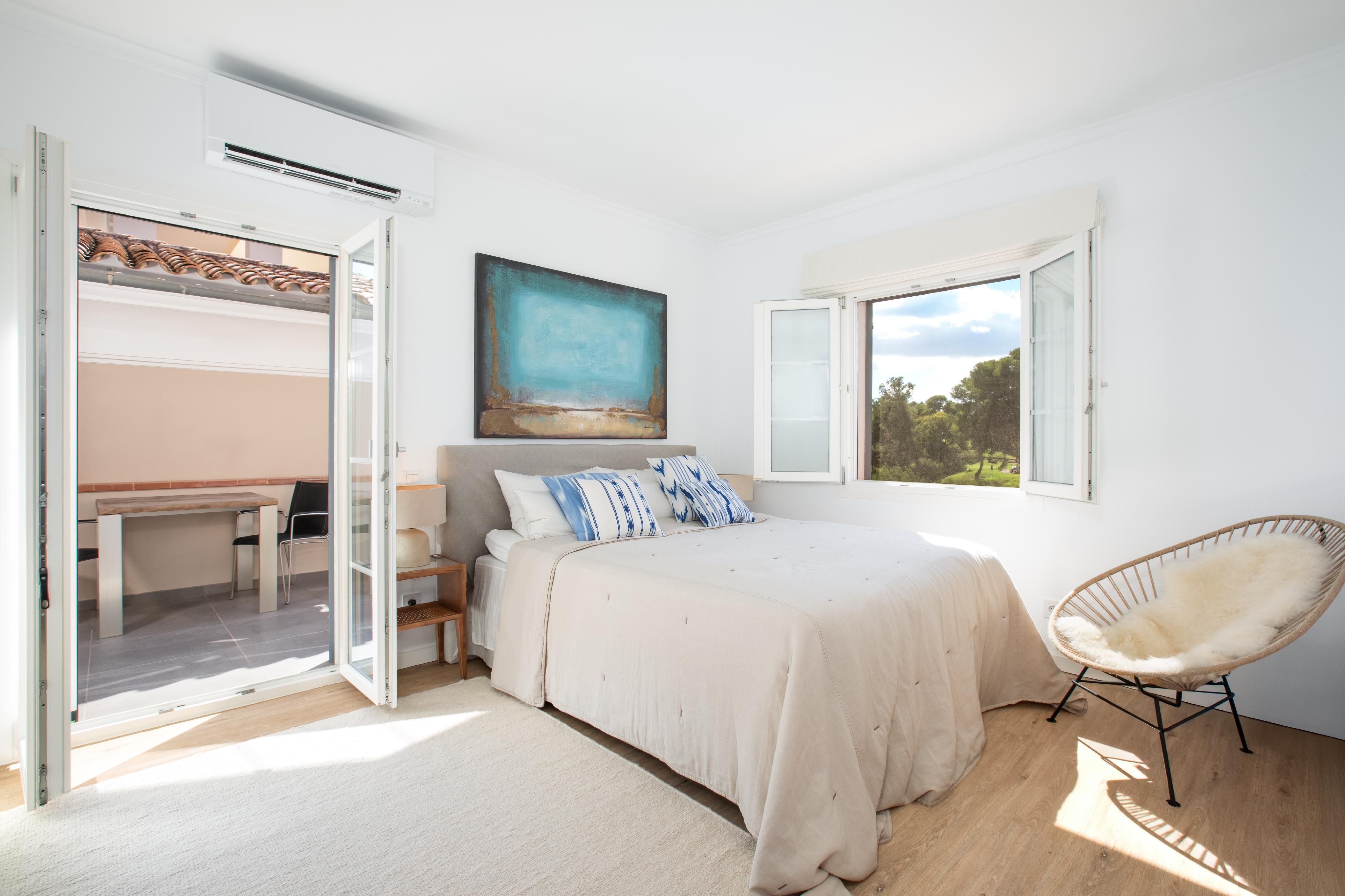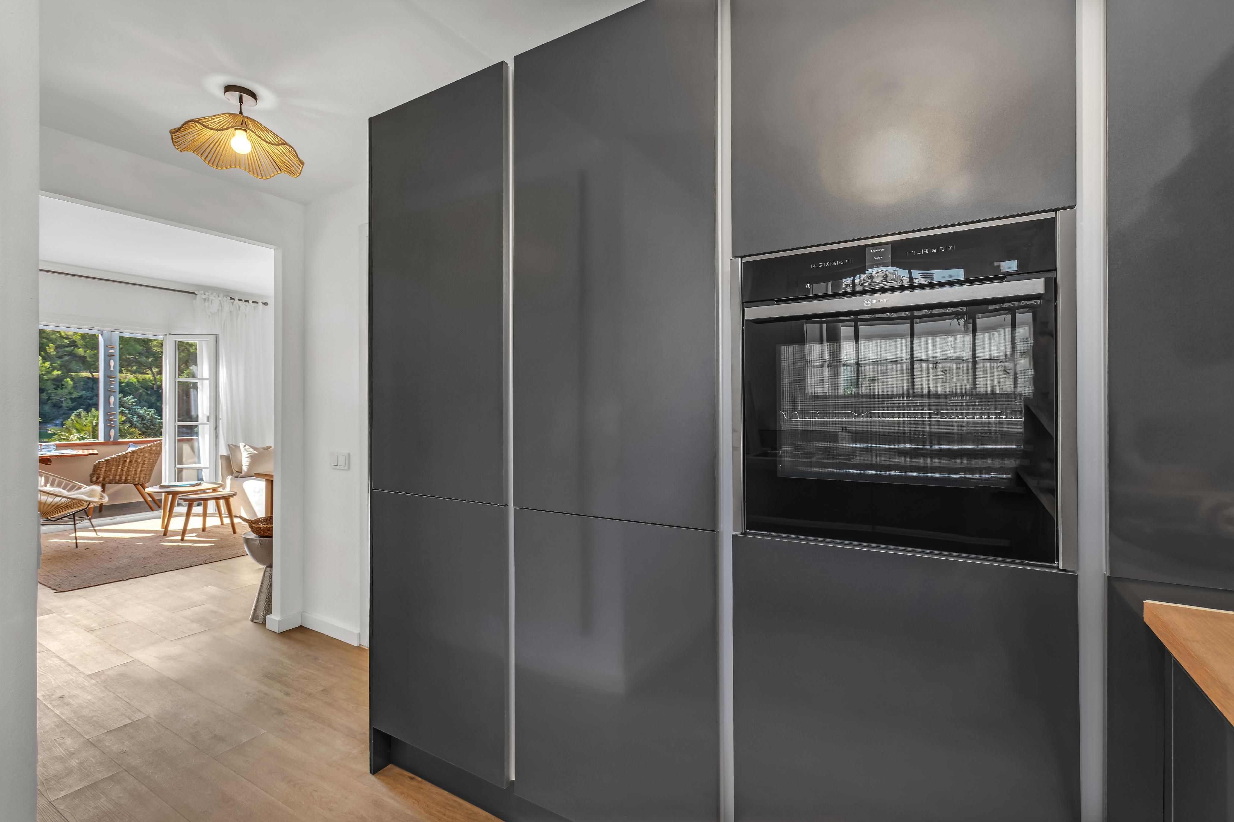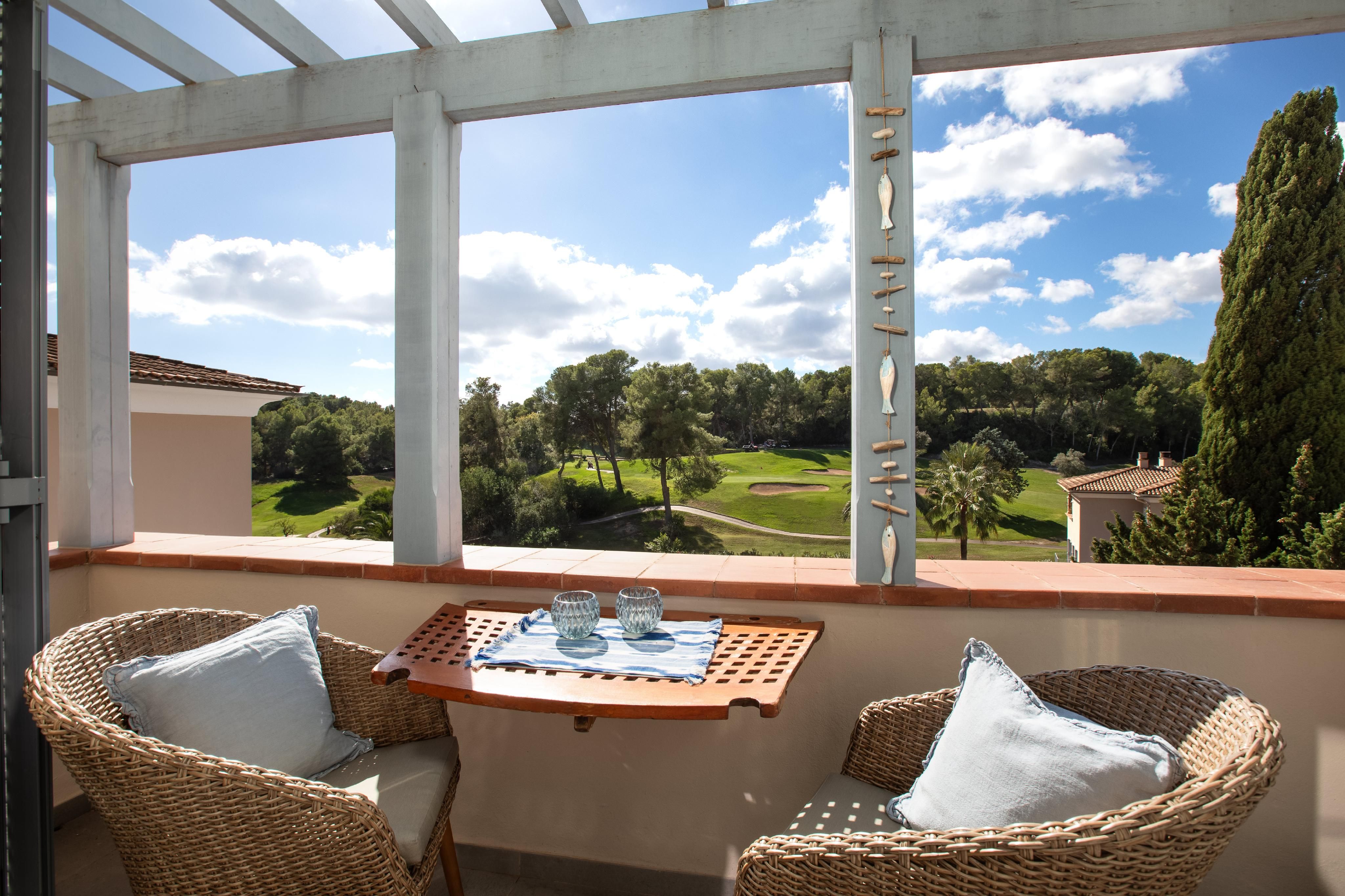 Denne renoverede lejlighed kombinerer stilfuld bolig med ro og en god atmosfære. Så snart du træder ind, kan du mærke den særlige omhu, der er lagt i hver eneste detalje - et sted, hvor du straks ankommer og føler dig helt hjemme. Lejligheden ligger på øverste etage og byder på et lyst soveværelse, et moderne badeværelse med gulvvarme og et åbent, elegant og lyst køkken, der kombinerer design og funktion på perfekt vis. Fra opholdsstuen er der udgang til en hyggelig balkon og en rummelig terrasse med storslået udsigt over de grønne områder og golfbanen - ideelt til at nyde freden og solskinnet i fulde drag. Der er en underjordisk parkeringsplads, et praktisk opbevaringsrum og moderne aircondition (varm/kold), som sikrer et behageligt indeklima hele året rundt. Lejligheden ligger også meget tæt på Puerto Portals, en af de mest eksklusive havne på øen, med elegante butikker, restauranter og en særlig middelhavsflair. Denne lejlighed er den perfekte kombination af stil, komfort og beliggenhed - et vidunderligt gemmested til forlængede weekender, et andet hjem eller som en stabil investering.