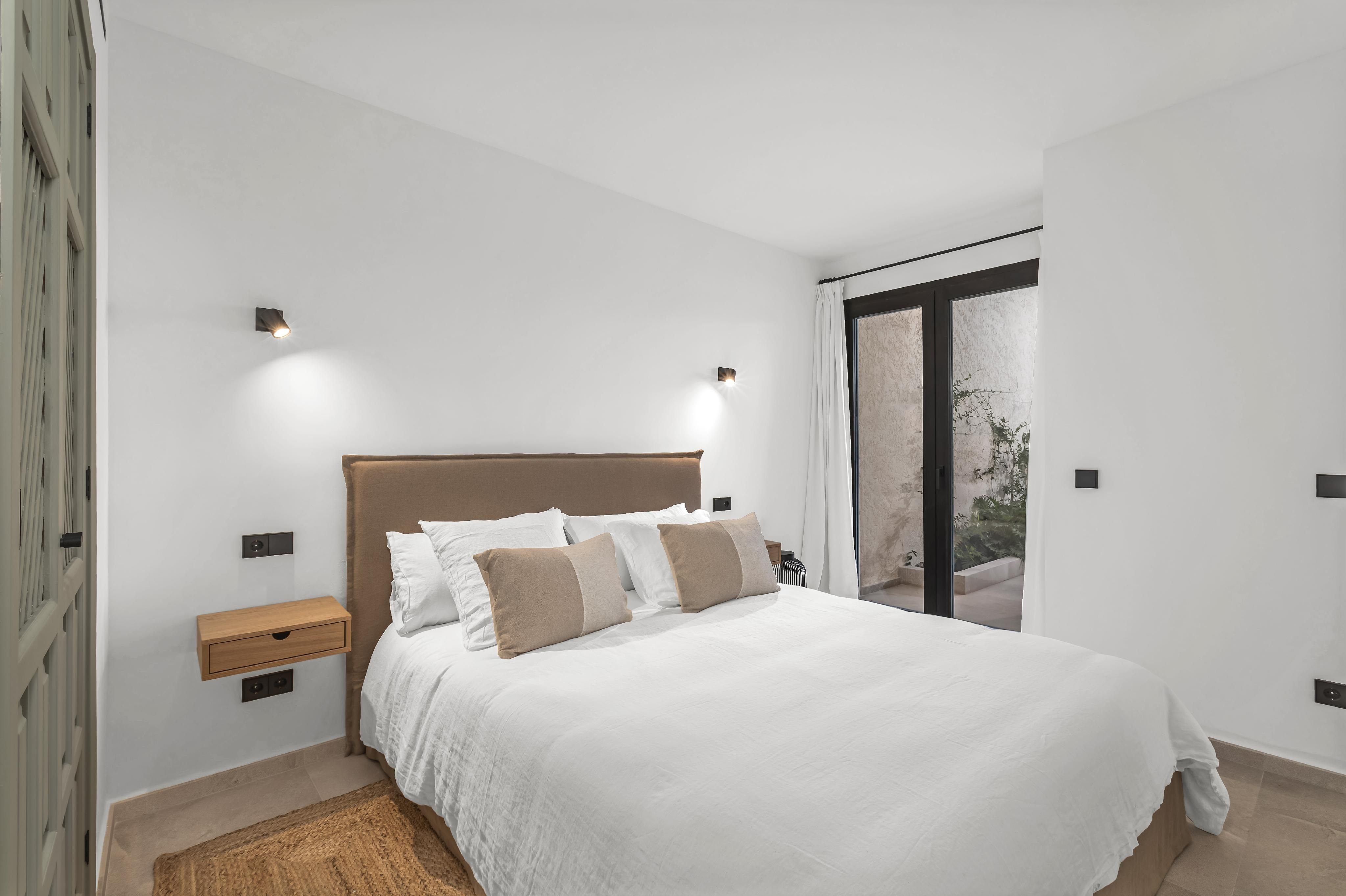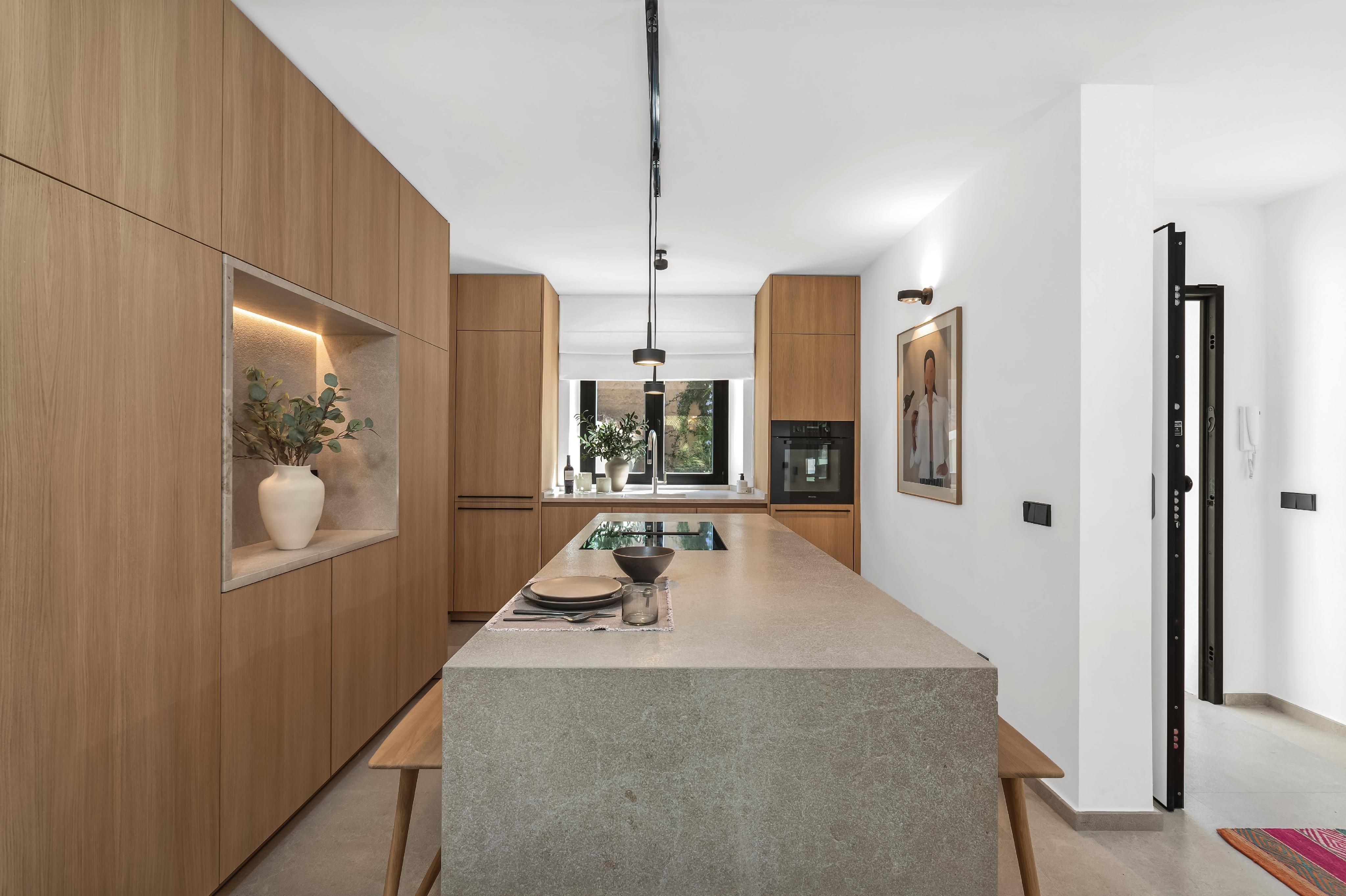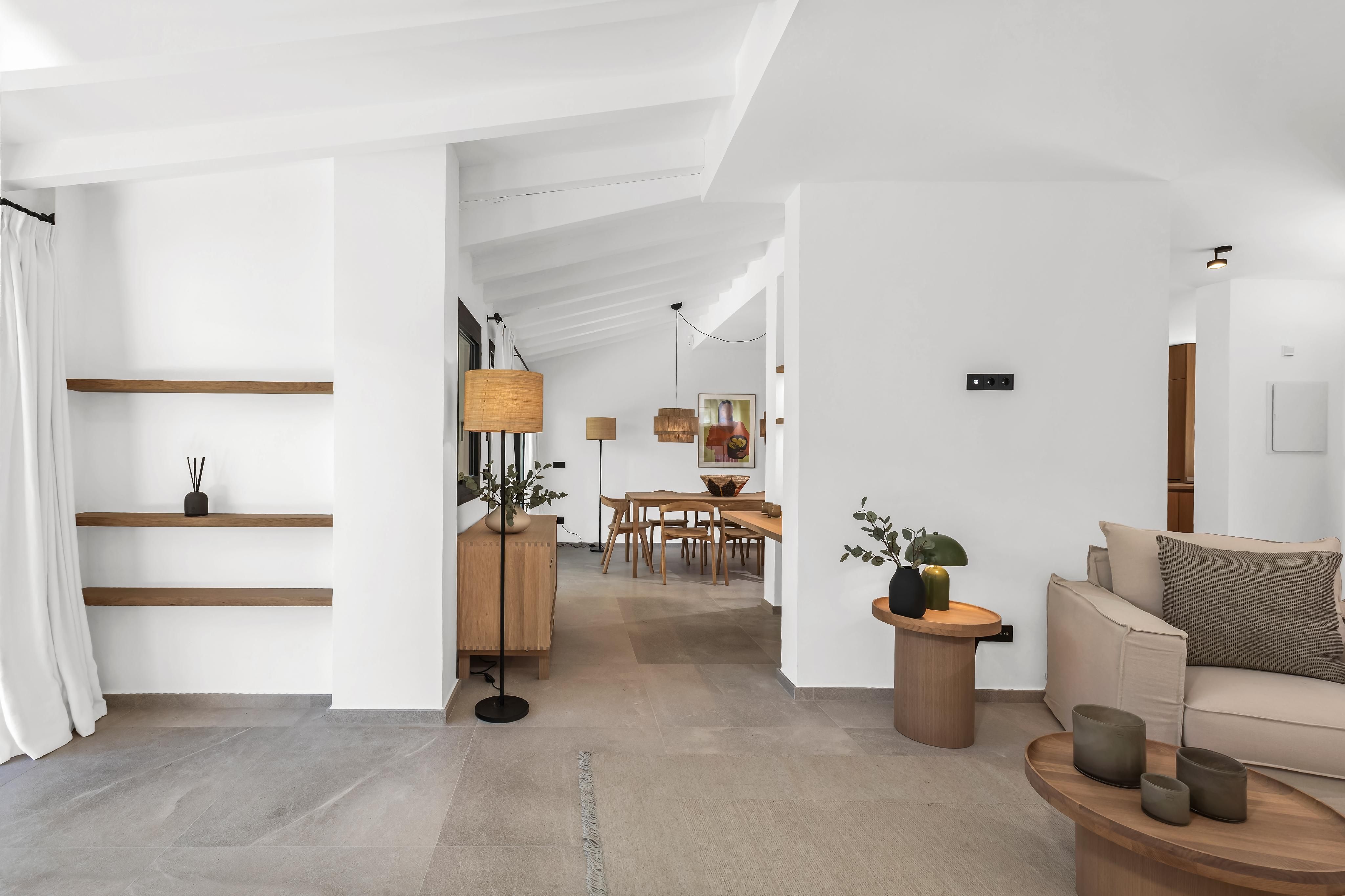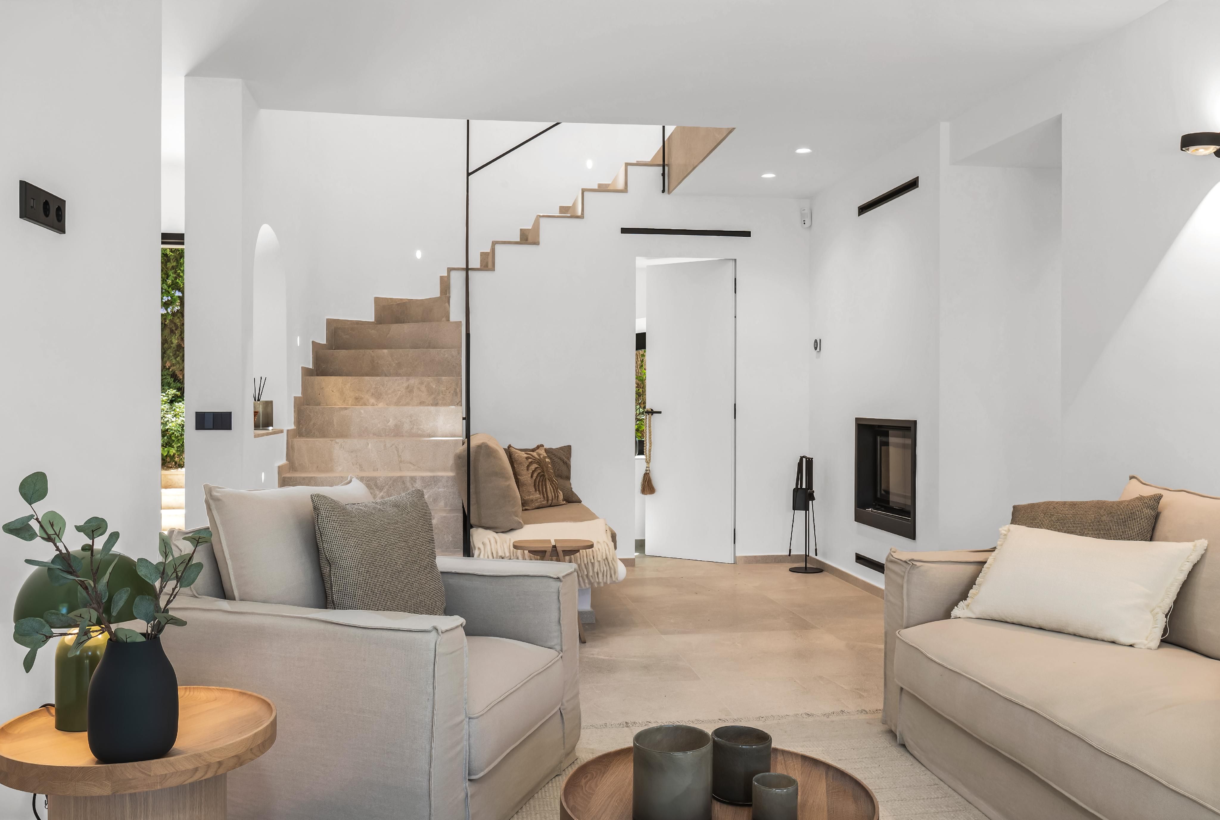 Dette udsøgt renoverede dobbelthus ligger i et eksklusivt boligkompleks i det meget eftertragtede område Bendinat Golf. Ejendommen er designet med en perfekt blanding af moderne stil og finish af høj kvalitet og kan prale af en lys, åben planløsning og en sofistikeret atmosfære, der imponerer fra første øjeblik. Villaen er fordelt på to niveauer. Stueetagen har et indbydende åbent køkken med Miele-apparater af høj kvalitet, en elegant opholds- og spiseplads med brændeovn, et gæstetoilet og to soveværelser, det ene med en-suite badeværelse og det andet med separat badeværelse. Store glasdøre gennemstrømmer interiøret med naturligt lys og fører direkte ud i den private have, hvor et grillområde og en solbeskinnet terrasse giver den perfekte baggrund for at nyde middelhavsstilen. På øverste etage tilbyder master-suiten et privat fristed, komplet med et luksuriøst en-suite badeværelse og direkte adgang til en rummelig terrasse. Der er kælet for detaljerne i hele ejendommen: Naturstensgulve, Occhio-belysning og Dornbracht-armaturer giver tidløs elegance og kvalitet. Komforten sikres af gulvvarme og aircondition i hele huset, der drives af et moderne varmepumpesystem, mens en separat varmepumpe med vandcirkulation sikrer øjeblikkeligt varmt vand. Yderligere funktioner omfatter indbyggede skabe, et dedikeret vaskeri og bryggers, rigelig opbevaringsplads, et alarmsystem og praktisk garageparkering. Beboerne i dette prestigefyldte kompleks har også adgang til en smukt vedligeholdt fælles pool, det ideelle sted at køle af i de varme mallorcinske somre. Dette er virkelig en drømmeejendom, der tilbyder den perfekte kombination af elegance, komfort og funktionalitet i et af Mallorcas mest eksklusive boligområder. Den er ideel både som helårsbolig og som et sofistikeret feriested.