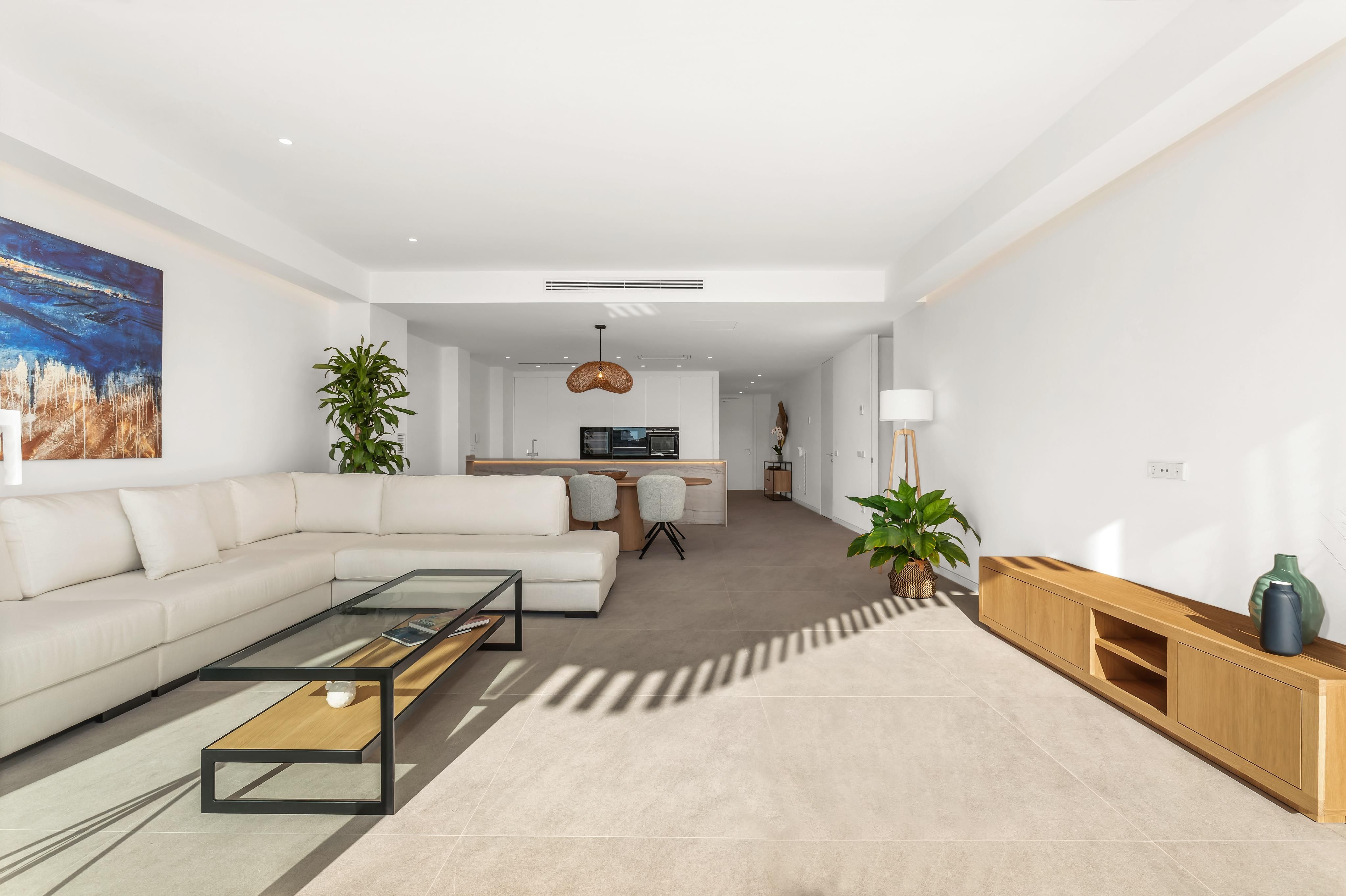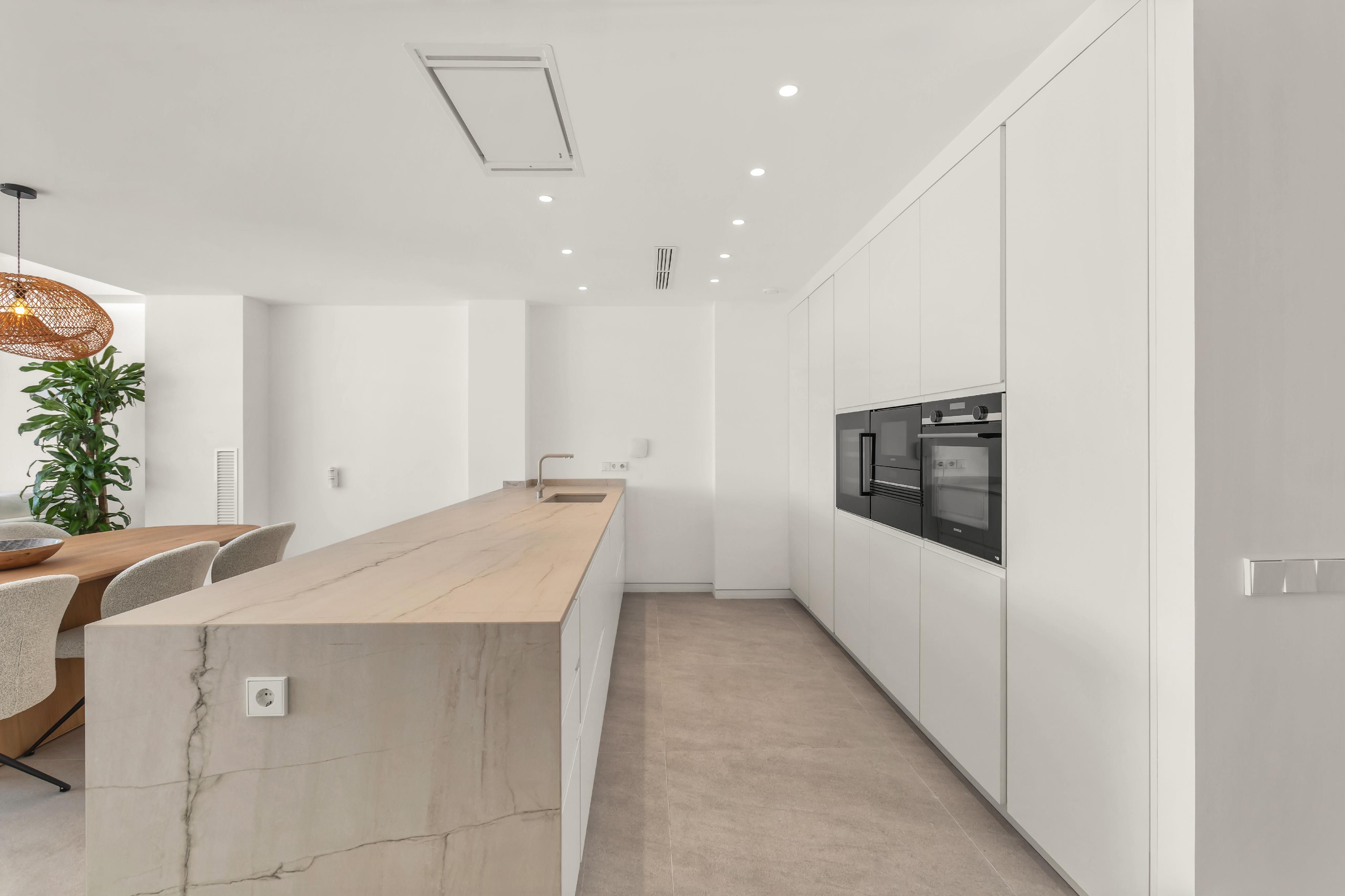 160 m² totalrenoveret lejlighed, designet med en funktionel og moderne fordeling, der favoriserer rummelighed, lysstyrke og forbindelse til udendørsarealerne. Hovedområdet består af en rummelig stue-spisestue på 60 m², der er integreret med et moderne åbent køkken, udstyret med topmoderne Siemens-apparater og innovative teknologier som usynlig induktion og vandrensningssystemer. Dette rum åbner direkte ud til de private terrasser, som tilsammen dækker 57 m² og giver dig mulighed for at nyde middelhavsklimaet hele året rundt. Lejligheden har tre soveværelser, hvoraf to har udsigt, og tre komplette badeværelser, hvoraf det ene er en suite. Alle materialer er udvalgt efter strenge kvalitetskriterier: gulve af porcelænsstentøj i stort format, indvendigt snedkerarbejde med usynlige hængsler, oplyste indbyggede skabe og udvendigt PVC-snedkerarbejde med motoriserede skodder. Dobbeltruder med lav emission og gasfyldning garanterer fremragende termisk og akustisk isolering. Med hensyn til komfort har ejendommen et meget effektivt aerotermisk system til aircondition og varmt vand, et kanaliseret airconditionsystem og et mekanisk ventilationssystem, der sikrer effektivitet og velvære på alle årstider. Til lejligheden hører også en garageplads og en udendørs parkeringsplads, hvilket er en væsentlig merværdi i området.