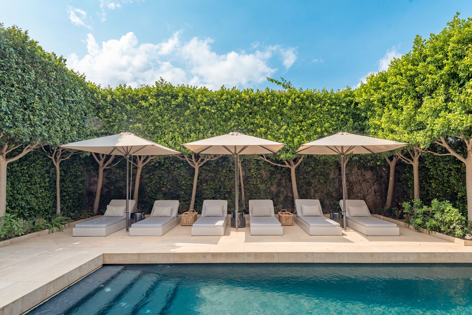 Skydedøre fører til en privat oase: en rolig gårdhave med en elegant pool, omgivet af frodigt grønt og flere loungeområder. På øverste etage er der en rummelig balkon, hvor man kan trække sig tilbage med en storslået udsigt over Tramuntana-bjergene, mens underetagen huser et andet opholds- og underholdningsområde - ideelt til afslapning eller gæster.