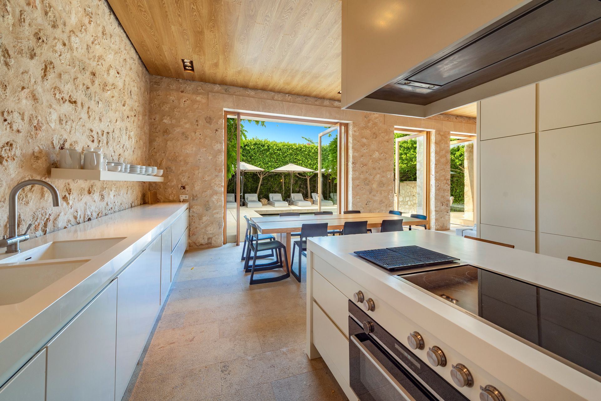 I hjertet af huset er der et åbent opholdsrum, som imponerer med varme teksturer og naturligt lys. Stenvægge, træbeklædte lofter og vinduer fra gulv til loft udvisker grænsen mellem indendørs og udendørs ophold. En skræddersyet, nedsænket lounge og designerbelysning skaber en indbydende atmosfære til afslapning og underholdning.