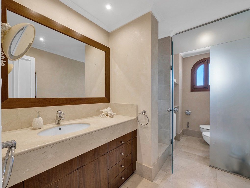 Denne fremragende middelhavsvilla imponerer med sin meget gode beliggenhed på en stor grund, der er ideel til familier. Den kan prale af perfekt solorientering samt høje standarder og meget smagfuld dekoration. Villaen er fordelt på 3 niveauer. Indgangen er i stueetagen, der fører ind i en rummelig gang med et garderobeskab, en lys stue og spiseplads med et køkken og masser af opbevaring. På dette niveau er der også et soveværelse med dobbeltseng ensuite, et gæstetoilet, et vaskerum og et ekstra stuepigesoveværelse med separat indgang. Fra opholdsstuen er der adgang til den store overdækkede terrasse med loungeområde og udendørs spiseplads. Haven har et overdækket grillområde på den ene side og et rummeligt græsplæneområde på den anden, og der er desuden en privat petanquebane på siden af villaen. Få skridt væk finder du en stor swimmingpool med et stort lounge- og solarieområde. Mellemetagen byder på 3 soveværelser, 2 med fælles badeværelse og det store soveværelse ensuite med et stort walk-in closet. Alle 3 soveværelser har en vidunderlig havudsigt. På husets øverste niveau finder du en hyggelig tv-stue, der fører ud til en lille terrasse, og det femte soveværelse med fantastisk havudsigt. Yderligere funktioner: garage med plads til 2 store biler, aircondition h/c, sauna, vinkælder, indbyggede skabe, stor pool, alarmsystem og automatisk vandingssystem.