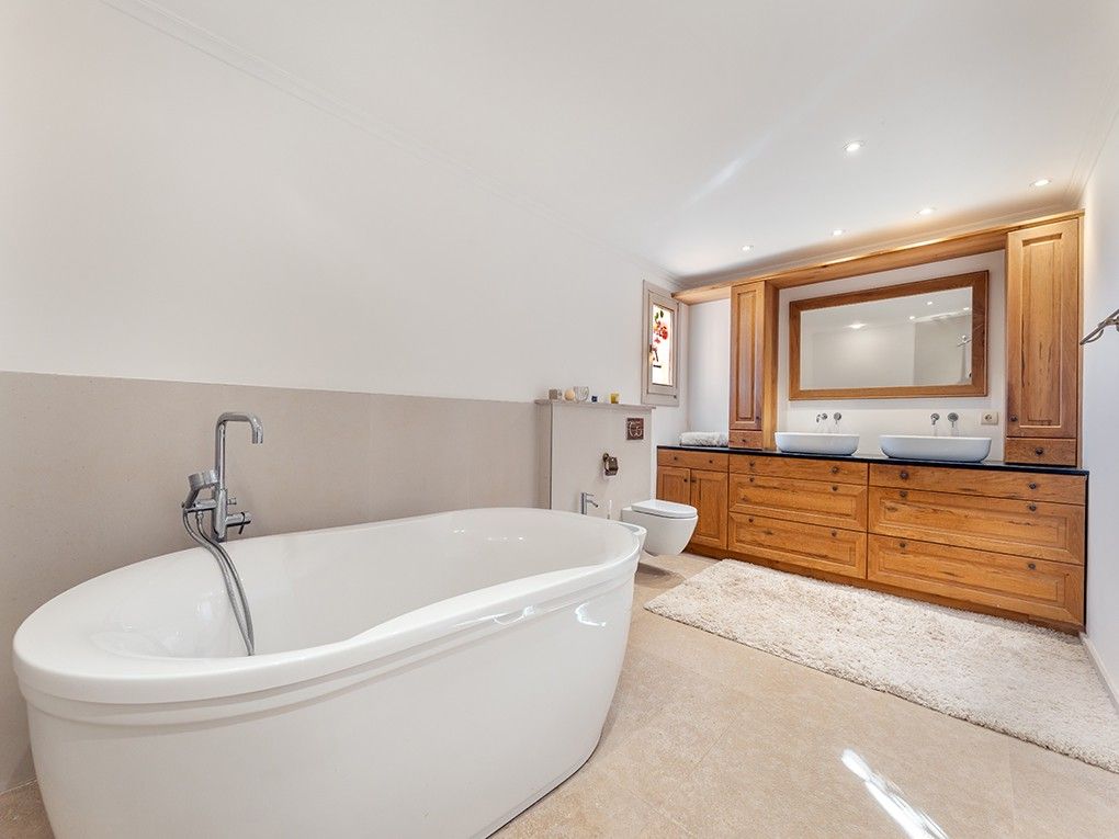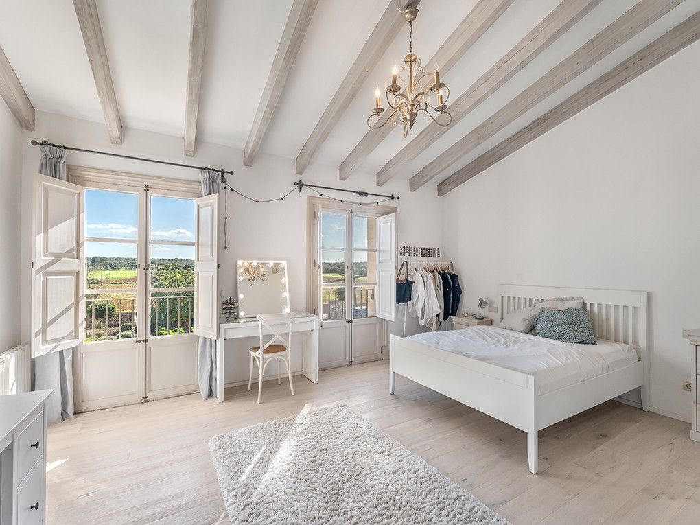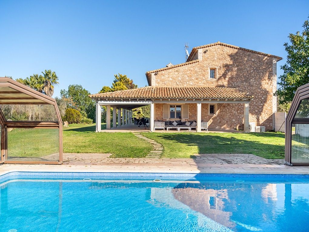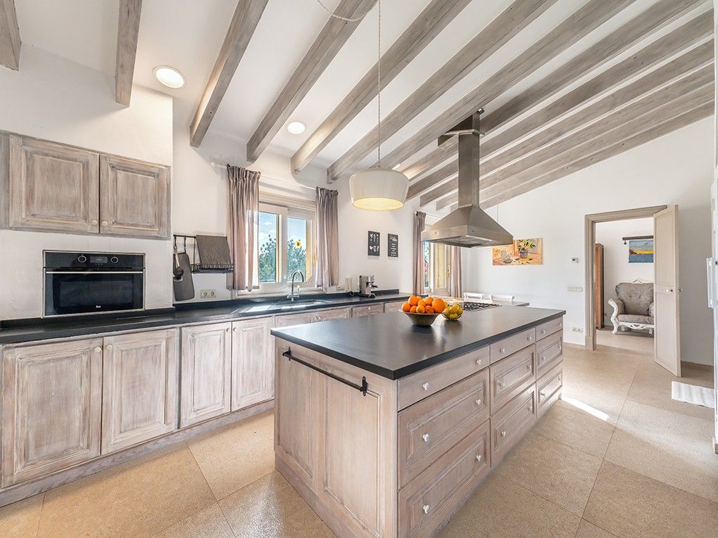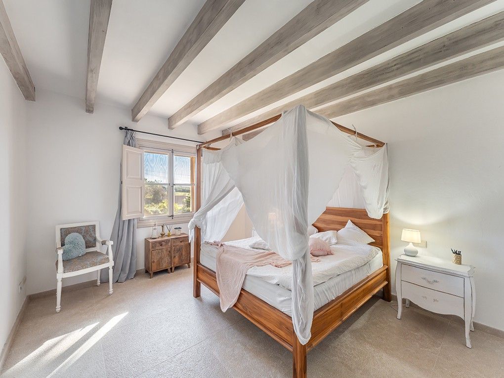 Denne imponerende landvilla ligger på en grund på ca. 48.000 m² på en blid skråning mellem Santanyi og Campos og byder på absolut privatliv og en spektakulær udsigt over den omkringliggende natur. Ejendommen imponerer med sin stilfulde naturstensfacade, som falder harmonisk ind i middelhavslandskabet med palmer og typiske planter. På første sal finder du en rummelig, lys opholdsstue med pejs, hvis høje lofter og træbjælker giver rummet en charmerende, mallorcinsk atmosfære. Herfra er der adgang til den overdækkede terrasse, hvorfra man kan nyde den imponerende udsigt over olivenlunden og landskabet. Lige ved siden af ligger det fuldt udstyrede køkken med endnu en pejs og et praktisk bryggers. Det store soveværelse i husets venstre fløj er generøst og har et påklædningsværelse og et luksuriøst badeværelse med fritstående badekar. Der er også to andre soveværelser, som deler et badeværelse. På øverste etage er der yderligere tre soveværelser, hver med sit eget badeværelse, hvilket sikrer maksimal komfort. Hovedhuset blev gennemgribende renoveret for omkring tre år siden og kombinerer modernitet med traditionelle elementer, som f.eks. de elegante naturstensgulve og parketgulve. På østsiden af ejendommen ligger et separat gæstehus med stue, soveværelse og badeværelse, ideelt til besøgende eller som et selvstændigt opholdsrum. Den omfattende middelhavshave imponerer med en række frugttræer, herunder appelsin-, citron-, figen- og granatæbletræer, samt velplejede grøntsagsplantager, som understreger fincaens landlige charme. Den 50 m² store saltvandspool har en glasoverdækning, der kan lukkes efter behov. Tæt på poolen er der et lille wellness-område med jacuzzi og badeværelse. Et andet højdepunkt er den omfattende olivenplantage med mere end 600 træer, som gør det muligt for ejendommen at producere sin egen olivenolie af høj kvalitet. I gode år kan man producere op til 2000 liter D.O. olivenolie med D.O.-segl. Yderligere komfort leveres af gulvvarmen på første sal og centralvarmen på øverste etage, som sikrer et behageligt indeklima. Ejendommen har også en kælder og en underjordisk garage. Fincaen har licens til ferieudlejning for op til 10 personer, hvilket giver yderligere indtægtsmuligheder. Denne ejendom er det perfekte tilflugtssted for alle dem, der ønsker at opleve det autentiske mallorcinske liv midt i naturen og i absolut ro.