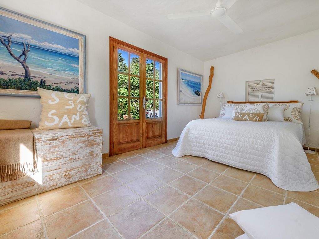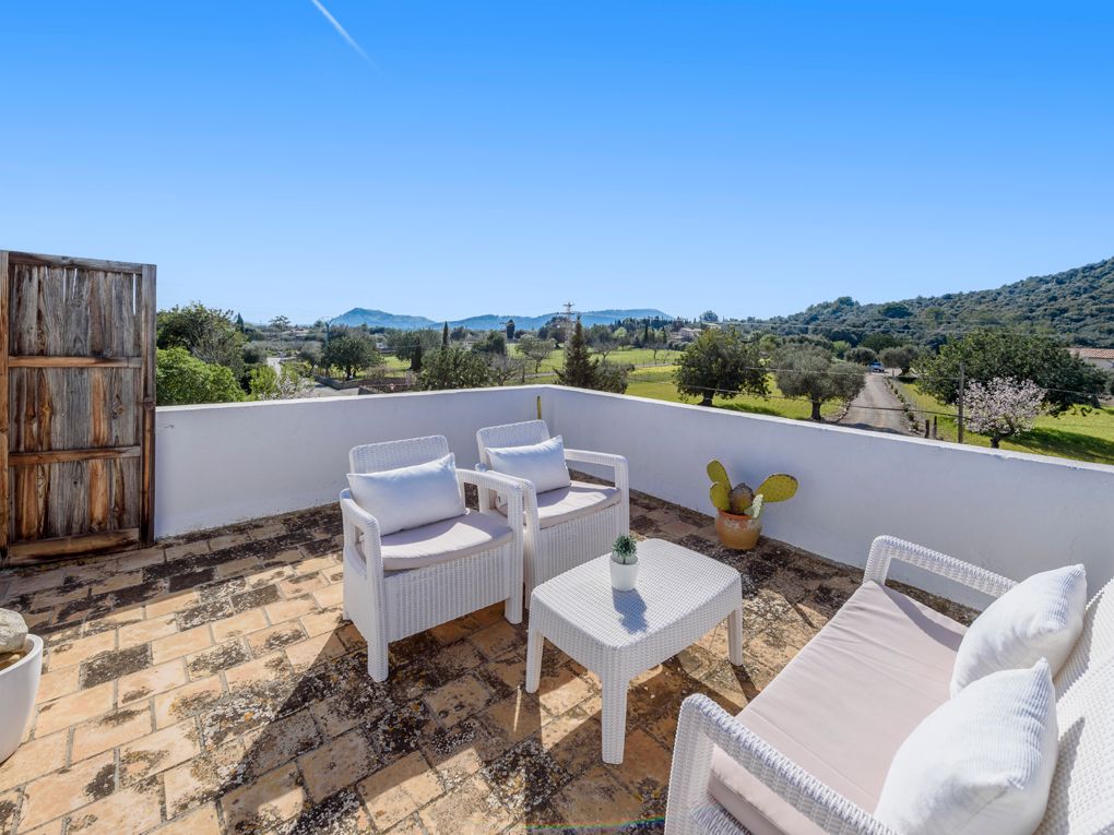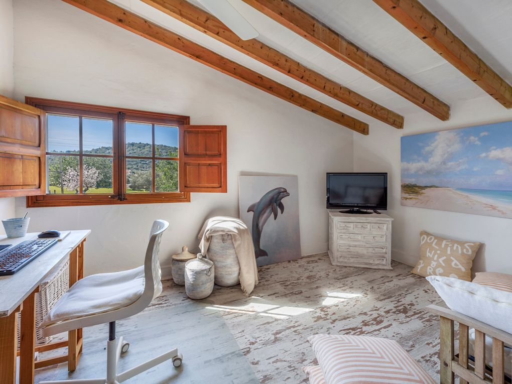 Ovenpå er der to soveværelser med dobbeltsenge med store vinduer og dejlig udsigt, et kontor (eller yderligere et soveværelse) og en walk-in-garderobe plus adgang til en rummelig tagterrasse, et glimt af havet og en dejlig udsigt over landskabet mod Pollensa.