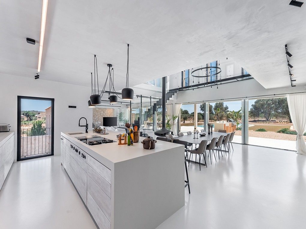 Denne nybyggede finca i hjertet af Mallorca, bygget i 2024, tilbyder en bæredygtig og selvforsynende livsstil. Den er udstyret med topmoderne husteknologi, herunder et solcelleanlæg med en effekt på ca. 60 kWp og batterier med en kapacitet på ca. 120 kWh, egen brønd, vandtanke med en kapacitet på mere end 80.000 liter og et automatisk vandingssystem. Et intelligent ventilationssystem sikrer et behageligt indeklima, og gården er tilsluttet både det offentlige elnet og en smart energiforsyning. Interiøret imponerer med sin industrielle stil, en svævende pejs i stuen og et moderne køkken med ø. Der er fem soveværelser med hver sit badeværelse, og det store soveværelse har balkon. En varmepumpe sørger for varmt vand og gulvvarme, og central aircondition sikrer komfort året rundt. Haven i middelhavsstil med udekøkken, terrasser og en 6,20 x 20 meter stor saltvandspool indbyder til afslapning. Hele huset har en vinkælder og byder på et luksuriøst saunaområde, en elegant vinbar og et moderne fitnesscenter i kælderen.