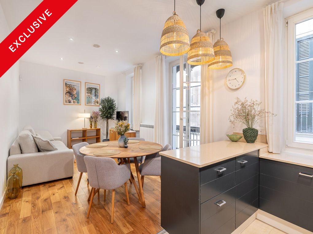 Denne lyse lejlighed på første sal med elevator ligger i hjertet af den gamle bydel og er for nylig blevet omhyggeligt renoveret med brug af materialer af høj kvalitet. De charmerende møbler tilføjer hygge og stil til alle rum. Ejendommen har en stue-spisestue med integreret køkken og masser af plads til at tilbringe dagen komfortabelt. Lejligheden har to soveværelser med indbyggede garderobeskabe. Et af dem har en balkon, der er ideel til at slappe af og nyde atmosfæren i den gamle bydel. Et badeværelse med et elegant, funktionelt design fuldender lejligheden.
