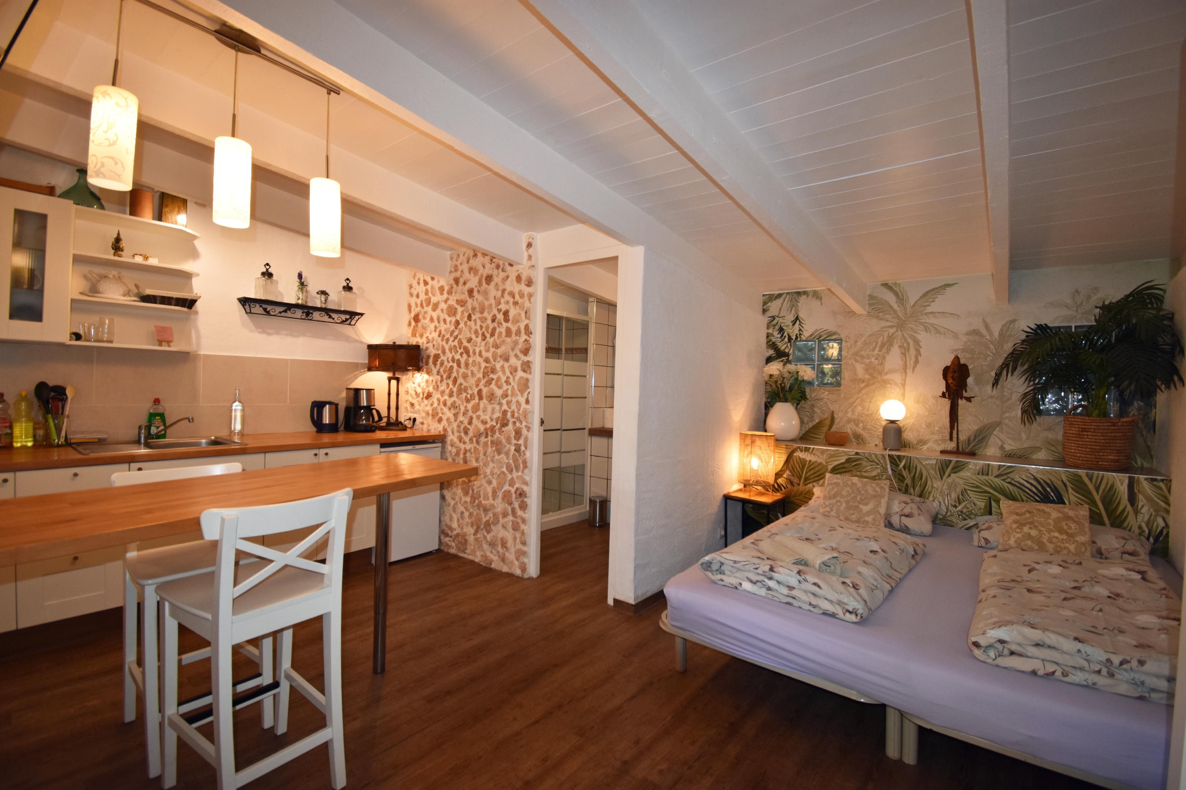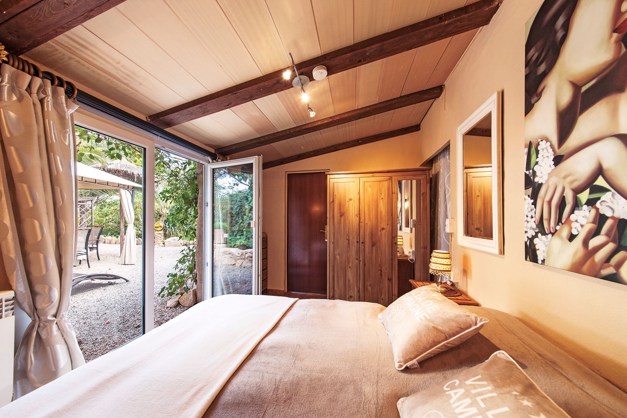 Hovedhuset har to hyggelige soveværelser, to badeværelser (det ene med eget bad), et rummeligt køkken, en spisestue og en lys opholdsstue. Derudover omfatter ejendommen fire separate bygninger, hvoraf den ene huser to gæstehytter, hver med et soveværelse, badeværelse og tekøkken.
