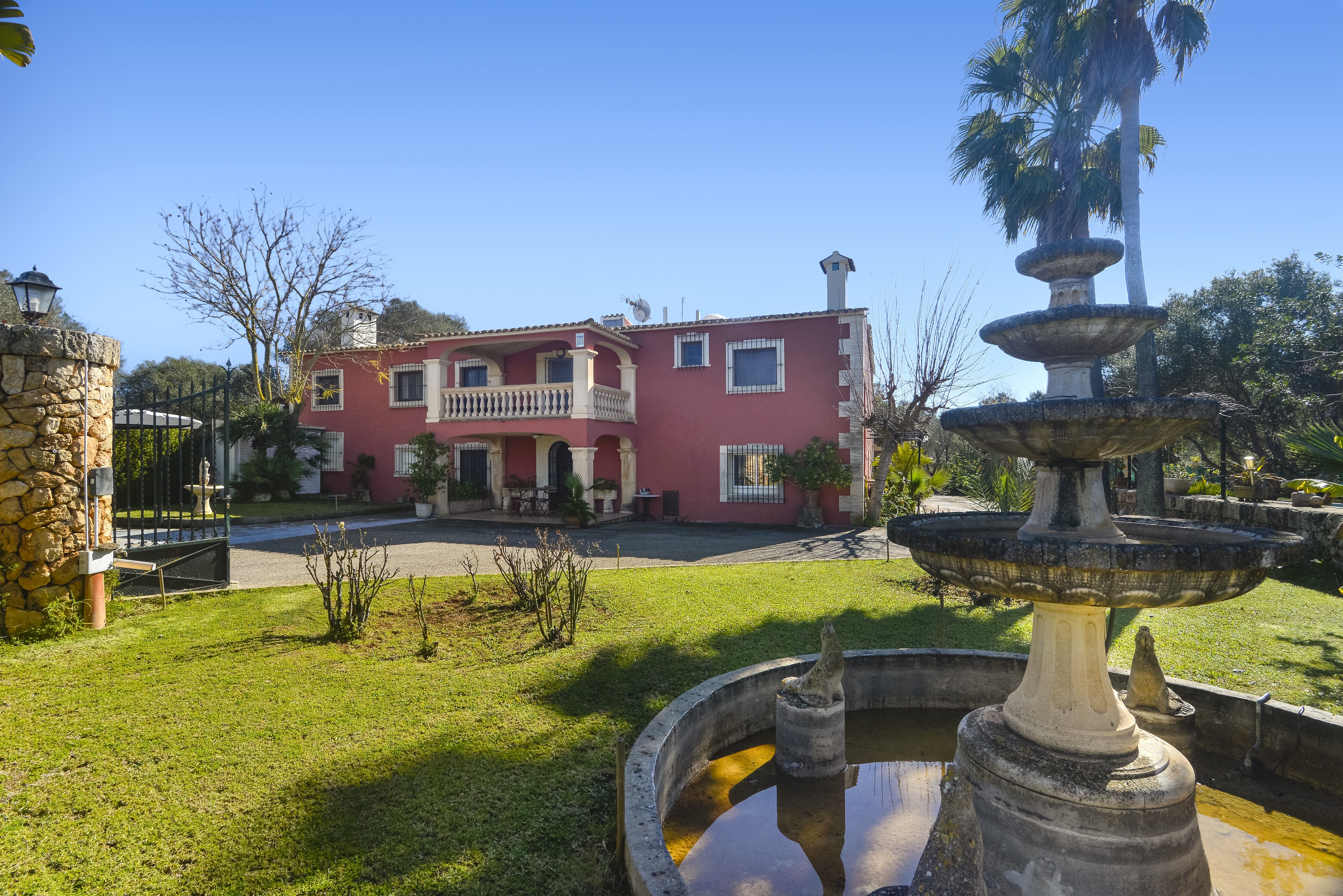 En asfalteret indkørsel fører til verandaen, hvorfra en smuk indgang med mosaikgulve fører til en åben stue med pejs og direkte adgang til en overdækket terrasse. Opholdsstuen er forbundet med det fuldt udstyrede køkken med ø. I alt består huset af fem soveværelser og seks badeværelser, hvoraf fem er ensuite. Der er adgang til det ydre fra forskellige rum i stueetagen, mens den øverste etage nås via en trappe fra den dejlige indgang. Den øverste etage består af fire soveværelser, alle med eget badeværelse, og det store soveværelse har også en privat, overdækket terrasse med udsigt over ejendommen. Udenfor byder denne fantastiske ejendom på forskellige overdækkede terrasser, et grillområde, en pool omgivet af oliventræer, der giver skygge med bar ved poolen, og en frodig have med springvand og forskellige siddeområder, der er ideelle til afslapning.