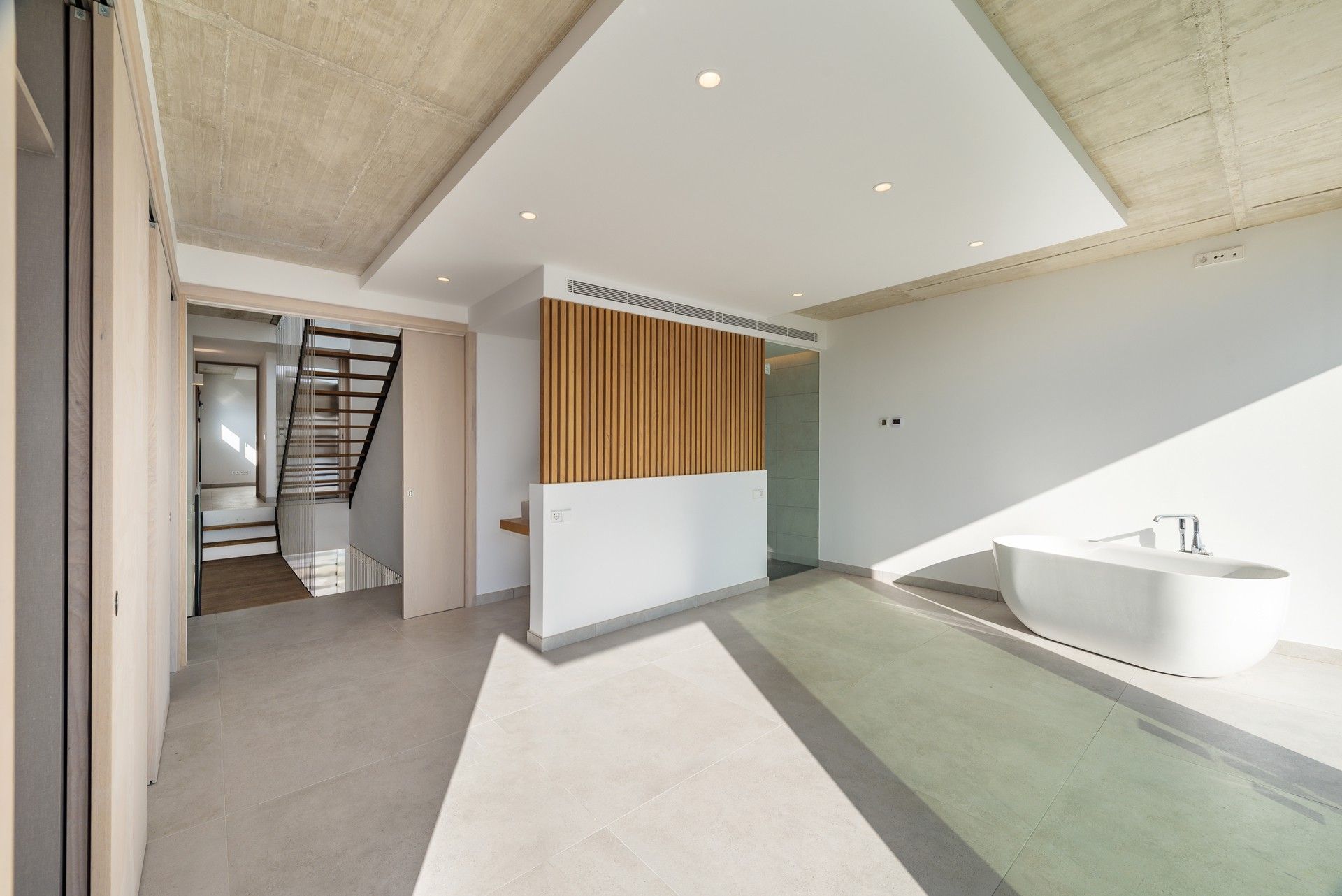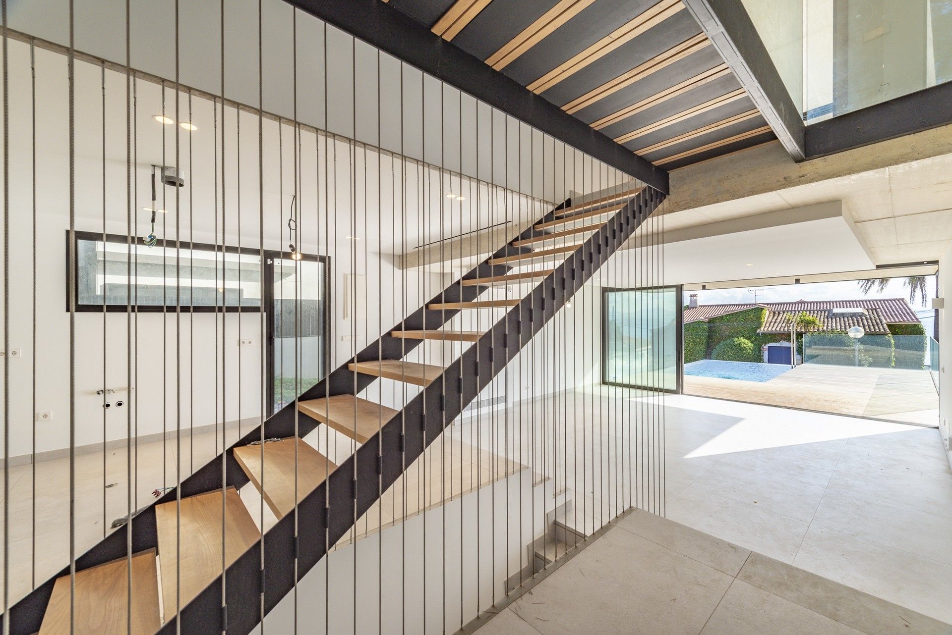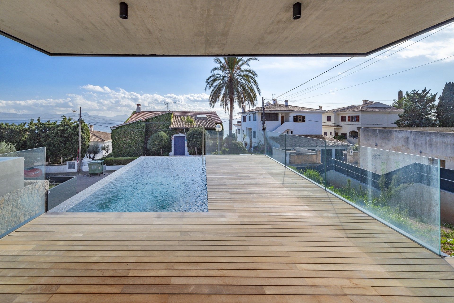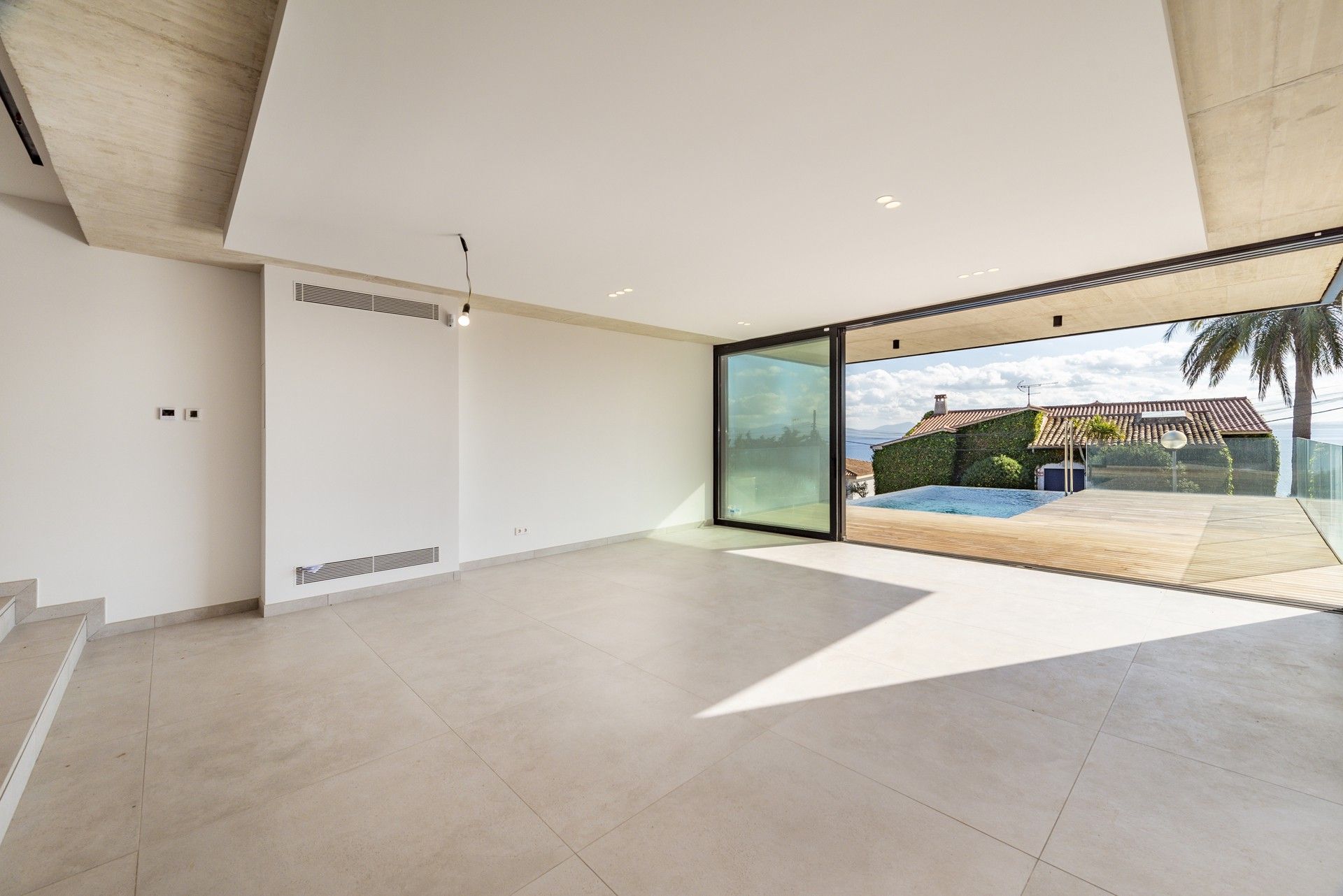 Det primære opholdsrum flyder ubesværet ud på en stor, overdækket veranda, som går sømløst over i en infinity-pool og et soldæk - din private oase med udsigt over Middelhavet. Tagterrassen tilbyder endnu et udsigtspunkt til solnedgange og stjernemøder, hvilket gør dette hjem ideelt til underholdning eller bare til at slappe af i ro og mag.
