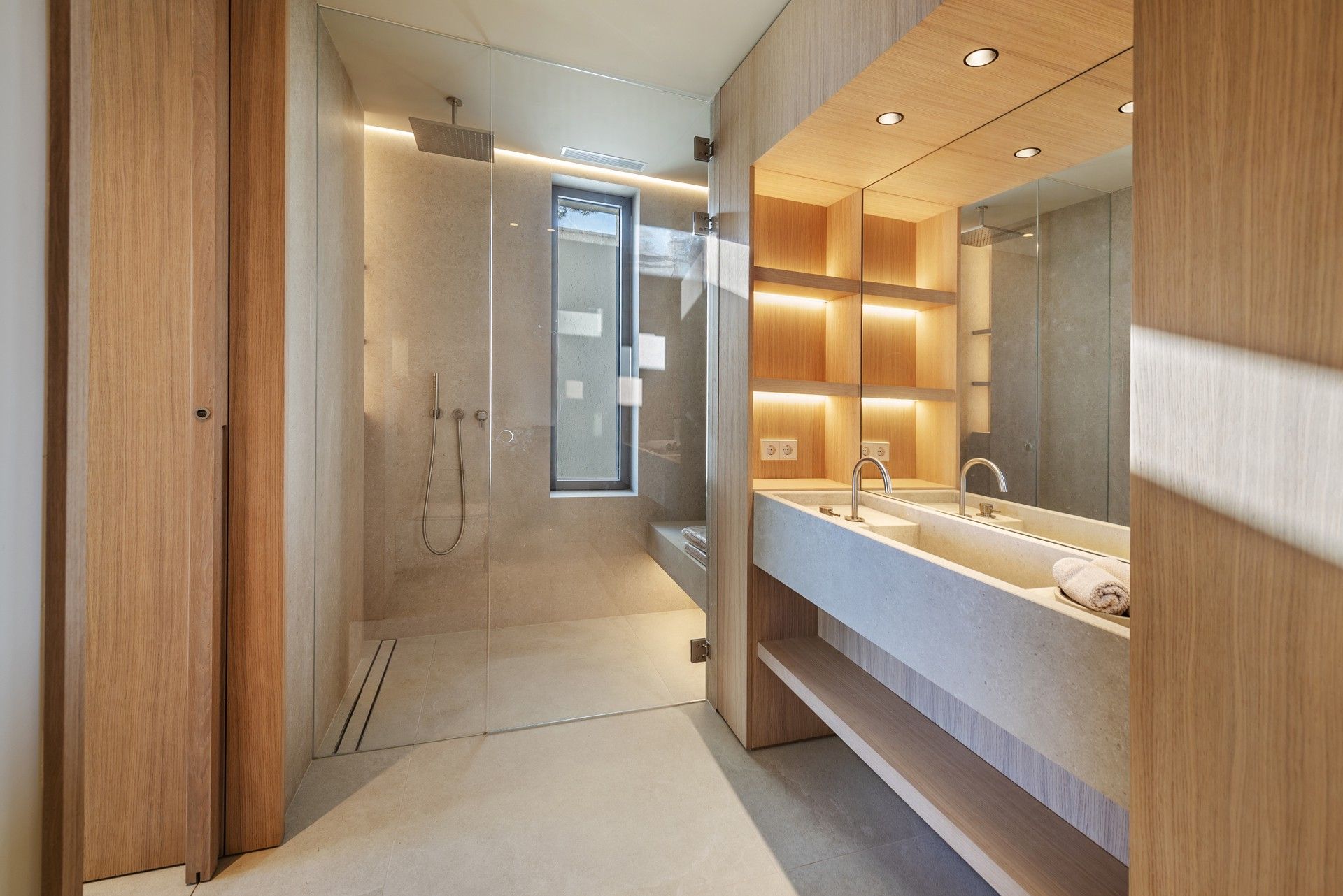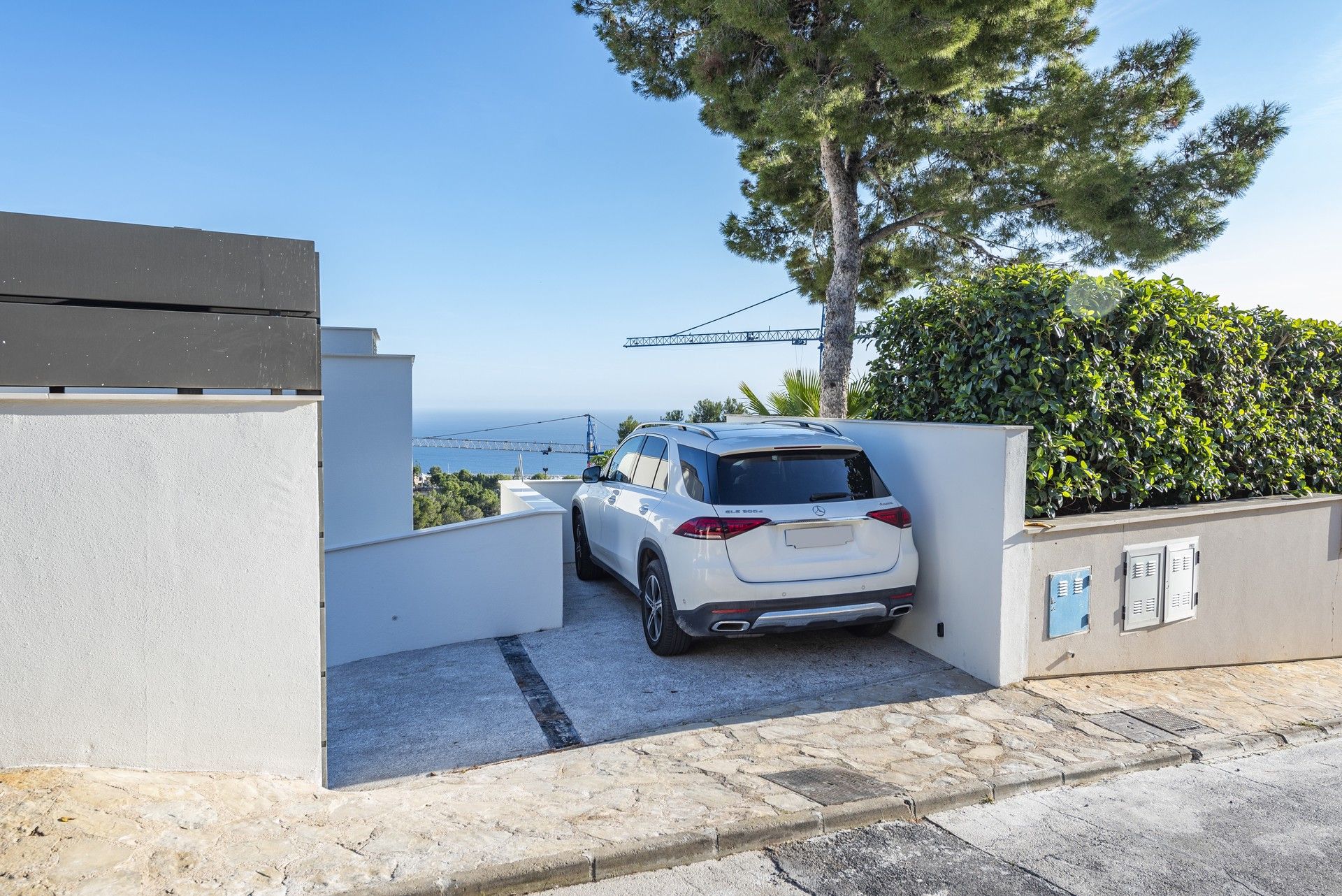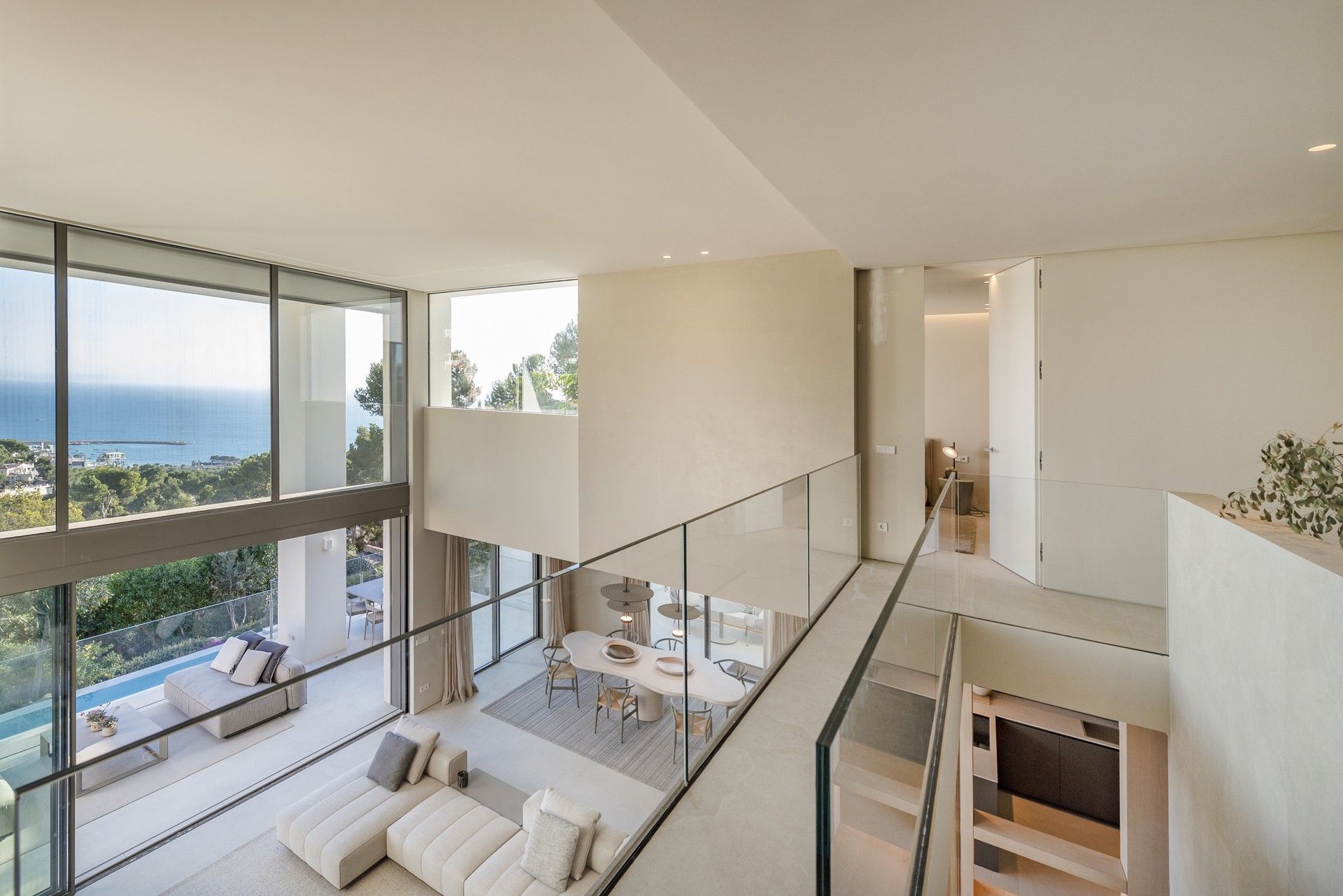 Denne udsøgte villa med betagende havudsigt er perfekt beliggende over den prestigefyldte marina i Puerto Portals. Ejendommen byder på en sømløs blanding af luksus og komfort og har 5 rummelige soveværelser med hver sit en-suite badeværelse. Master-suiten er et sandt fristed, komplet med et walk-in-omklædningsområde og en privat terrasse. Villaen strækker sig over tre omhyggeligt designede niveauer og har et harmonisk layout. Den øverste etage fungerer som hovedindgang og huser to store gæstesoveværelser, hver med fuldt udstyrede en-suite badeværelser. En praktisk elevator forbinder alle niveauer og sikrer ubesværet bevægelse i hele hjemmet. På mellemste etage finder man et moderne, avanceret køkken, som åbner op til en lys og luftig spiseplads. Ved siden af ligger en stue med vinduer fra gulv til loft, en hyggelig pejs og et gæstetoilet. Designet inviterer naturligt lys til at fylde rummet og skaber en indbydende stemning. Det nederste niveau er dedikeret til afslapning og underholdning med en ekstra stue. Her er også to ekstra gæstesoveværelser med eget badeværelse. Udendørsområdet er et sandt højdepunkt med en fantastisk pool, et rummeligt loungeområde og et fuldt udstyret udekøkken, perfekt til at være vært og nyde middelhavsstilen. Alle værelser og terrasser i denne bemærkelsesværdige villa har panoramaudsigt over Middelhavet og den livlige marina i Puerto Portals. De førsteklasses funktioner omfatter Poliform-garderober, et Poliform-køkken, elegante Minotti-møbler, central aircondition og gulvvarme, der sikrer komfort og raffinement året rundt. Villaen ligger i det eksklusive boligområde Costa den Blanes, omgivet af uberørte strande, internationale skoler og de luksuriøse faciliteter i Puerto Portals. Den gode beliggenhed er kun 15 minutter fra Palmas centrum og 25 minutter fra lufthavnen, hvilket gør det til det ideelle hjem til at omfavne Mallorcas middelhavsstil.