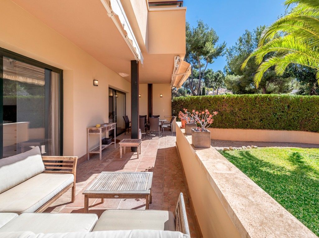 Denne elegante lejlighed i stueetagen ligger i et luksuskompleks kun få minutter fra lystbådehavnene Puerto Portals og Palma. Opholdsstuen består af en stor stue/spisestue, et soveværelse med badeværelse en suite, et andet gæstesoveværelse, et gæstebadeværelse og et fuldt udstyret køkken med vaskerum. Der er adgang til en fremragende overdækket terrasse fra opholdsstuen ud til haven og er det perfekte sted at spise og slappe af. Lejligheden har også reversibel aircondition, en parkeringsplads og et opbevaringsrum i garagen. Bofællesskabet har en indendørs og udendørs pool, sauna, fitnesscenter og dejlige haveområder.