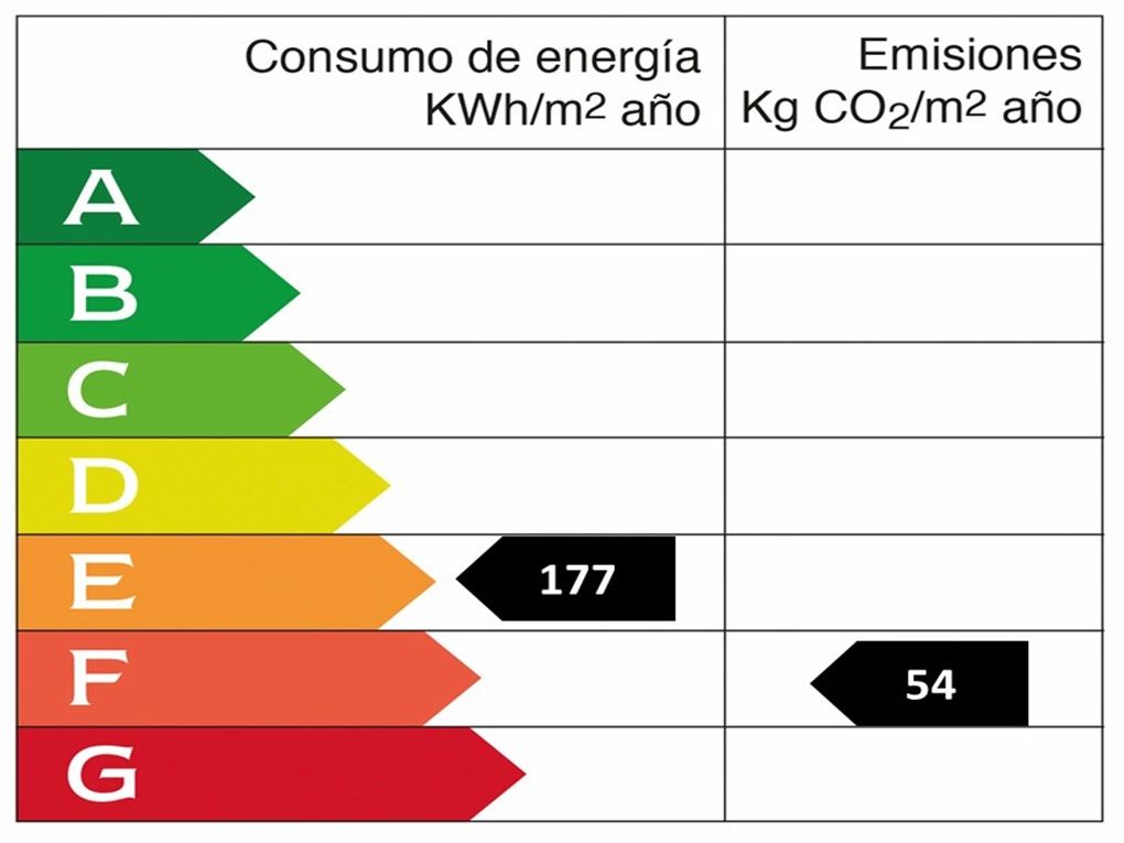 • energiforbrugskoefficient: 177.5 kWh/(m2*a) • CO2-emission: 54.1 kg/m2 • CO2-emissionsklasse: F • Energieffektivitetsklasse: E