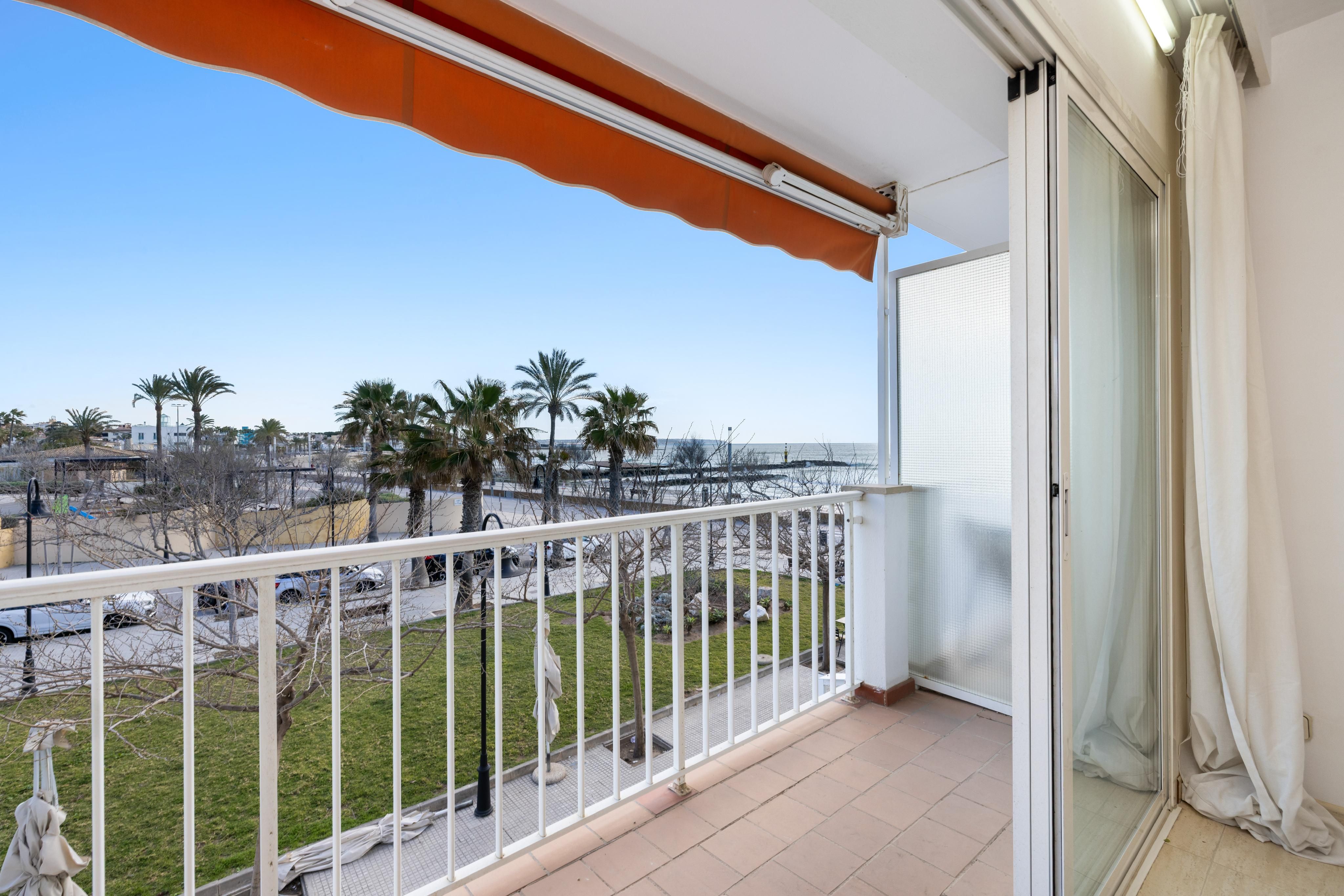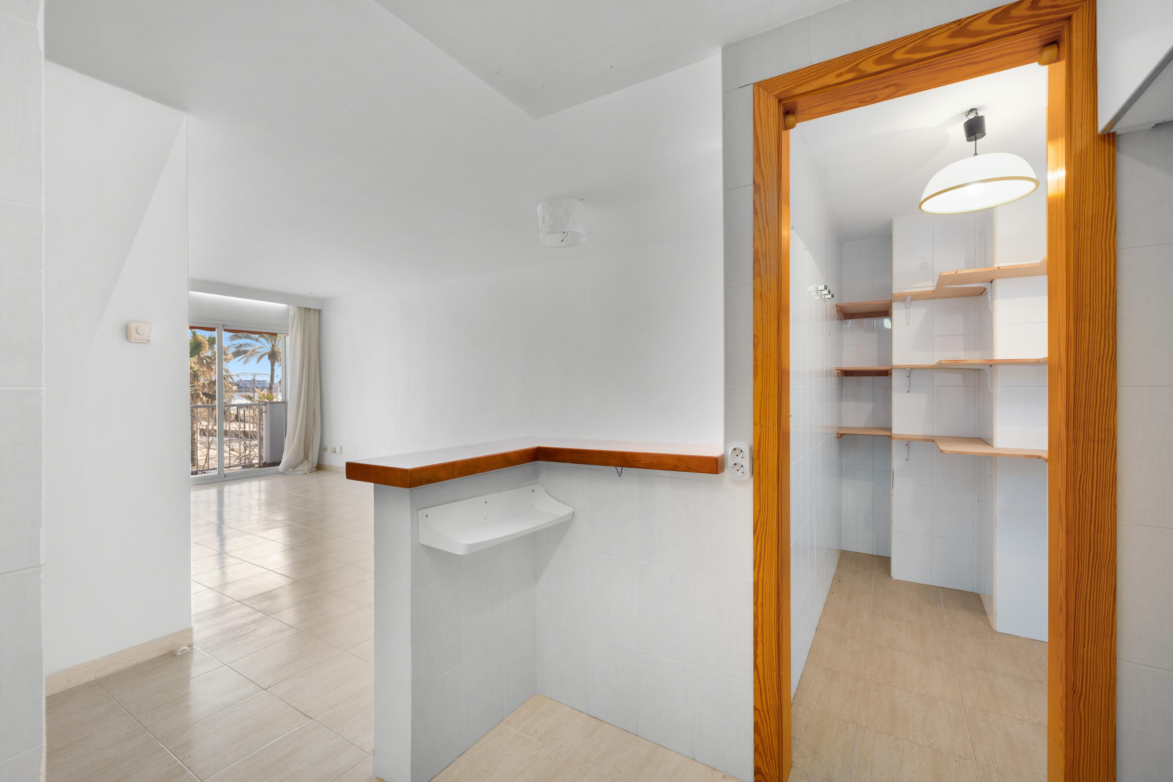 Denne lejlighed har en førsteklasses beliggenhed direkte på strandpromenaden, omgivet af palmer, stranden, velholdte parker og mange indkøbsmuligheder. Bygningen imponerer med kun to boliger pr. etage, hvilket garanterer et roligt og behageligt boligmiljø, og er udstyret med en elevator. Selve lejligheden strækker sig over ca. 78 m² og er lys, venlig og veldesignet. Fra stuen er der udgang til en balkon, der strækker sig langs hele den udvendige facade. Takket være den optimale orientering er alle værelser gennemstrømmet af lys og har havudsigt fra siden. Det funktionelle køkken har et rummeligt spisekammer, der skaber en åben forbindelse til opholdsstuen. Badeværelset er fuldt udstyret og har bruser. Der er to soveværelser med dobbeltsenge, hvoraf det ene har to praktiske indbyggede garderobeskabe, begge med direkte adgang til balkonen. Lejligheden afrundes af en garageplads og et separat opbevaringsrum, som giver ekstra bekvemmelighed og opbevaringsplads. Promenaden lige foran, som begynder i Portixol, indbyder til afslappende gåture og formidler den uforlignelige middelhavsatmosfære, som gør dette sted så specielt.