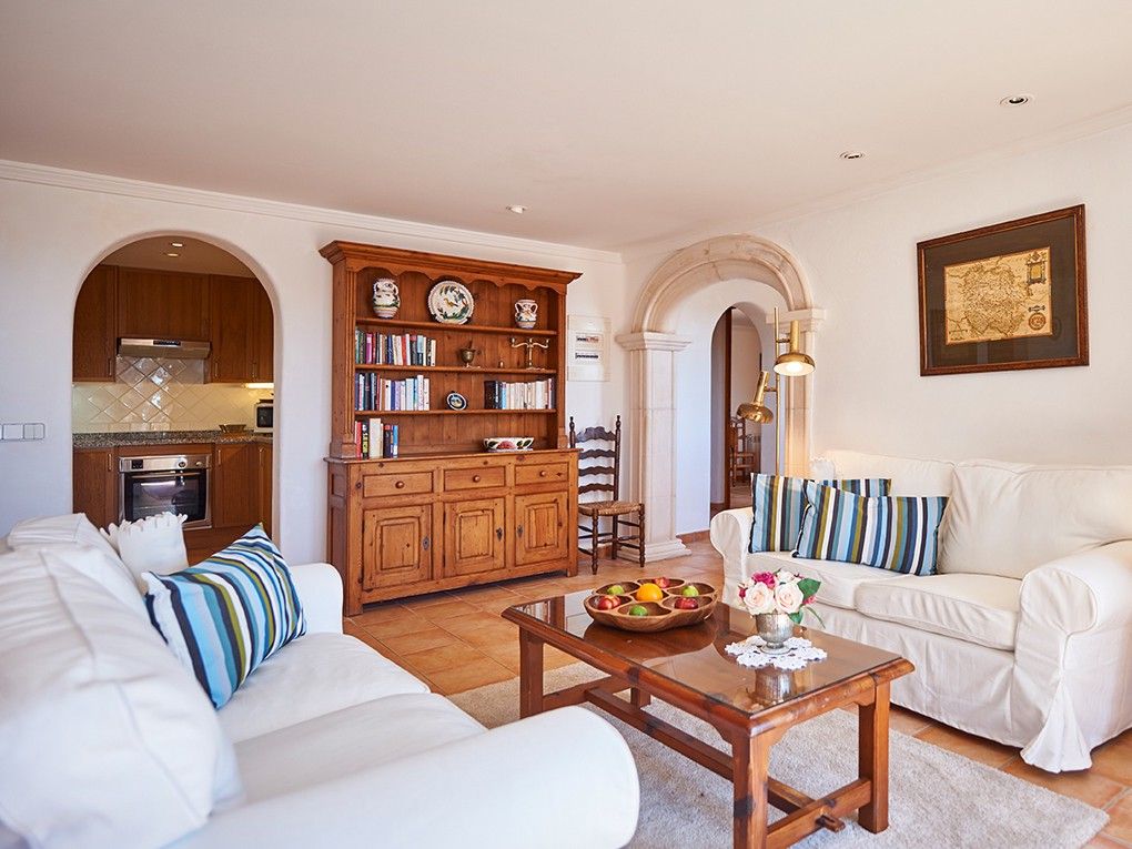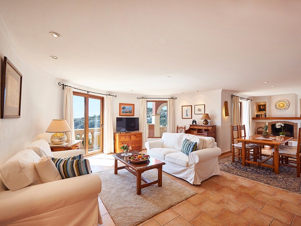 Denne middelhavslejlighed ligger i det prominente Port Andratx, et af de mest eftertragtede kystområder i den eksklusive sydvestlige del af Mallorca. Den ligger i et velholdt lille og privat villakompleks og har en uforlignelig udsigt over havet og bugten Cala Llamp. Lejligheden består af ca. 105 m² boligareal og rummelige terrasser. Den spektakulære panoramaudsigt over havet strækker sig fra alle rum og lover uforglemmelige solnedgange i havet. Lejligheden er udstyret med to soveværelser og et stilfuldt badeværelse. Den har også en pejs, gas-centralvarme og aircondition (h/c) i soveværelserne for varme og komfort. Huset tilbydes fuldt møbleret. Haven i middelhavsstil og swimmingpoolen inviterer dig til at slappe af. Nabolejligheden kan også købes.