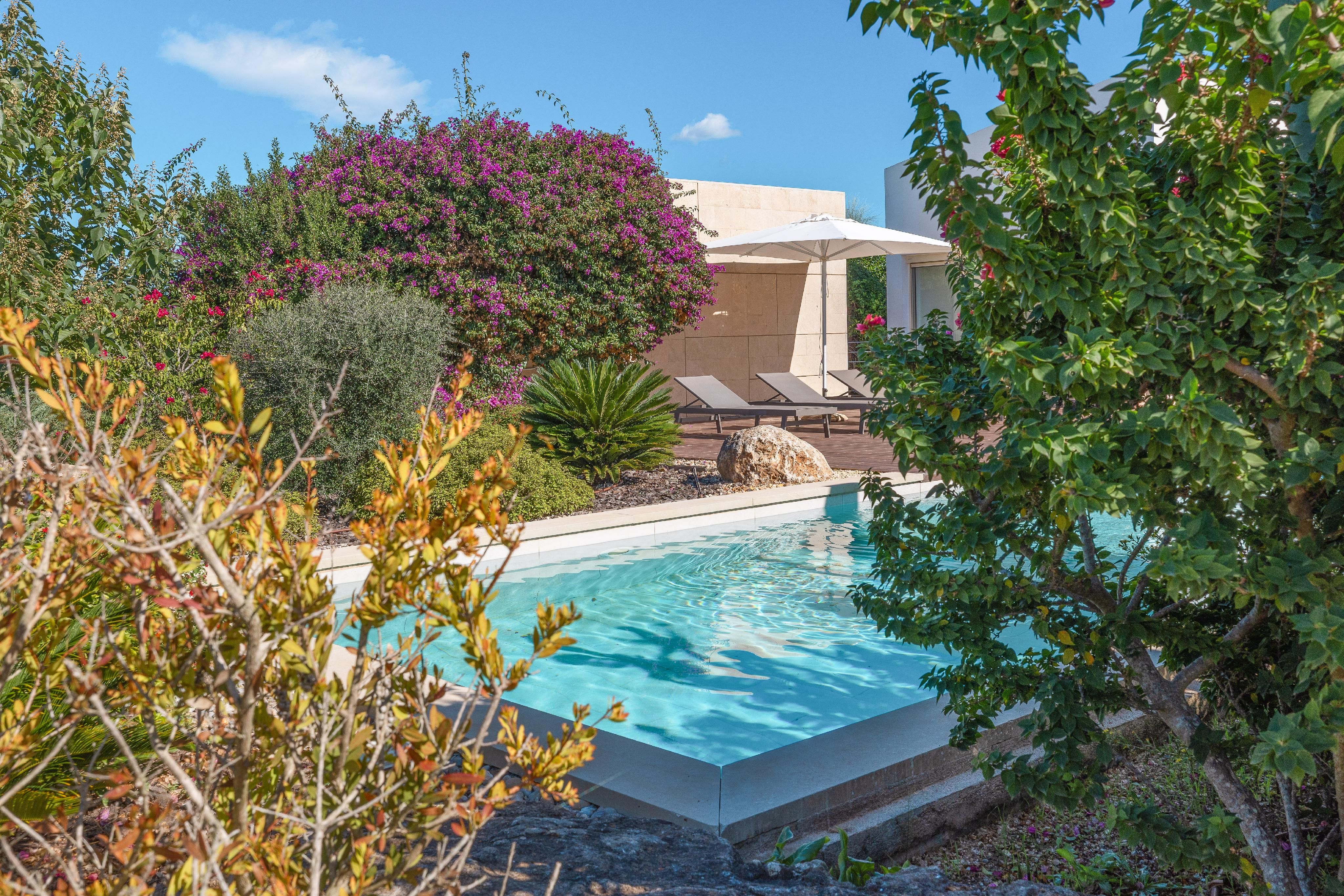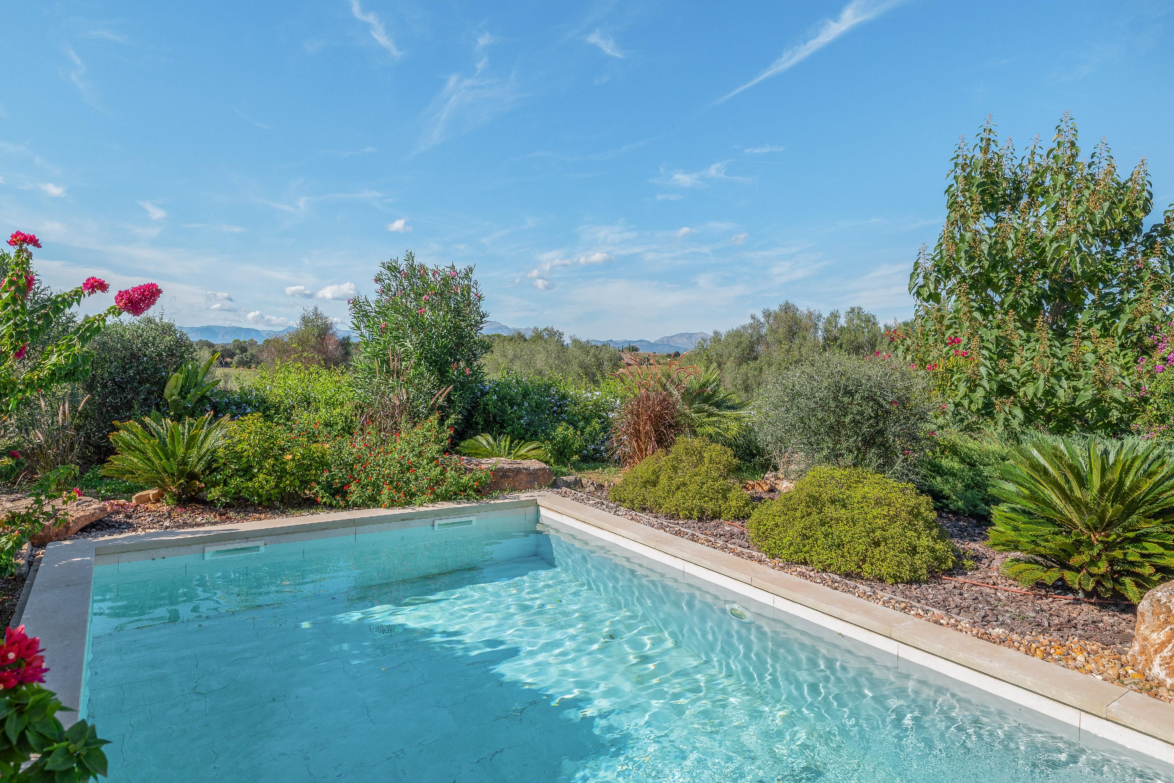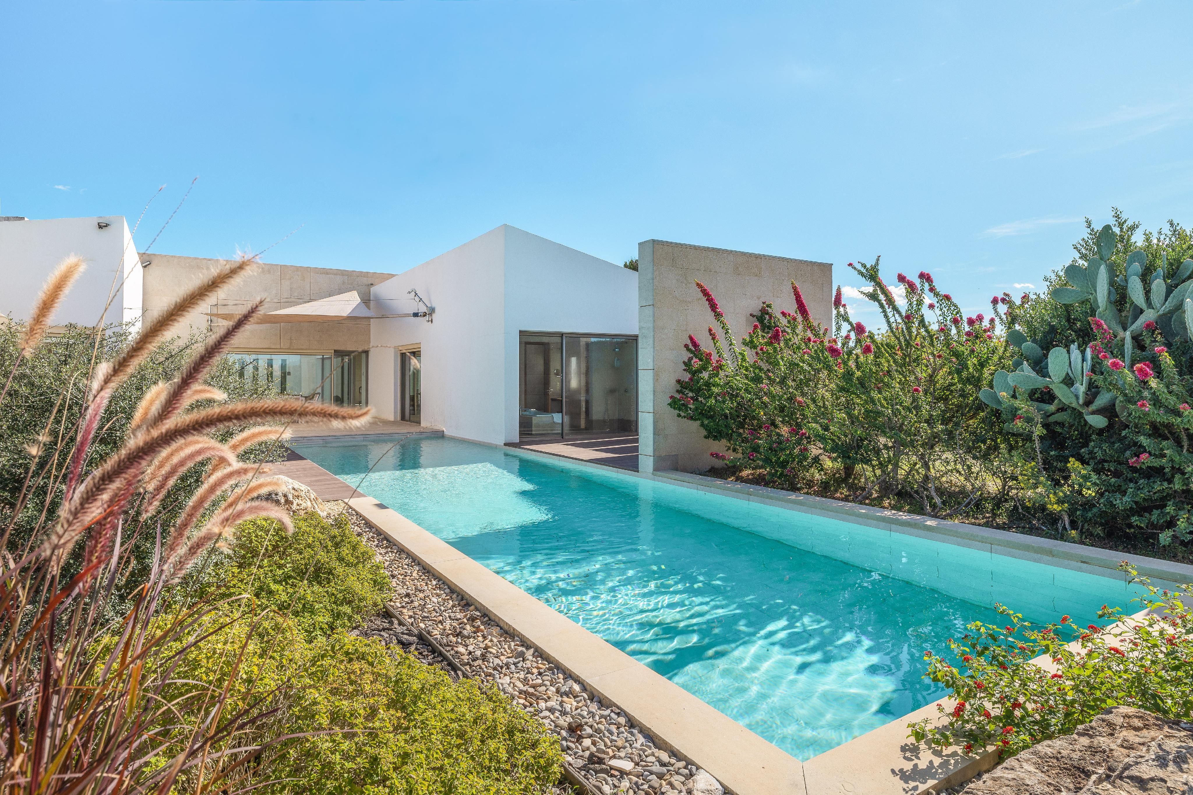 Udenfor omgiver en middelhavshave med indfødt flora den elegante swimmingpool. Fra tagterrassen kan man nyde panoramaudsigten over det mallorcinske landskab - og på klare dage kan man endda se havet i det fjerne.