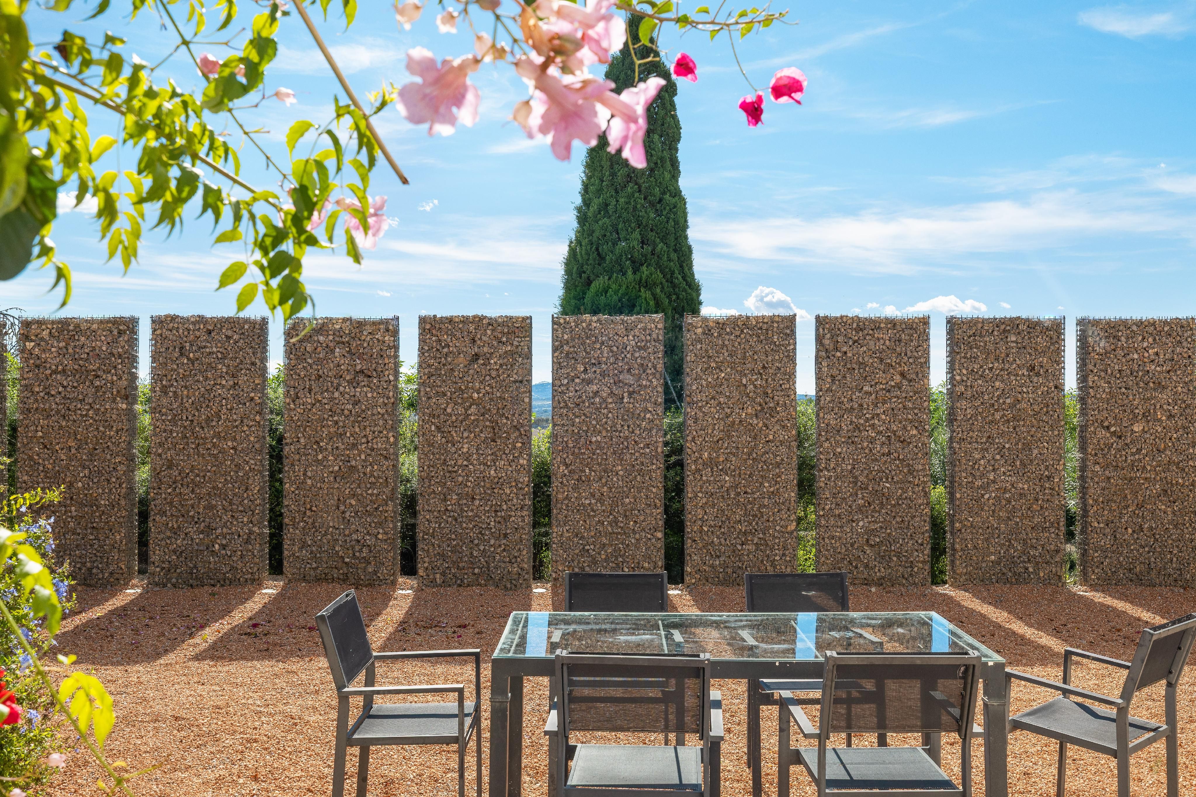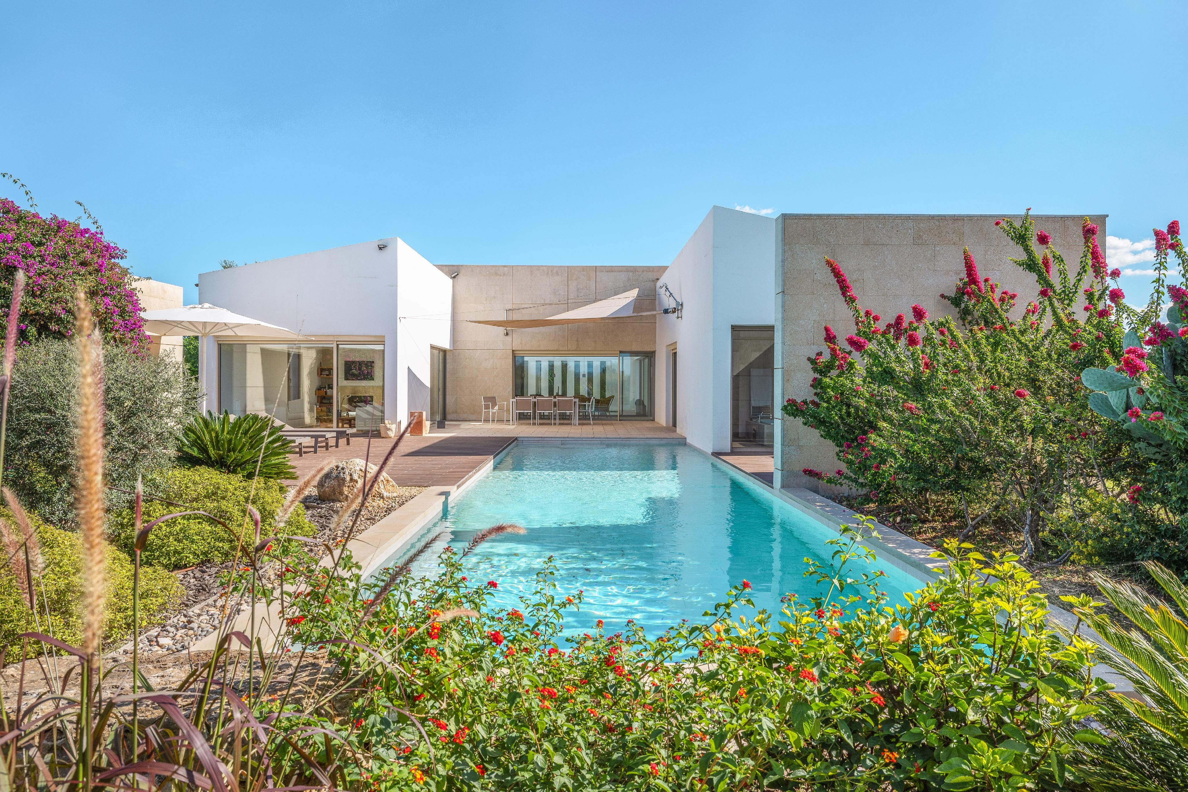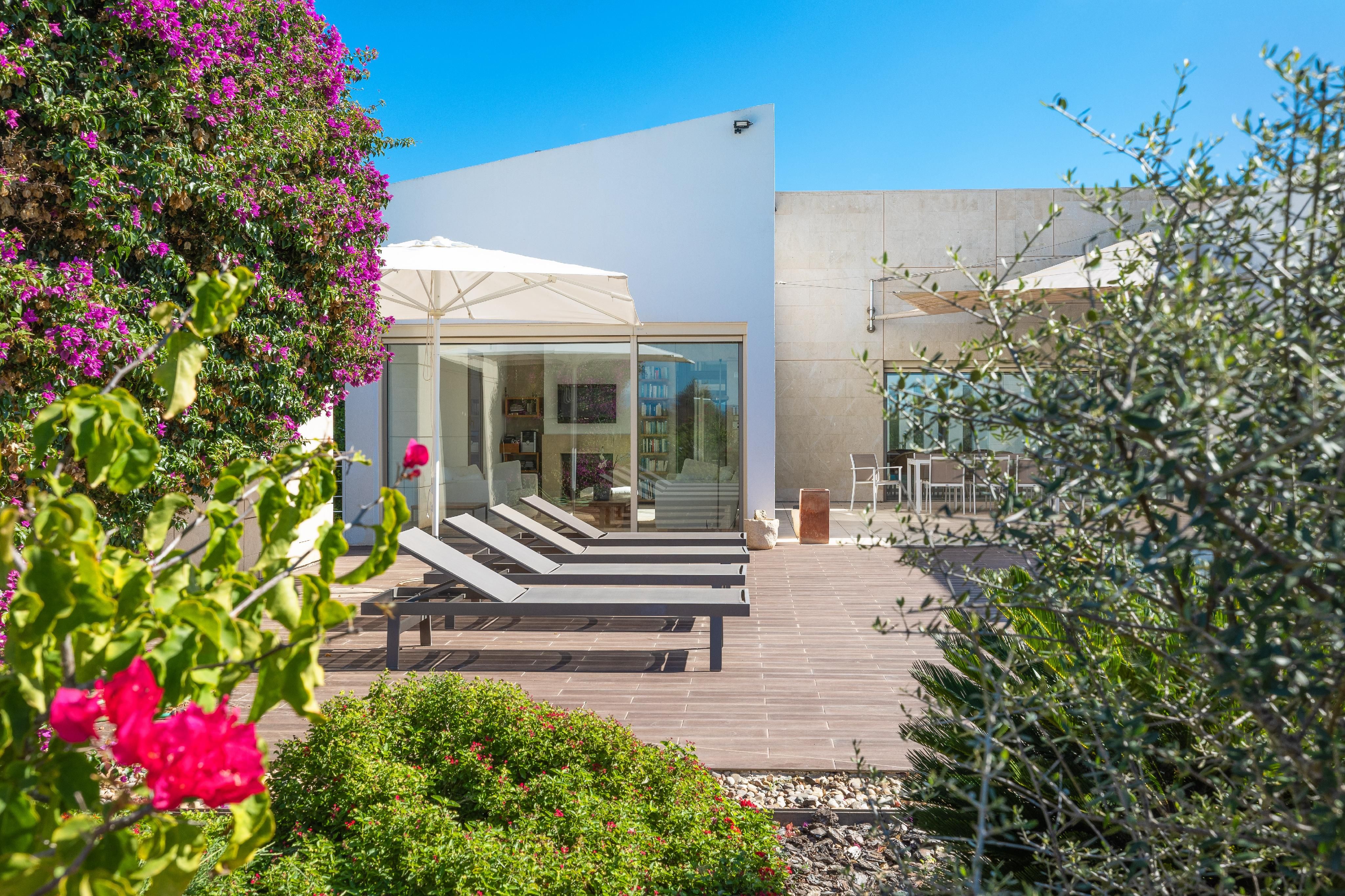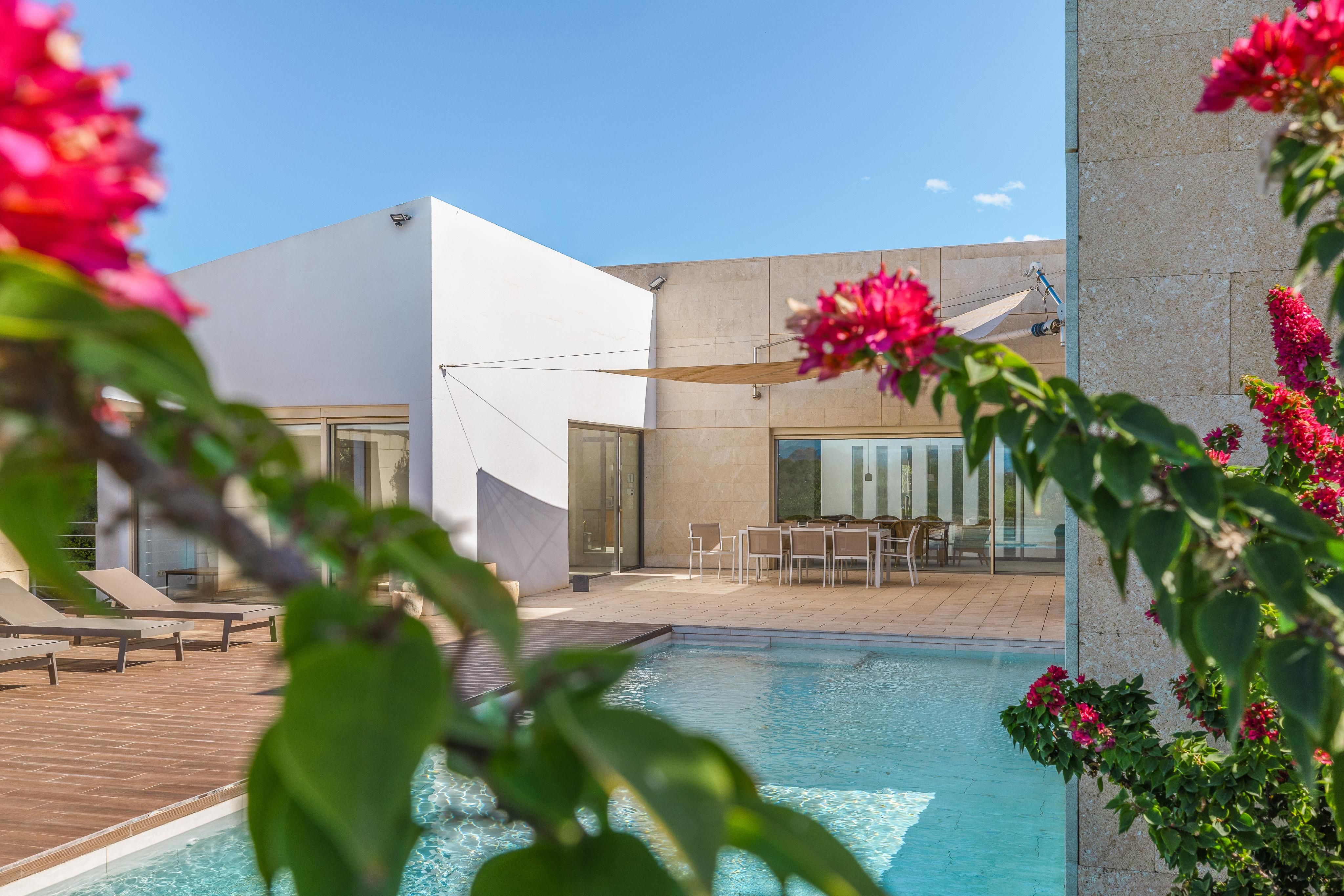 Udenfor omgiver en middelhavshave med indfødt flora den elegante swimmingpool. Fra tagterrassen kan man nyde panoramaudsigten over det mallorcinske landskab - og på klare dage kan man endda se havet i det fjerne.