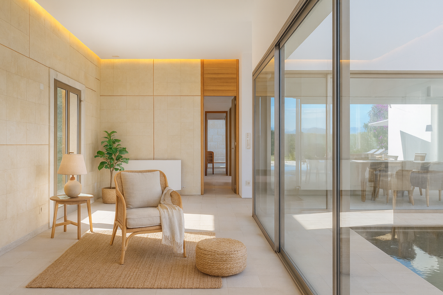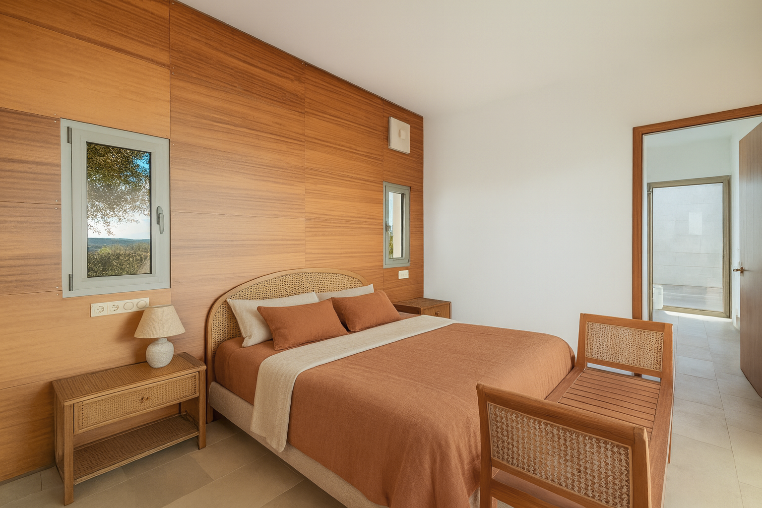 Huset er designet som et åbent loftslayout i én etage, hvilket skaber en følelse af plads, lys og ro. Hovedområdet består af en rummelig mastersuite, mens to gæstesoveværelser - hver med eget badeværelse og separat adgang - giver maksimalt privatliv og komfort.