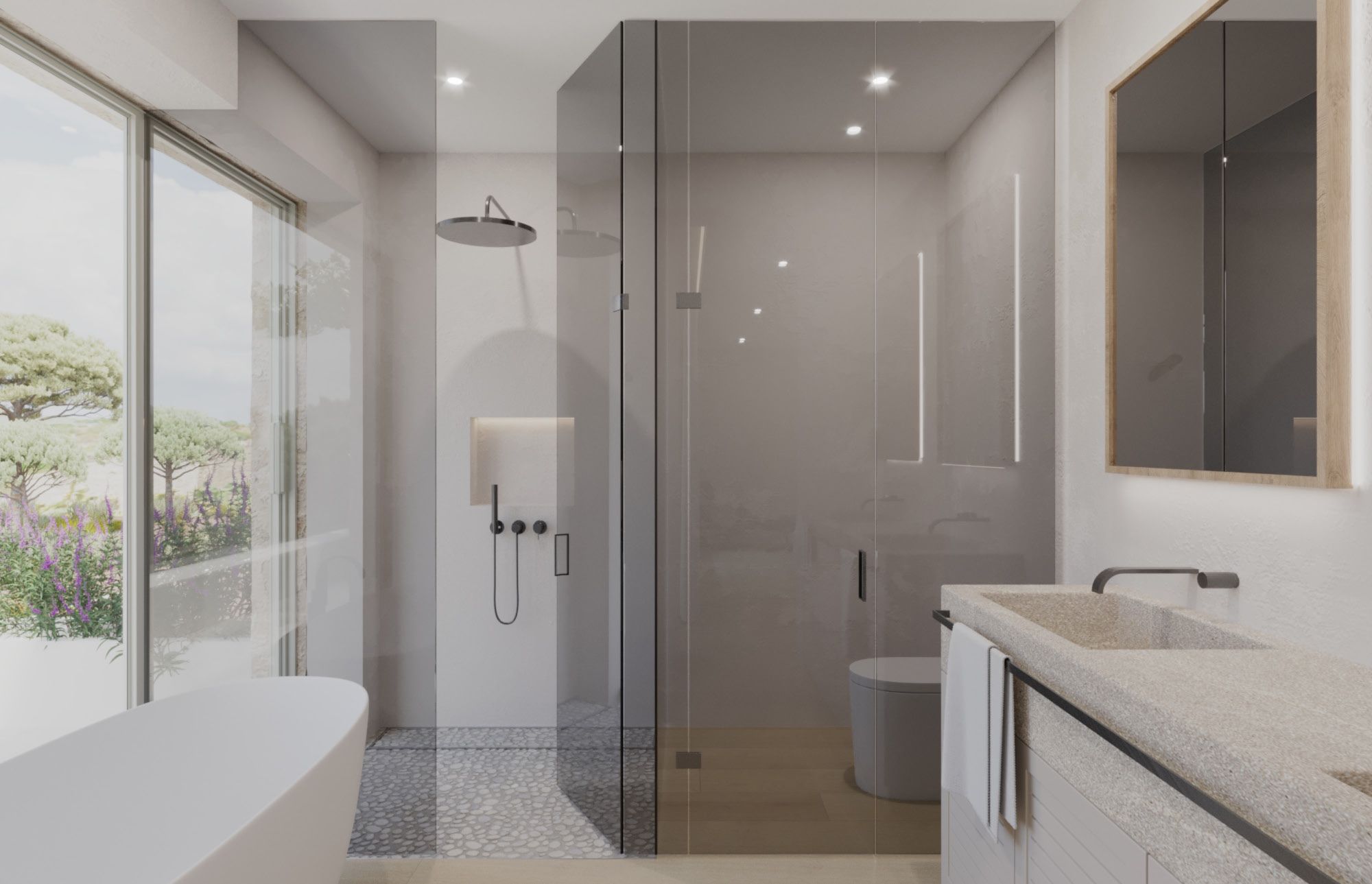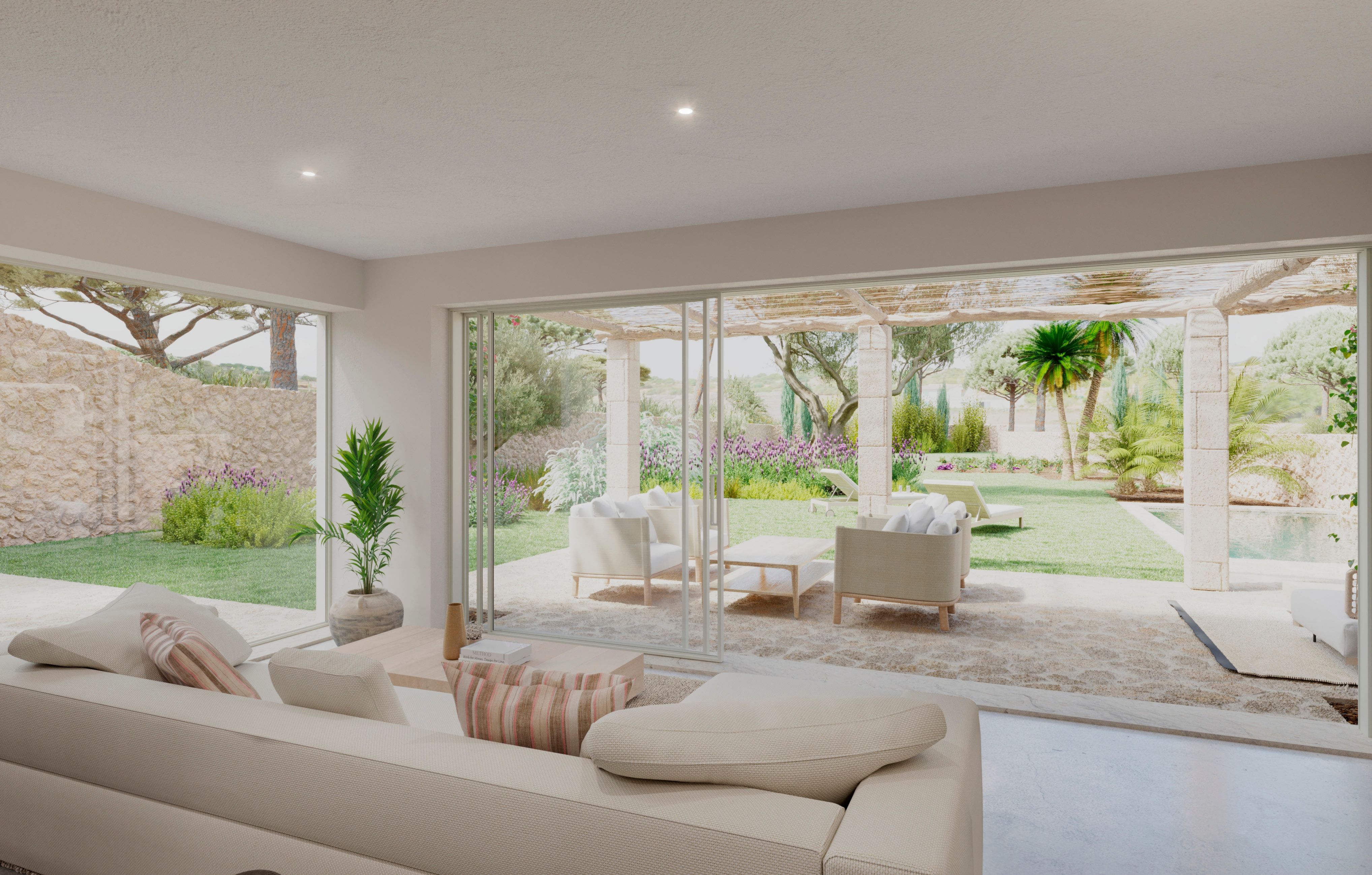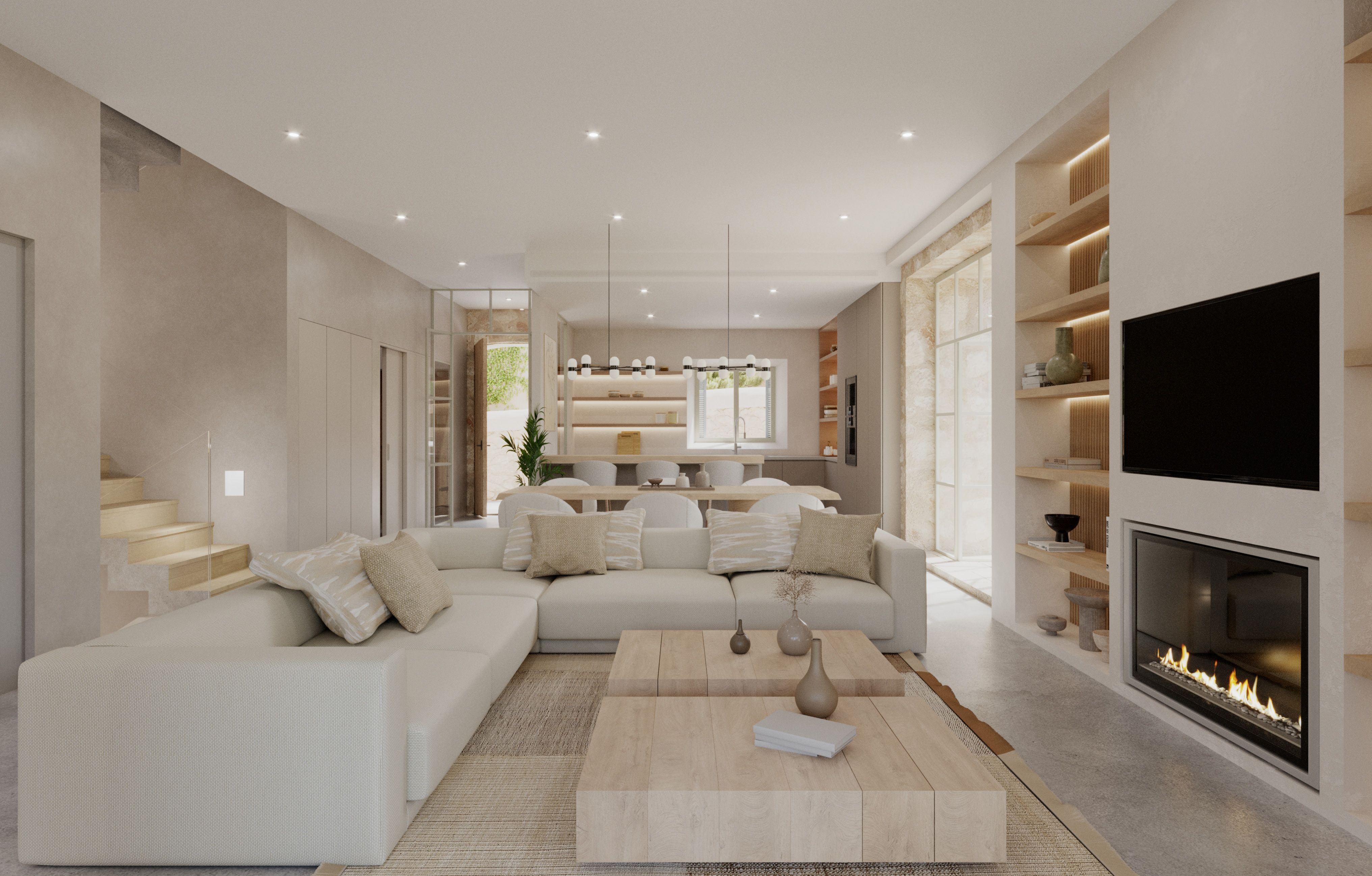 I et eftertragtet bjergområde i Alqueria Blanca opføres der i øjeblikket fire rækkehuse af høj kvalitet, som ikke kun vil imponere med deres fremragende byggekvalitet, men også med deres enestående udsigt. De forventes at stå færdige om ca. 12-15 måneder. Ejendommen strækker sig over i alt tre niveauer, som er bekvemt forbundet med en elevator. Indgangspartiet byder dig velkommen med en åben, lys stue og spiseplads med tilstødende køkken - et rumkoncept, der stilfuldt kombinerer boligkultur og selskabelighed. På øverste etage er der et master bedroom med en betagende udsigt, walk-in-garderobe og et rummeligt, fuldt udstyret badeværelse. Yderligere to soveværelser, hver med deres eget badeværelse, understreger den sofistikerede komfort. Et ægte højdepunkt er tagterrassen, som også er tilgængelig med elevator og har en privat jacuzzi. Herfra kan man nyde en fantastisk udsigt over havet og kirken Alqueria Blanca. Husets nederste niveau imponerer med et spa- og fitnessområde med sauna, privat brusebad og en yderligere, rummelig stue og spisestue med direkte adgang til den kærligt anlagte have med poolområde. Et praktisk bryggers afrunder pladsen på dette niveau. Garagen er integreret direkte i huset og har plads til et køretøj. Den charmerende landsby Alqueria Blanca med sit ugentlige marked ligger kun få minutters gang væk og byder på en autentisk mallorcinsk livsstil med små caféer, restauranter og butikker til de daglige behov. Forbindelsen til Porto Petro med sin maleriske havn og nærhed til drømmebugterne i naturparken Cala Mondragó er fremragende. Den populære by Santanyí ligger også kun få minutter væk. Denne ejendom kombinerer førsteklasses byggekvalitet, gennemtænkte rumkoncepter og en beliggenhed, der er uden sidestykke.