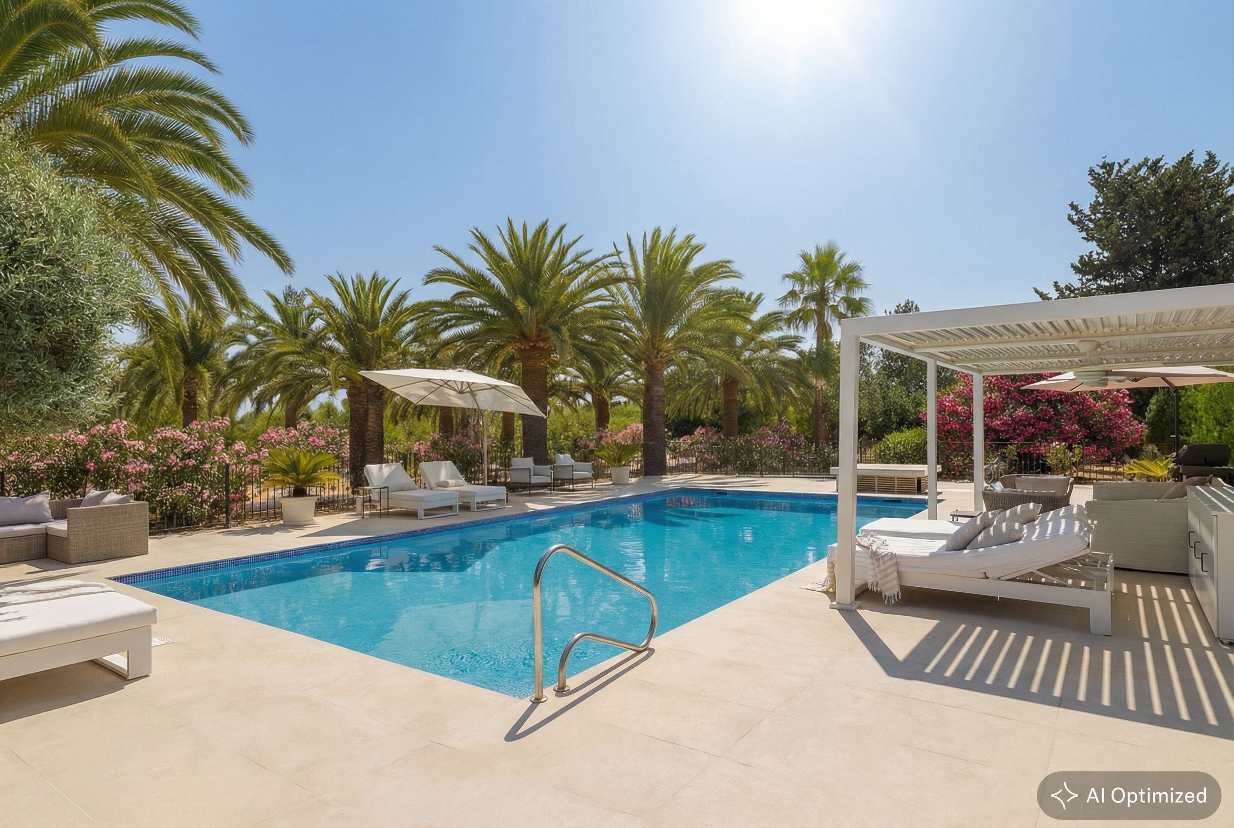Udendørs er den 12 × 6 m store saltvandspool et højdepunkt, omgivet af middelhavsplanter og modne frugttræer. Et automatiseret vandingssystem sikrer nem vedligeholdelse af de frodige haveområder.