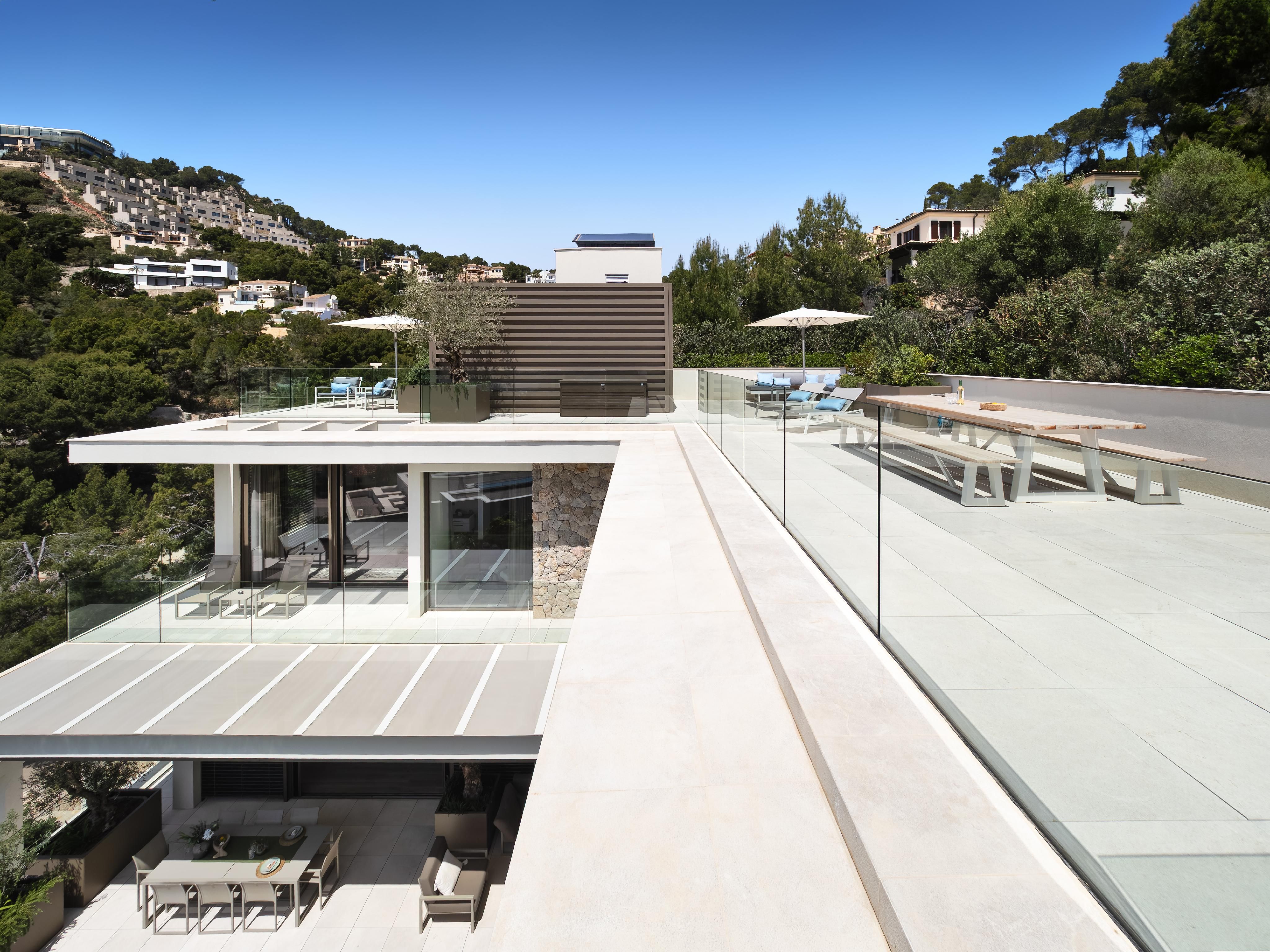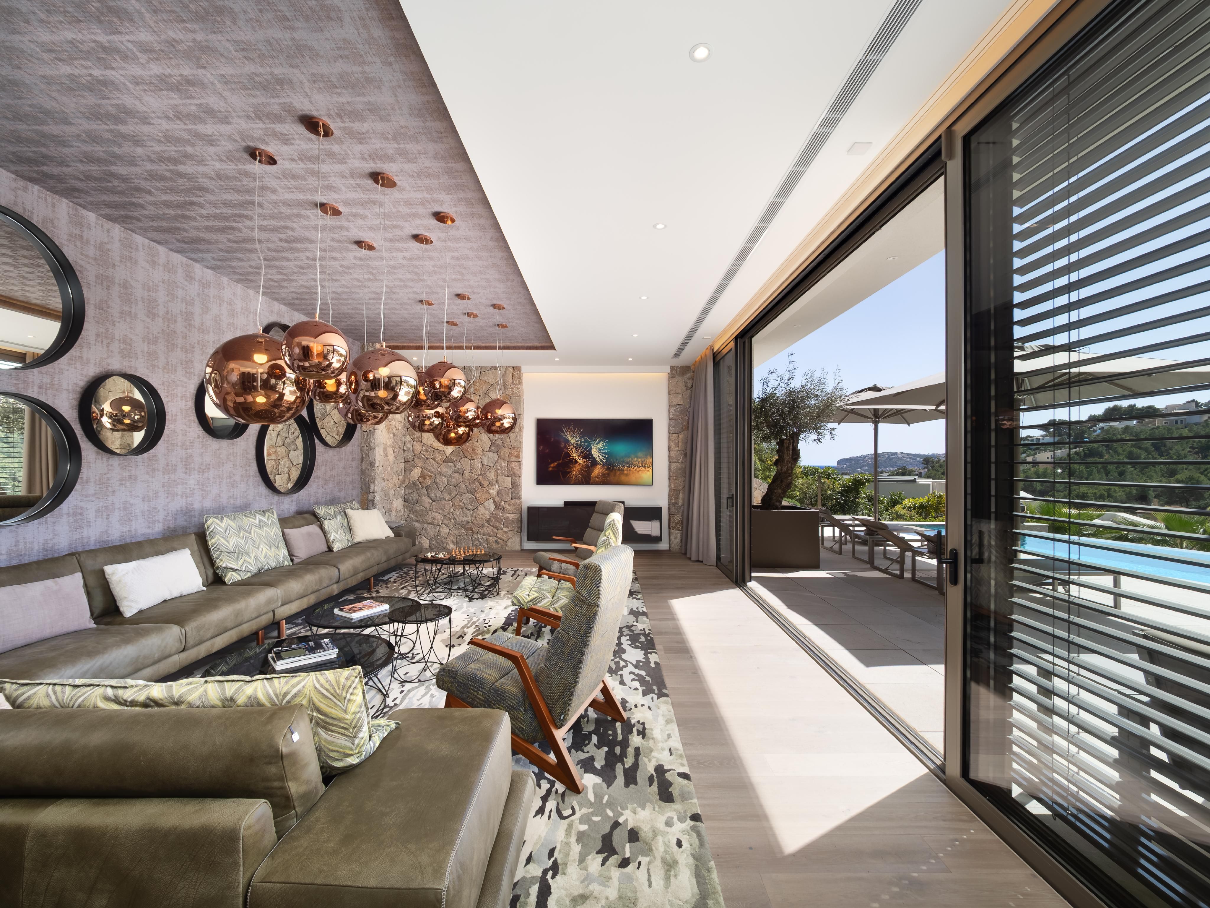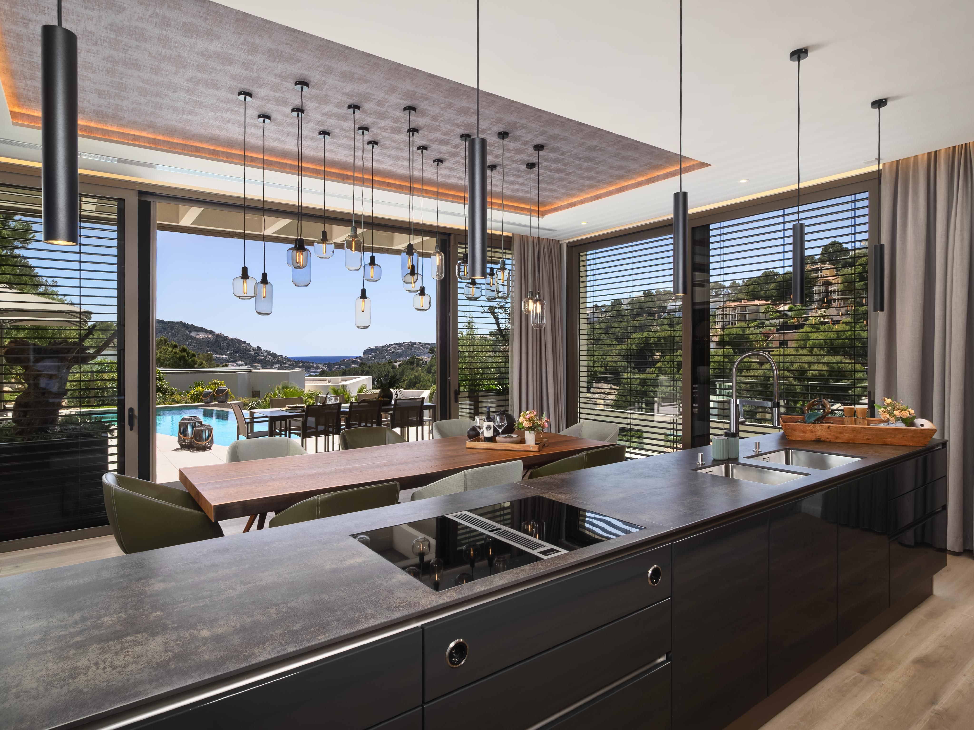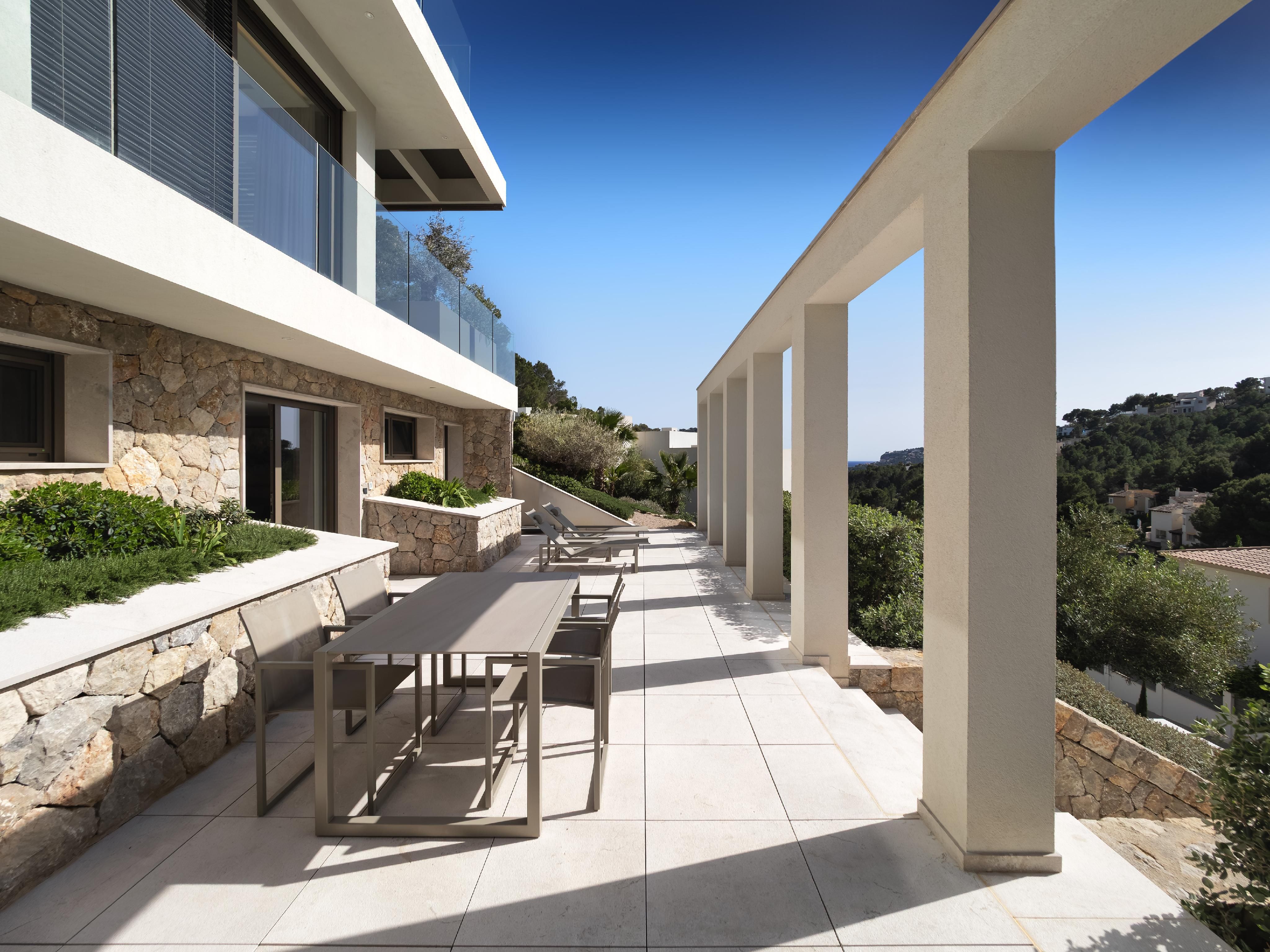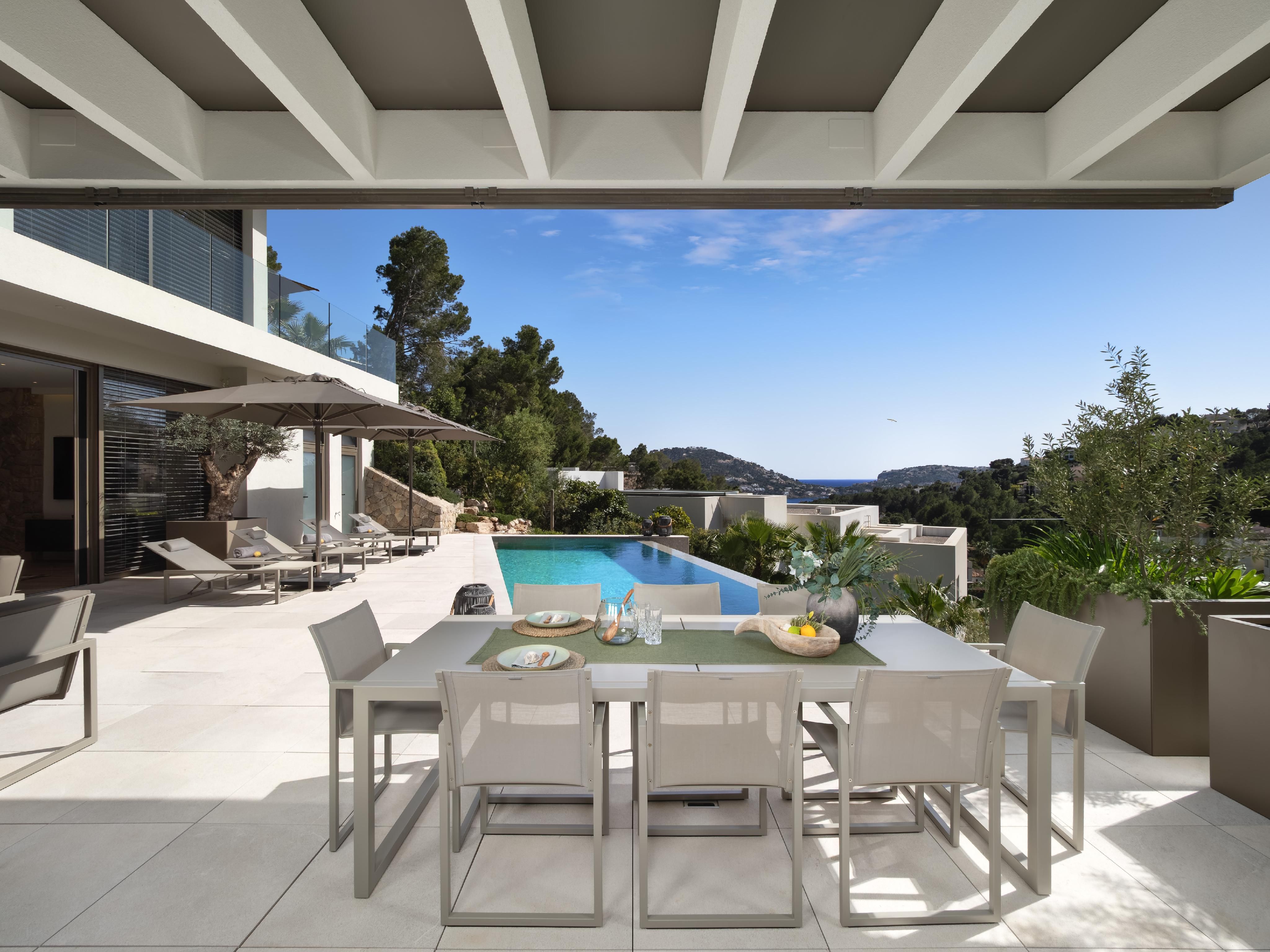 Denne nybyggede luksusvilla ligger i den eksklusive urbanisering Can Borras i Port Andratx og tilbyder en perfekt blanding af tidløst design, avanceret teknologi og god hav- og havneudsigt. Beliggende på en generøs grund på 1.089 m² og med et bebygget areal på ca. 650 m² har huset en eftertragtet sydvestlig orientering, der bader interiøret i naturligt lys og giver en spektakulær panoramaudsigt. Det arkitektoniske koncept er både elegant og praktisk med intelligent rumlig planlægning, der sikrer flydende overgange mellem indendørs og udendørs ophold. En privat elevator forbinder alle etager, fra den rummelige garage til den store tagterrasse, hvor et indbygget tekøkken gør det til det ideelle sted at underholde, mens man har udsigt over havet og bjergene. I stueetagen ligger det primære opholdsrum, et lyst åbent rum, der omfatter et designerkøkken med førsteklasses Next125-skabe, Bora-kogeplader, Siemens-apparater og keramiske bordplader. Opholds- og spiseområdet strækker sig sømløst ud på solbeskinnede terrasser, der omgiver en infinity-pool med et tilstødende komplet badeværelse. Yderligere rum på dette niveau omfatter et gæstetoilet, et bryggers og en udendørs spiseplads under en stilfuld pergola. På øverste etage er master-suiten et enestående fristed med walk-in-garderobe, luksuriøst en-suite badeværelse med fritstående designerbadekar og privat terrasse. Yderligere to soveværelsessuiter på dette niveau har hver deres badeværelse og masser af naturligt lys, hvilket opretholder villaens konsekvente standard for komfort og stil. Den nederste etage er indrettet som en helt selvstændig gæstelejlighed med yderligere to soveværelser med en-suite badeværelser, et moderne køkken, en opholds- og spiseplads, et gæstetoilet og et bryggers. På dette niveau er der også et veludstyret fitnessrum og direkte adgang til private terrasser og den anlagte middelhavshave. I hele villaen afspejler materialer og finish et urokkeligt engagement i kvalitet. Gulve af natursten, planker af børstet egetræ med UV-bestandig finish. Avanceret teknologi forbedrer oplevelsen yderligere med Schüco-vinduer og skydedøre, integrerede elektriske persienner, smart home-styring af belysning, klima og solafskærmning og et omfattende sikkerhedssystem med overvågningskameraer og adgangskontrol. De skræddersyede møbler fra kendte mærker som Rolf Benz, Cattelan Italia, Hülsta og Koinor definerer interiøret og kan købes separat. Denne villa lover ikke kun privatliv og luksus, men også ubesværet funktionalitet. Den ligger kun få minutter fra yachtklubben, eksklusive restauranter og boutique-shopping på havnepromenaden og tilbyder en enestående livsstil i et af Mallorcas mest prestigefyldte kystområder.