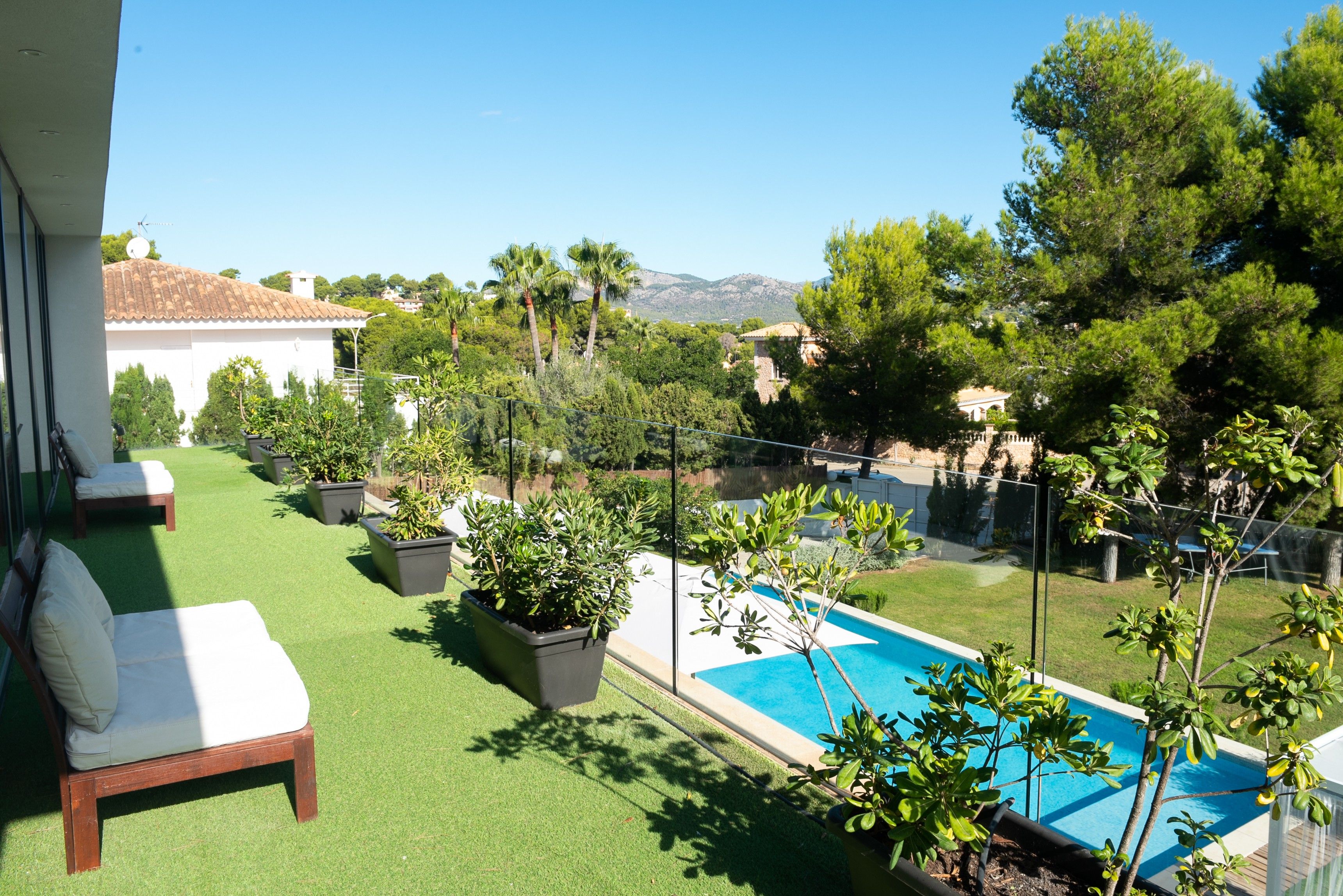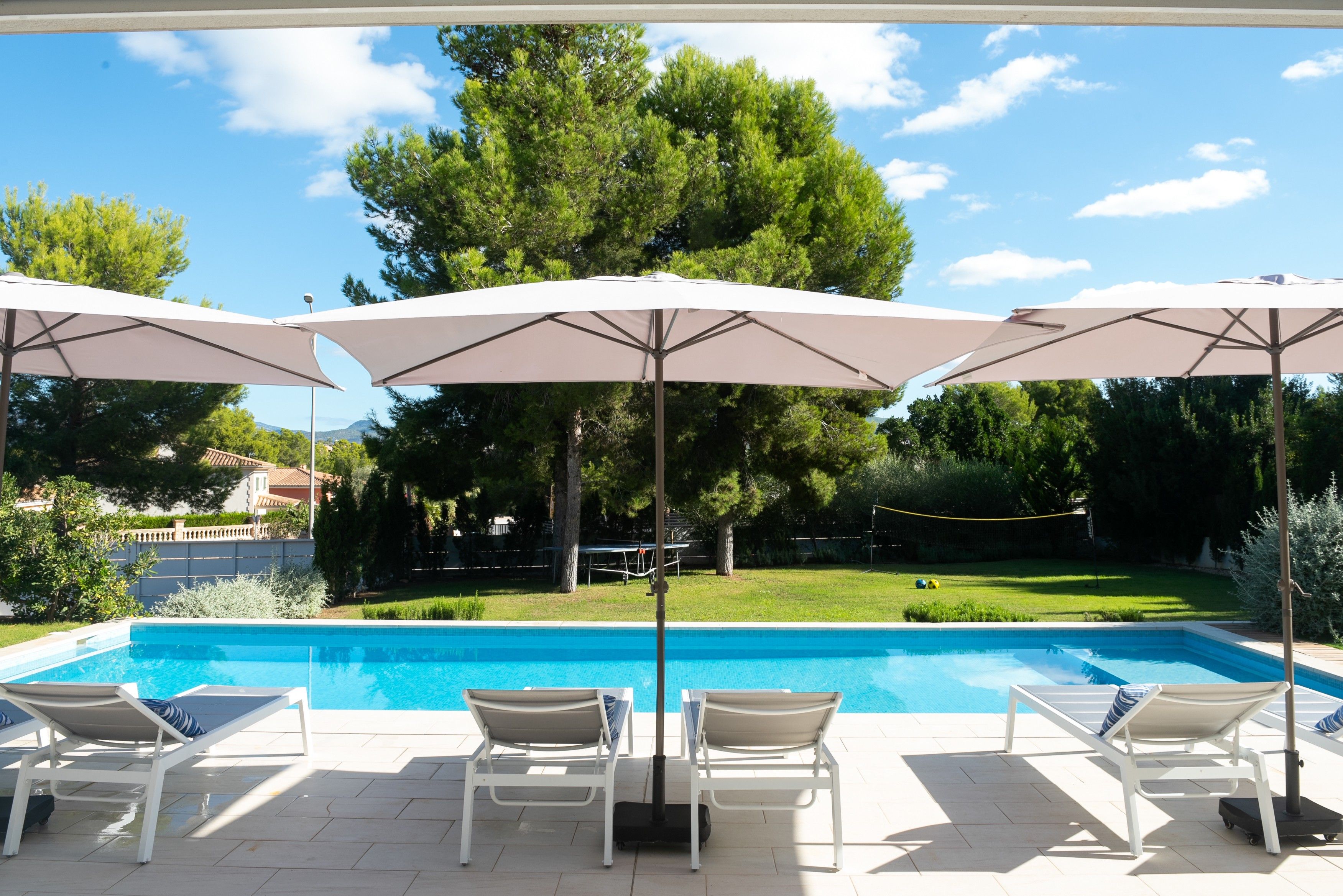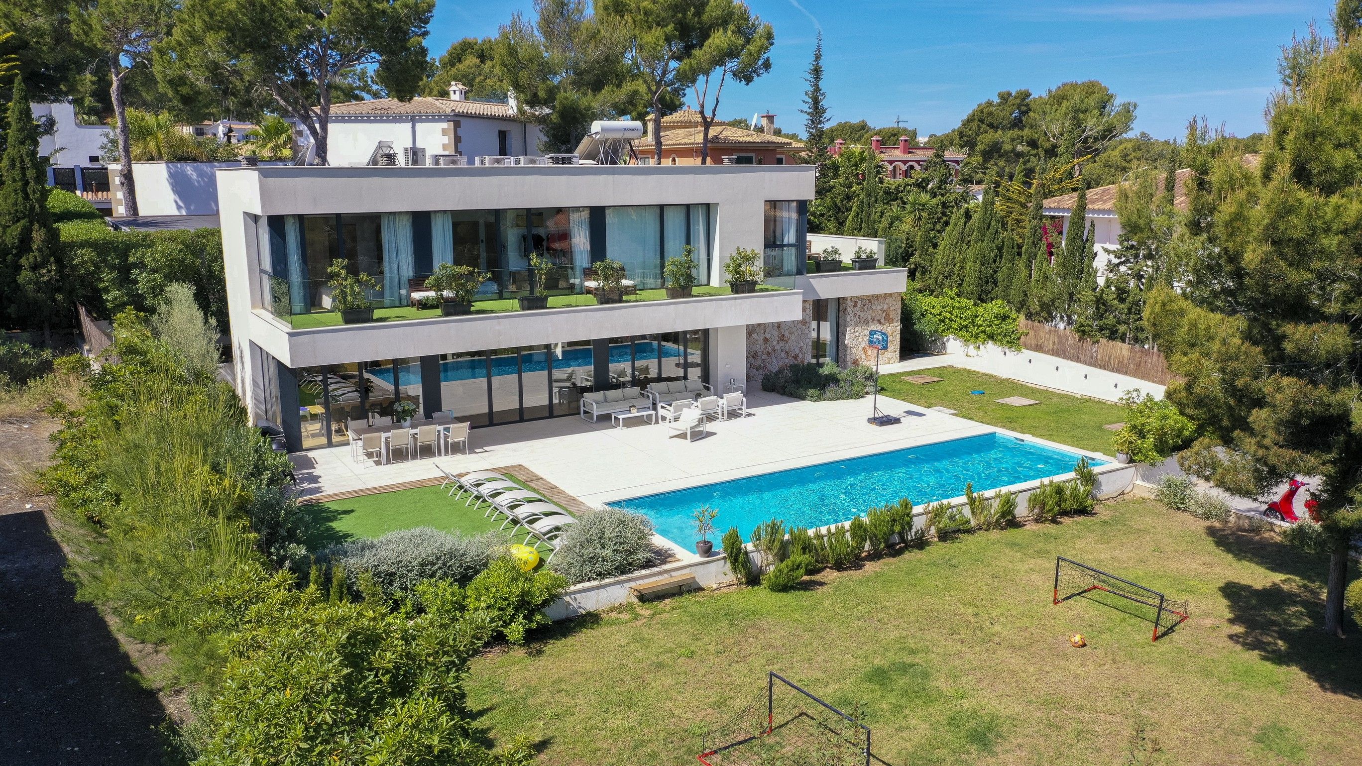Opholds- og spisestuen har et moderne åbent design med masser af naturligt lys og en sømløs forbindelse til det fuldt udstyrede køkken. Udendørs er der en anden spise- og opholdsstue under en stor veranda med udsigt over den imponerende 12x4 meter store pool, perfekt til afslapning eller underholdning. Villaen er omgivet af en privat have og en multifunktionel legeplads, hvor du kan nyde aktiviteter som fodbold, basketball, badminton og bordtennis.