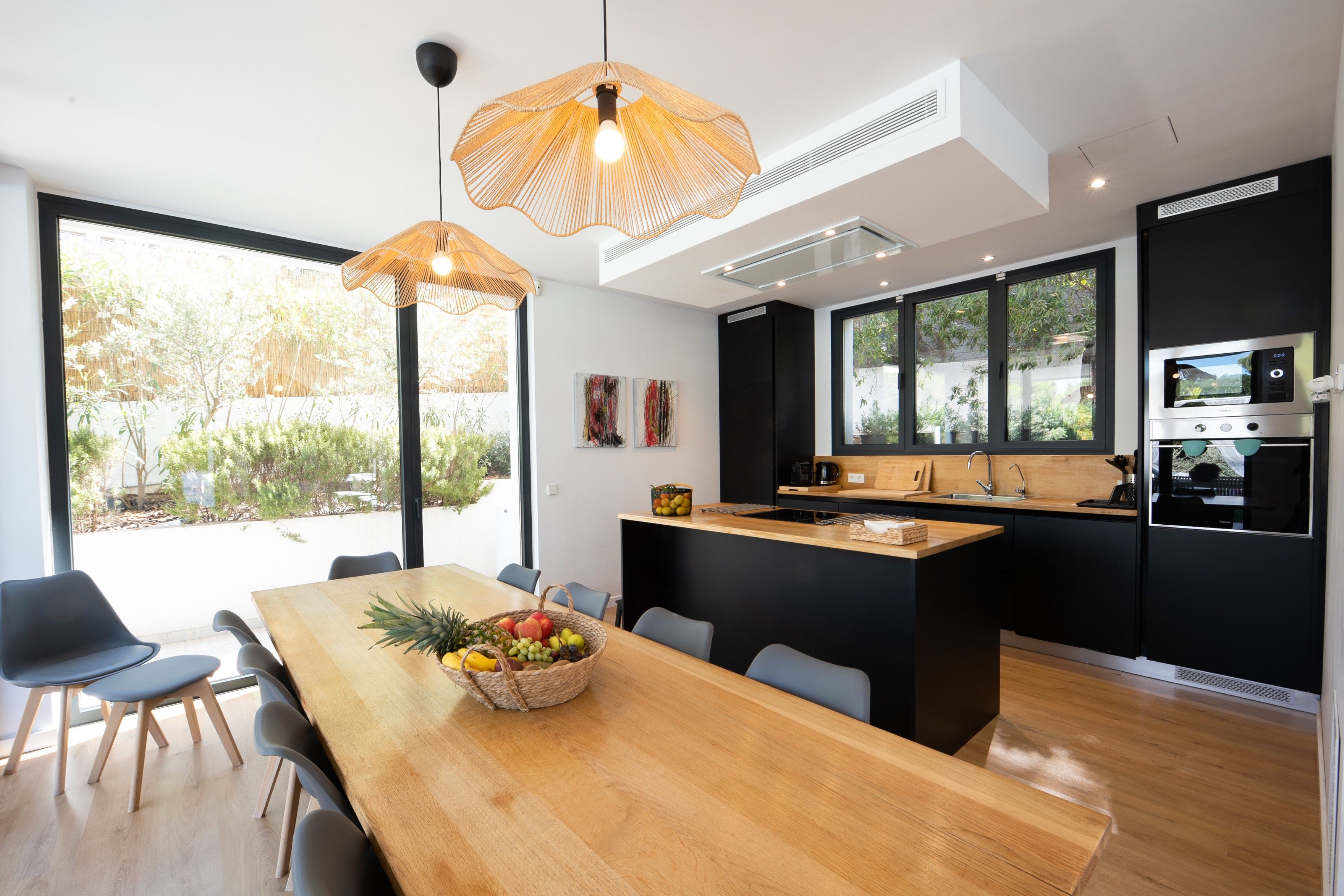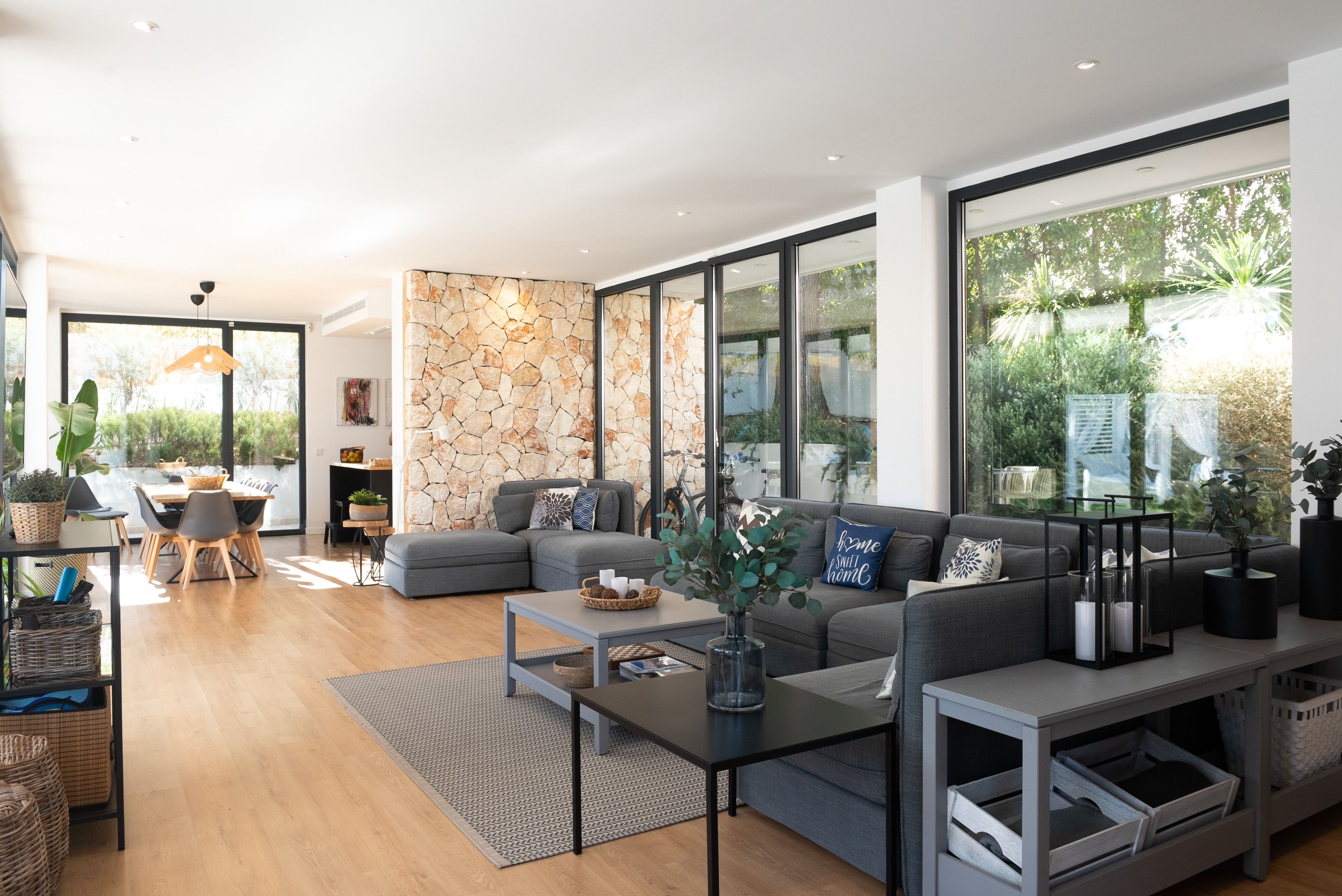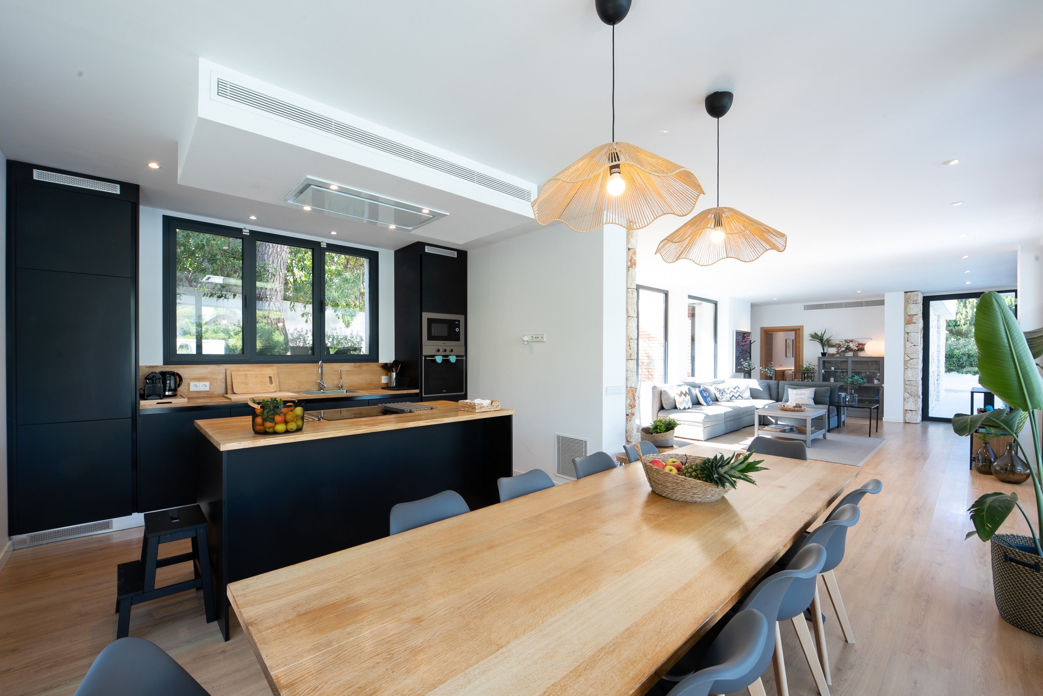 Opholds- og spisestuen har et moderne åbent design med masser af naturligt lys og en sømløs forbindelse til det fuldt udstyrede køkken. Udendørs er der en anden spise- og opholdsstue under en stor veranda med udsigt over den imponerende 12x4 meter store pool, perfekt til afslapning eller underholdning. Villaen er omgivet af en privat have og en multifunktionel legeplads, hvor du kan nyde aktiviteter som fodbold, basketball, badminton og bordtennis.