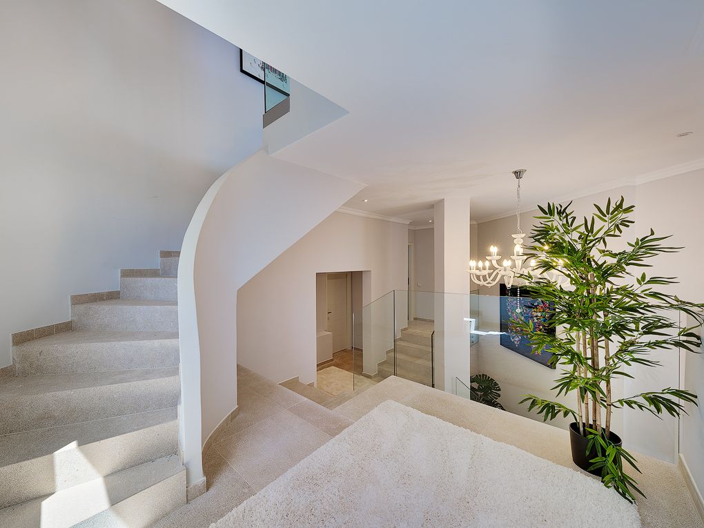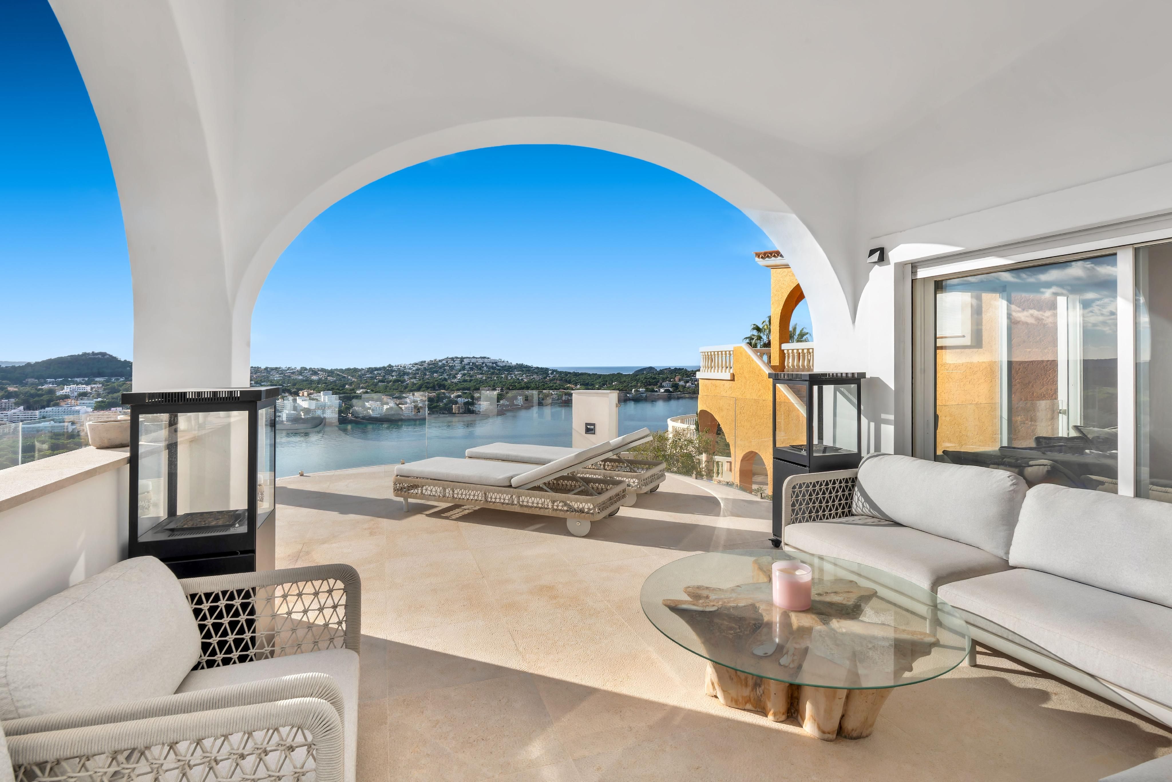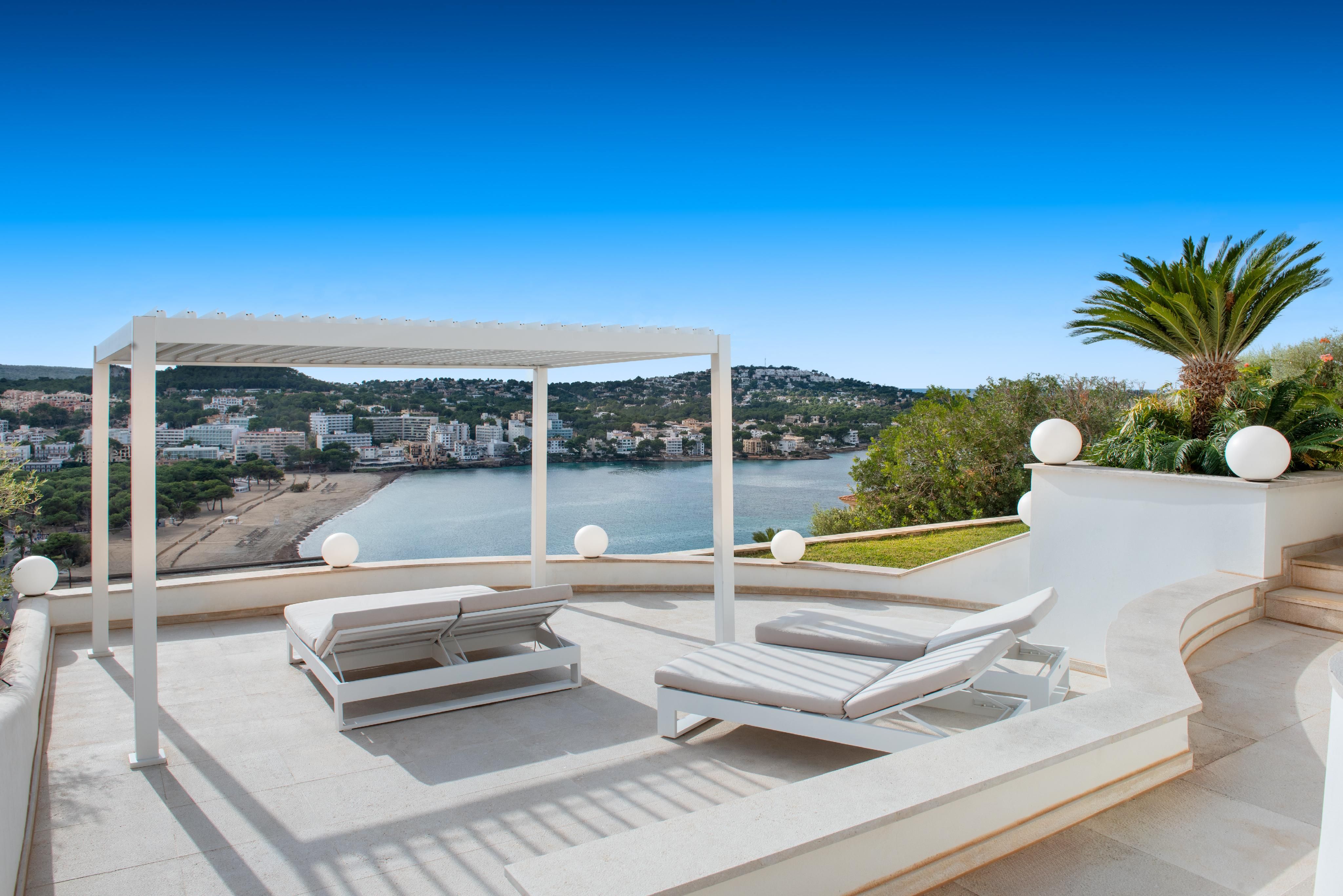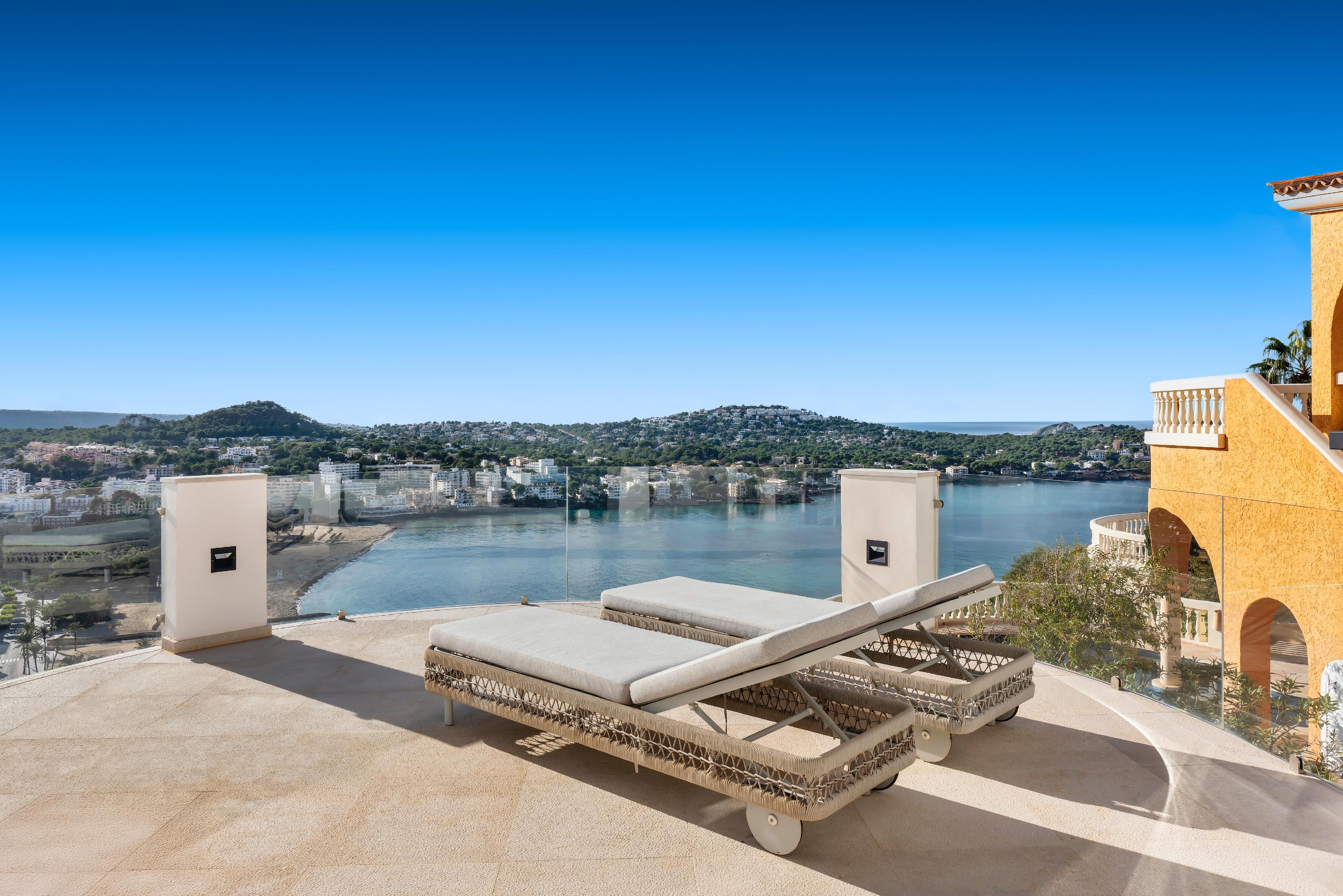 Med sin unikke beliggenhed på en bakke i Santa Ponsa har denne eksklusive moderne villa en fantastisk udsigt over hele stranden i Santa Ponsa til det åbne dybblå hav og det omkringliggende grønne landskab. Nyd mange rolige og afslappende timer ved poolen og på liggestolene, mens du bliver brun af den mallorcinske sol. Villaen imponerer med sit ekstravagante design, og ved at kombinere modernitet og hygge er der skabt et perfekt boligkoncept. Den blev for nylig renoveret i moderne stil og har en stor lys stue med spiseplads og åbent køkken. Desuden er der en rummelig mastersuite med påklædningsværelse og yderligere to soveværelser med eget badeværelse. Der er mulighed for en elevator og for et fitnessrum. I kombination med den smukke arkitektur og den meget gode indretning opfylder villaen de højeste boligstandarder og er både et ideelt feriedomicil og et helårshjem for hele familien. Yderligere funktioner som klimaanlæg w/c, gulvvarme, pejs, elektriske skodder, opvarmet saltvandspool, opbevaringsrum og garage til 2 biler fuldender denne drømmevilla.