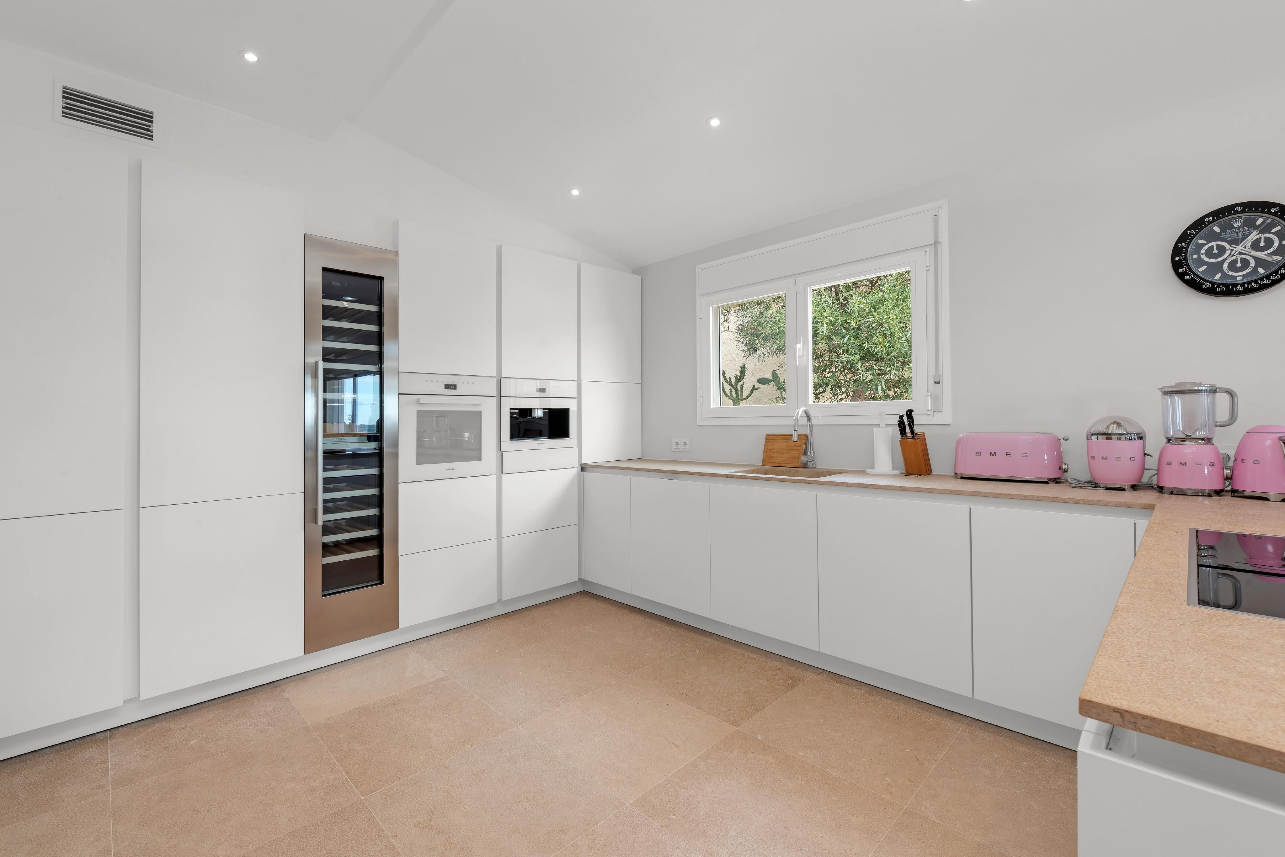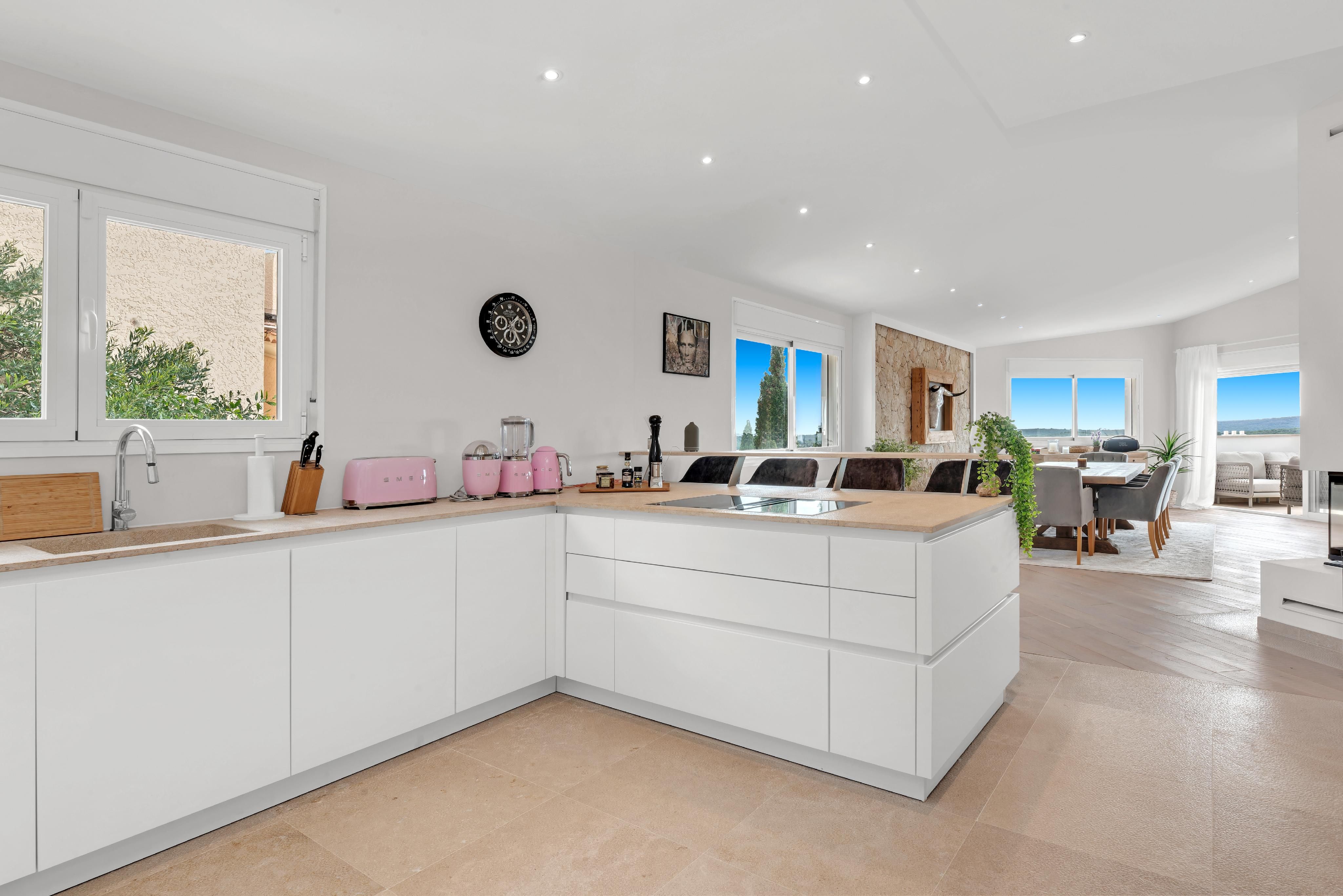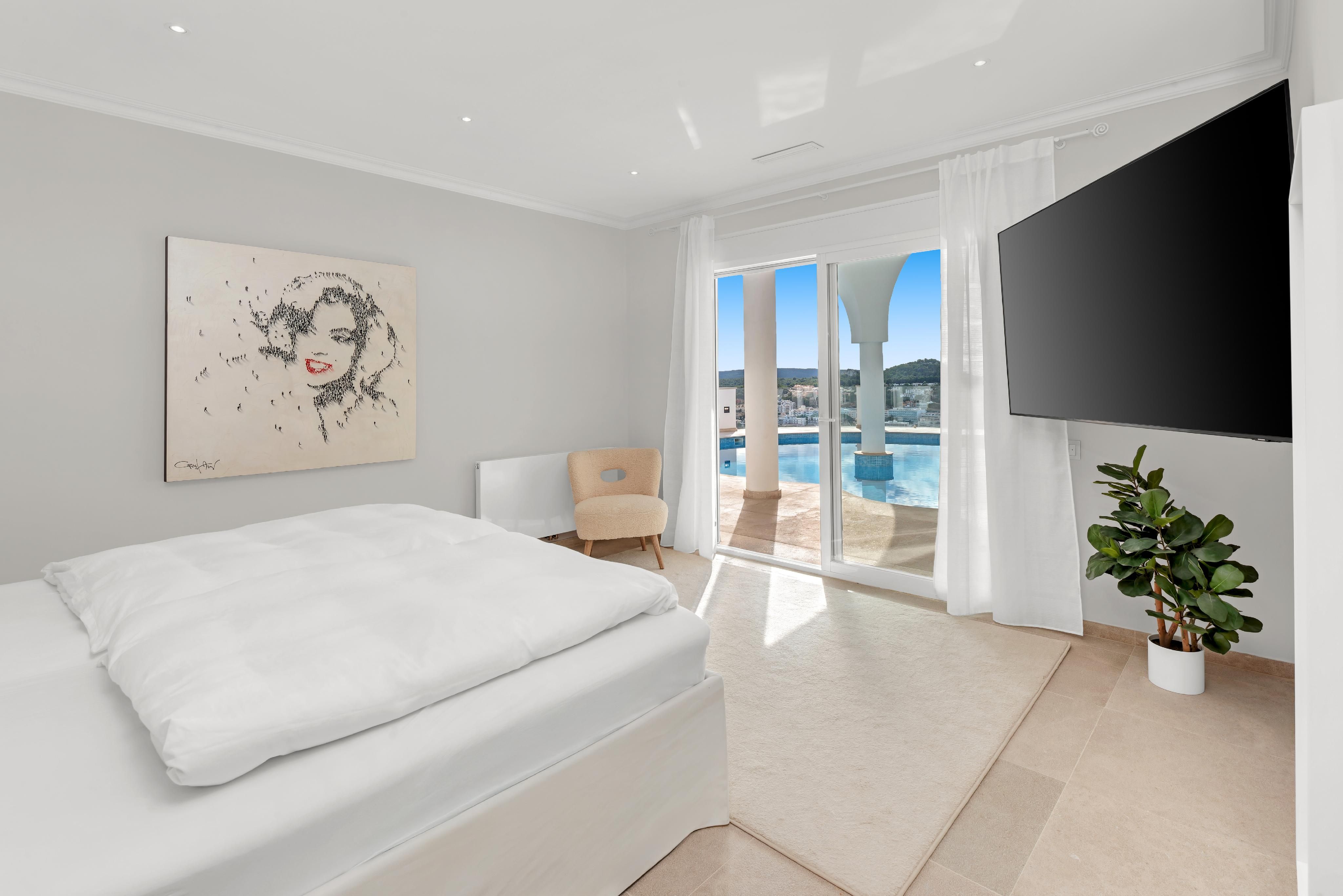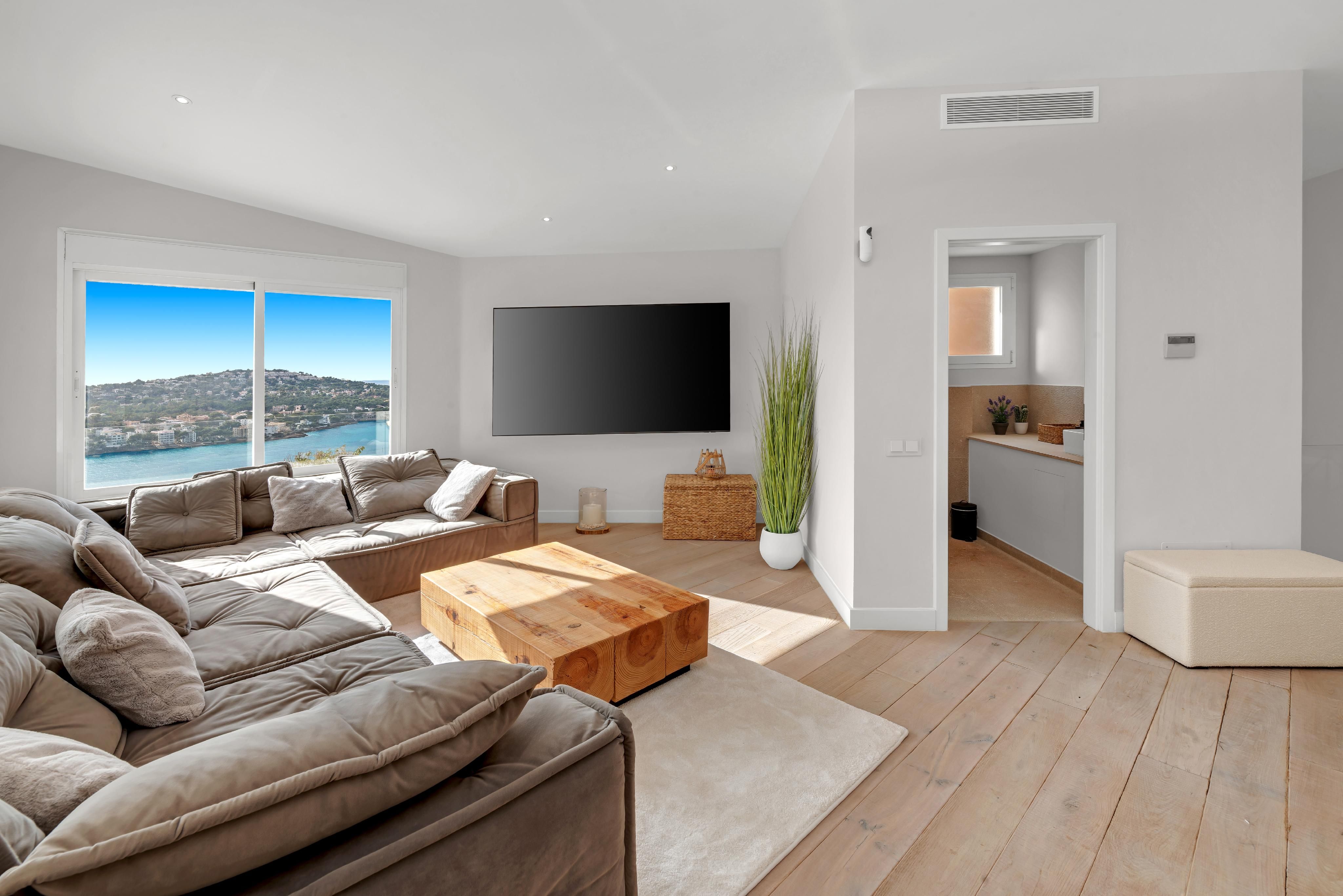 Med sin unikke beliggenhed på en bakke i Santa Ponsa har denne eksklusive moderne villa en fantastisk udsigt over hele stranden i Santa Ponsa til det åbne dybblå hav og det omkringliggende grønne landskab. Nyd mange rolige og afslappende timer ved poolen og på liggestolene, mens du bliver brun af den mallorcinske sol. Villaen imponerer med sit ekstravagante design, og ved at kombinere modernitet og hygge er der skabt et perfekt boligkoncept. Den blev for nylig renoveret i moderne stil og har en stor lys stue med spiseplads og åbent køkken. Desuden er der en rummelig mastersuite med påklædningsværelse og yderligere to soveværelser med eget badeværelse. Der er mulighed for en elevator og for et fitnessrum. I kombination med den smukke arkitektur og den meget gode indretning opfylder villaen de højeste boligstandarder og er både et ideelt feriedomicil og et helårshjem for hele familien. Yderligere funktioner som klimaanlæg w/c, gulvvarme, pejs, elektriske skodder, opvarmet saltvandspool, opbevaringsrum og garage til 2 biler fuldender denne drømmevilla.