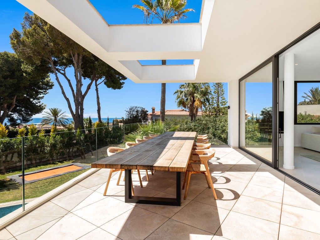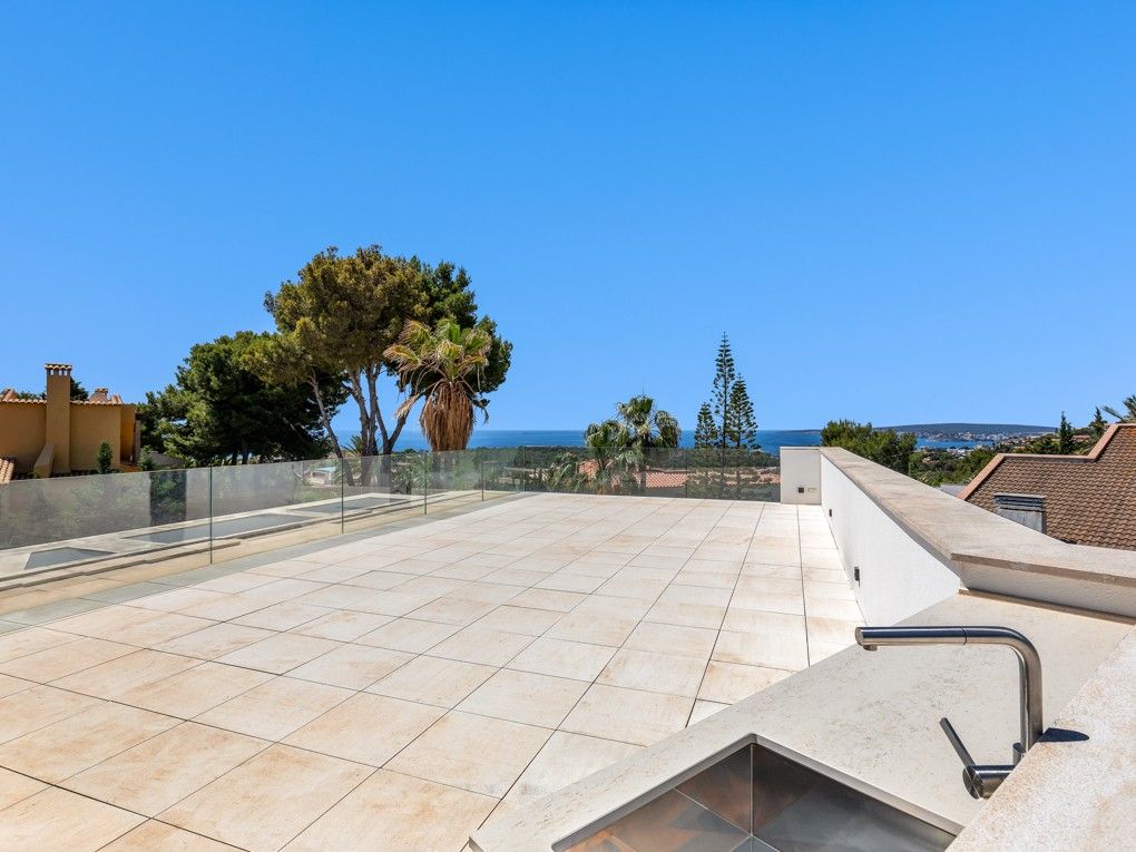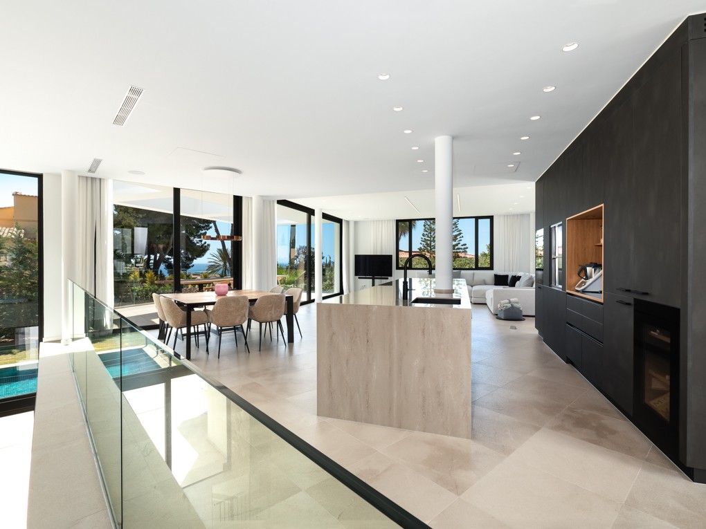 Denne udsøgte villa har en førsteklasses beliggenhed på en rummelig, flad grund, der er perfekt til familier med børn. Nyd den betagende hav- og panoramaudsigt fra alle niveauer i denne fantastiske ejendom. Villaen er fordelt på tre niveauer. I stueetagen er der fire soveværelser med eget bad, et gæstetoilet og direkte adgang til en garage til to biler. Alle soveværelserne har direkte adgang til den store have i stueetagen med en stor saltvandspool og et udendørs køkken - perfekt til afslapning og underholdning på smukke solskinsdage. Et par trin fører til første sal, hvor du finder det store soveværelse med en privat terrasse med udsigt over havet. Dette niveau omfatter også en lys opholds- og spisestue med et fuldt udstyret køkken i åbent plan. Nyd den smukke havudsigt, mens du laver mad, spiser eller nyder et glas vin på den tilstødende terrasse. Den rummelige tagterrasse byder på en enestående udsigt over både bjergene og havet og er den perfekte ramme for afslapning efter en lang dag. Yderligere funktioner inkluderer: aircondition (varmt/koldt), gulvvarme, solsystem, indbyggede skabe i alle værelser, naturstensgulve, alarmsystem, separat vaskerum og vareelevator. Denne villa blander problemfrit luksus, komfort og bekvemmelighed, hvilket gør den til et ideelt hjem for dem, der søger en enestående boligoplevelse.
