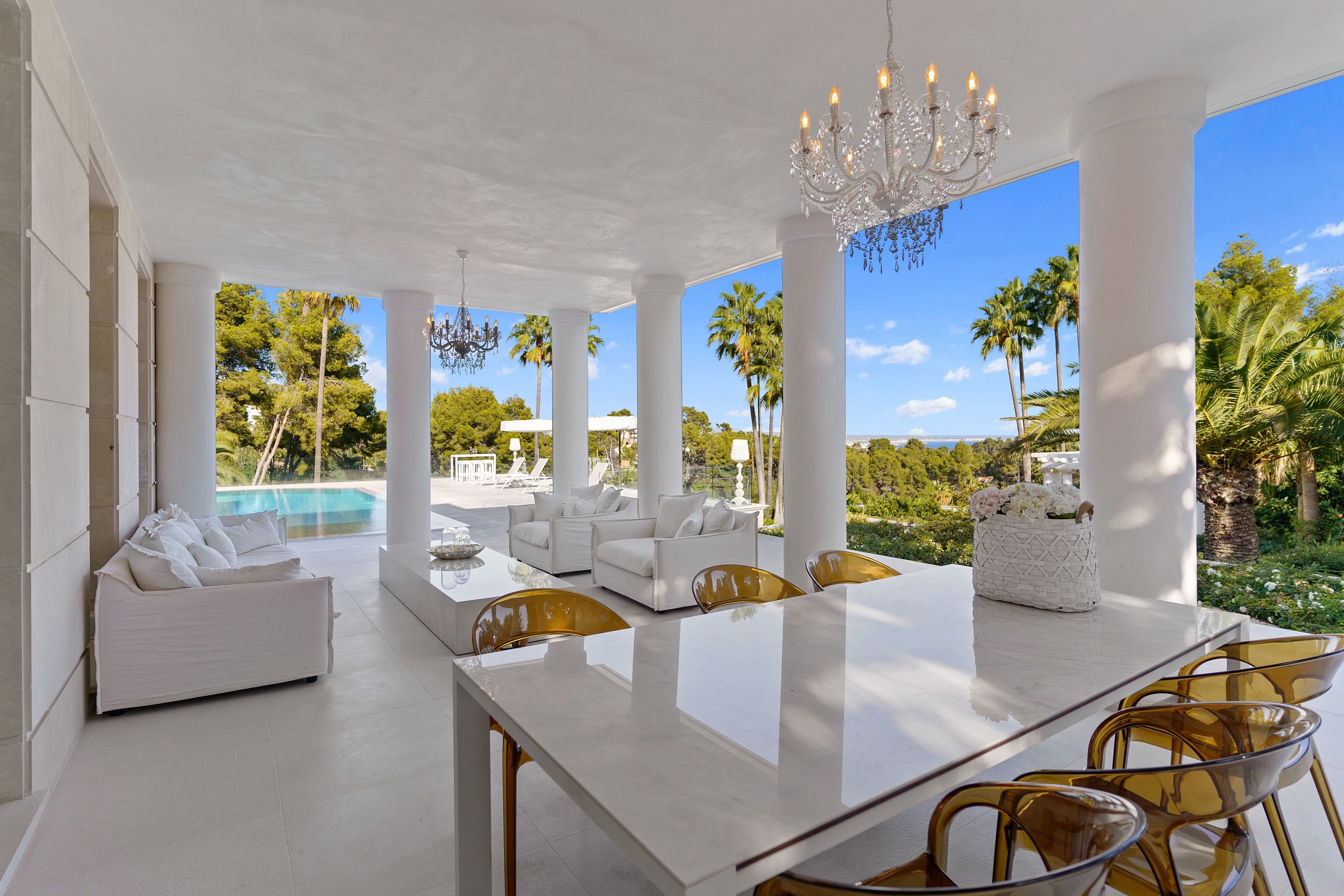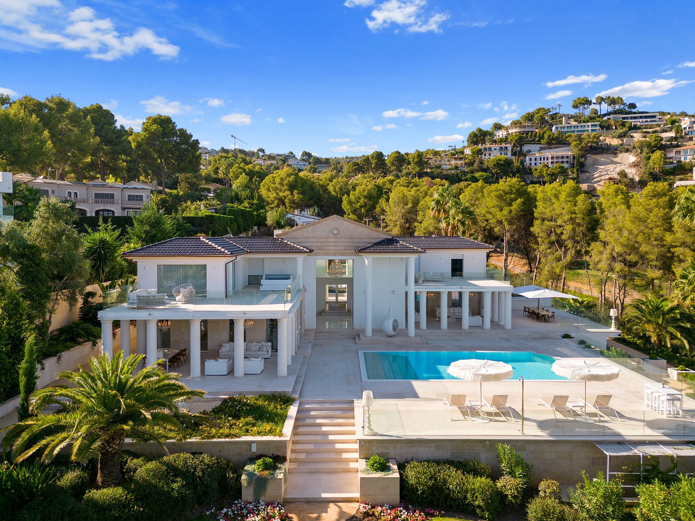Denne villa i neoklassisk stil med fantastisk udsigt over Palmabugten er for nylig blevet totalrenoveret efter de højeste standarder for at skabe en virkelig eksklusiv designer-ejendom. Den er omgivet af en pragtfuld anlagt have med et stort poolområde, forskellige terrasser og en tennisbane i fuld størrelse.