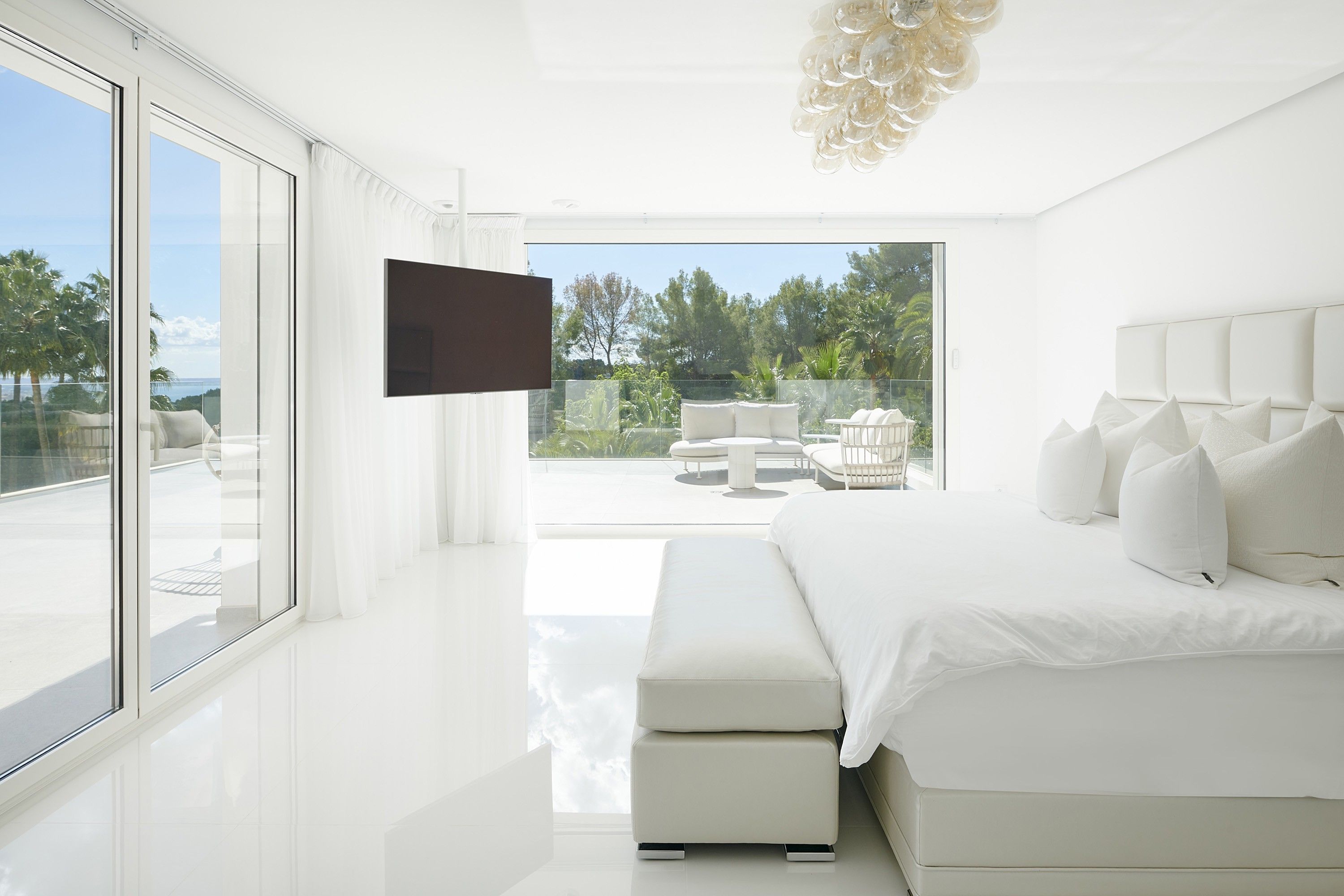 Ovenpå til højre ligger det meget rummelige soveværelse med et vidunderligt badeværelse, meget specielle walk-in closets og en stor terrasse med udendørs jacuzzi og vidunderlig udsigt over havet. Ovenpå til venstre er et andet meget rummeligt soveværelse med en-suite badeværelse, walk-in closet og kontor.