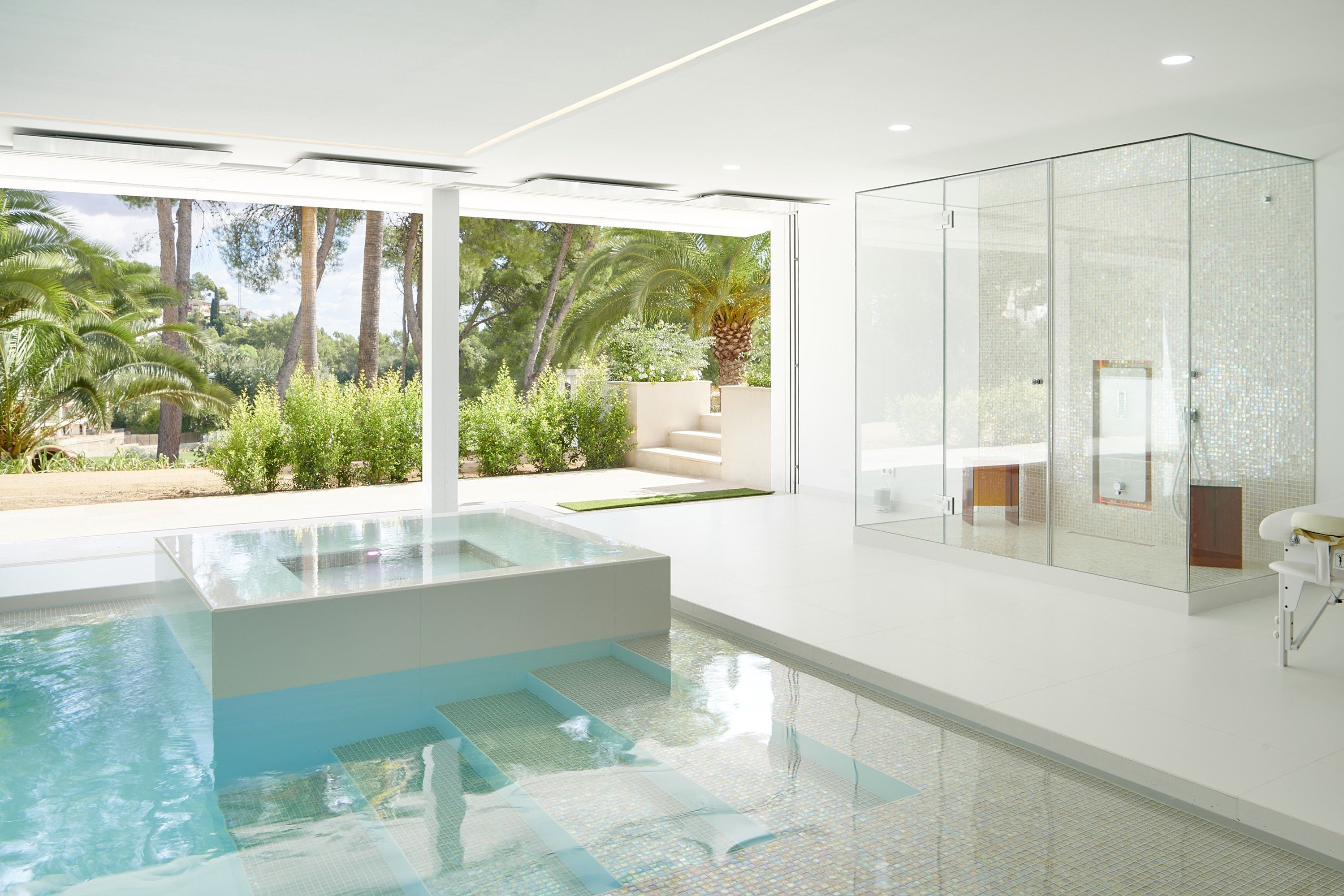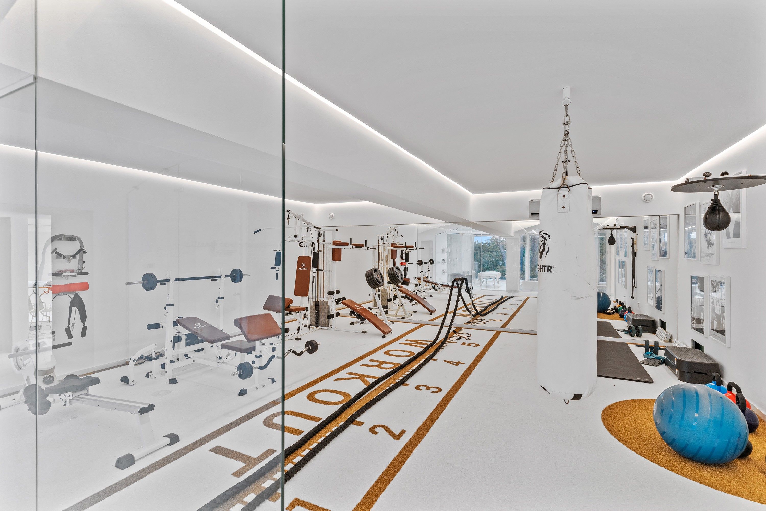 Den nederste etage med direkte adgang til haven er måske den sjoveste, da den byder på en række rekreative muligheder, herunder et barområde med pejs, indendørs pool med dampbad og massageområde, et fuldt udstyret fitnesscenter, en hjemmebiograf, skønhedssalon og indendørs driving range.