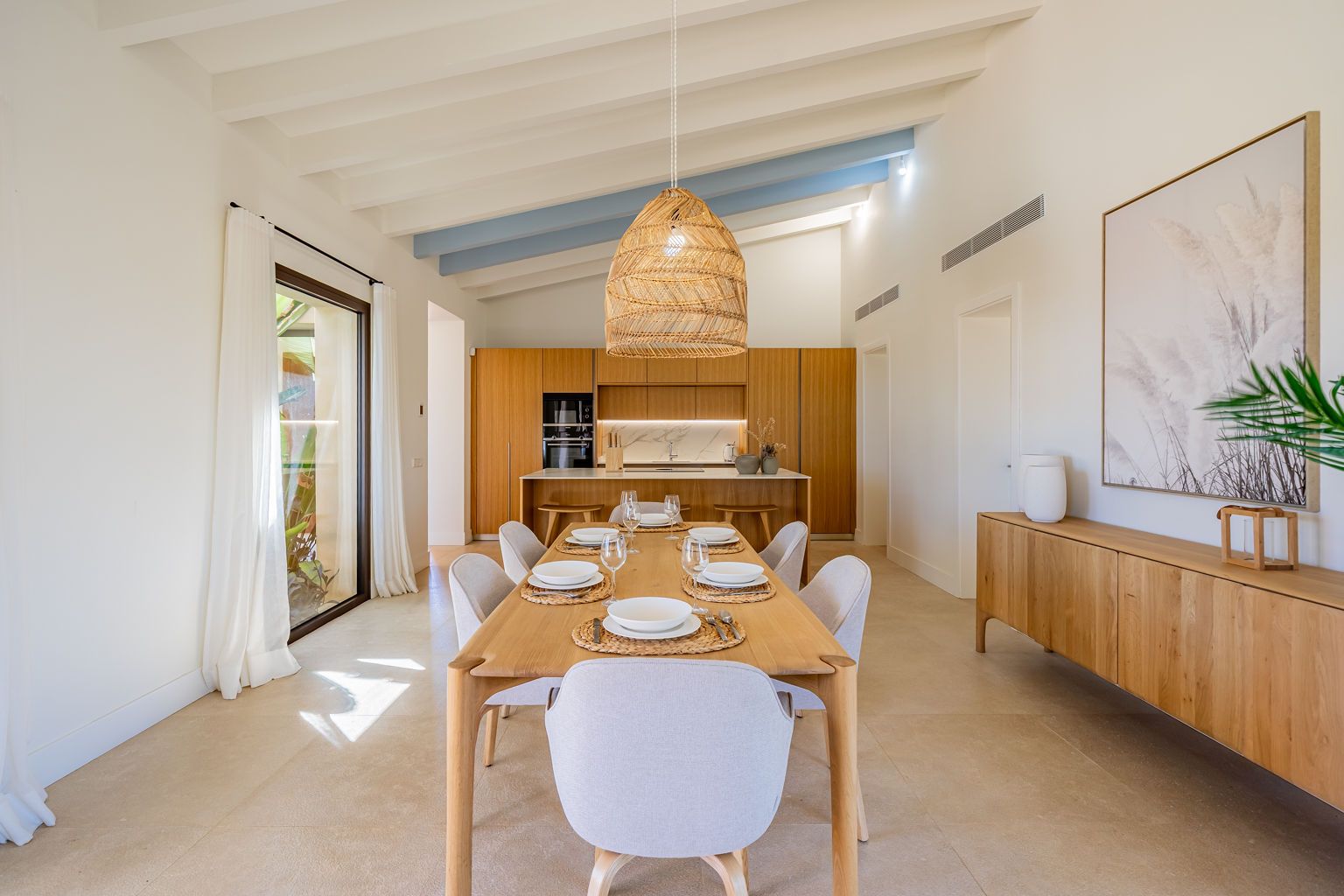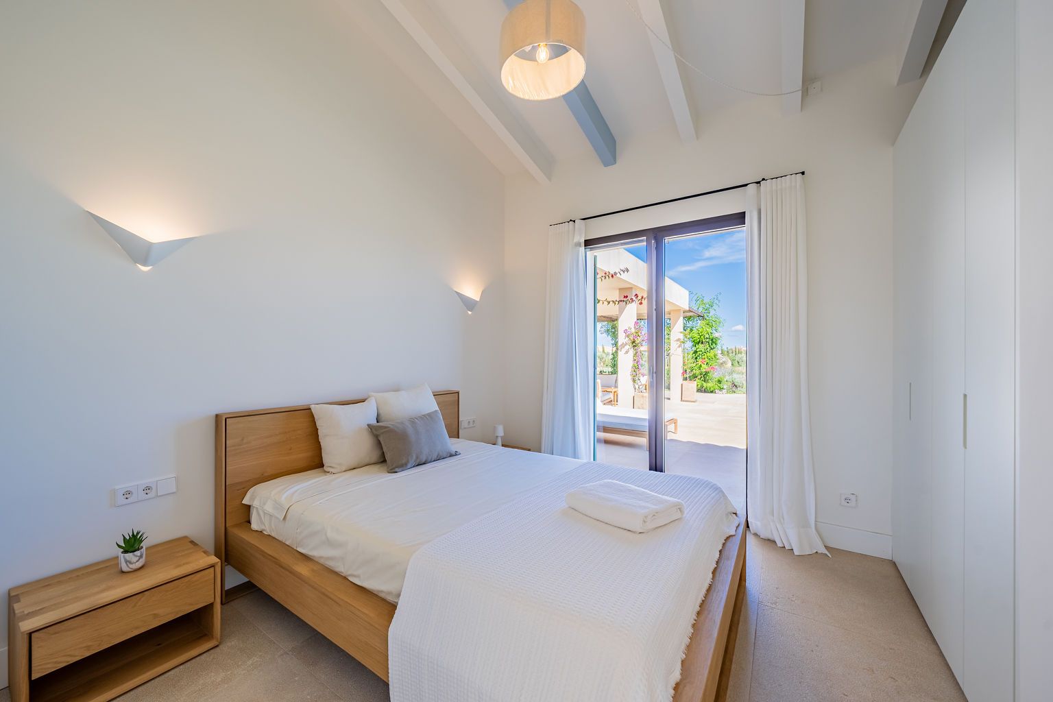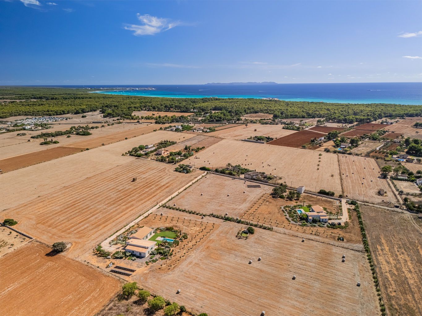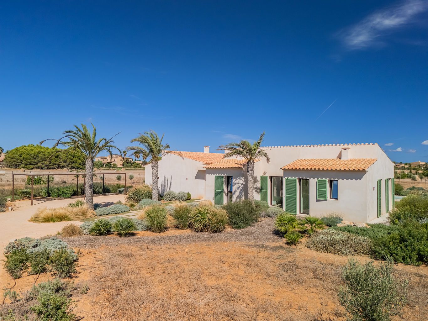 Kun få minutter fra den berømte naturstrand Es Trenc i Sa Ràpita kommune ligger denne finca, der blev færdigbygget i 2025, i en stille blindgyde med kun seks naboer. Grunden på ca. 16.358 m² er hjemsted for en finca, der passer perfekt ind i omgivelserne. Med sin enestående sydvendte orientering, rummelige terrasser og uforstyrrede udsigt over bjergene tilbyder den en unik og afslappende atmosfære. Der blev brugt materialer af høj kvalitet til byggeriet, mens indretningen blev valgt fra en kendt møbelbutik i Palma. Når man kommer ind i huset, bliver man mødt af et lyst indgangsparti med et stort vindue, der giver en fantastisk panoramaudsigt over haven og landskabet. I den venstre fløj er der et stort åbent rum, der med succes kombinerer køkken, stue og spisestue med pejs. På samme side er der et maskinrum, et vaskerum, et spisekammer og et gæstebadeværelse. I husets venstre fløj er der to rummelige soveværelser med indbyggede skabe, som deler et elegant badeværelse med fliser fra det anerkendte firma Huguet i Campos. For enden af gangen ligger det store soveværelse, en sand oase af luksus, der er designet med stor opmærksomhed på detaljer. Alle værelser i huset har direkte adgang til udendørsområdet, hvor der er en saltvandspool omgivet af flere terrasser. Sommerens spiseplads med udendørs køkken fuldender helheden og gør omgivelserne til det perfekte sted at nyde udelivet. Derudover har ejendommen et solsystem, der producerer 10 kW elektricitet. Ud over denne ejendom har den samme ejer en anden ejendom med fire soveværelser, hvilket gør disse to huse til det ideelle valg for to vennefamilier eller en stor familie. Ejendommen ligger kun 15 minutters kørsel fra Campos og Llucmajor, og Mallorcas lufthavn kan nås på 35 minutter via den nye motorvej.