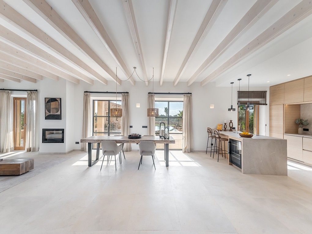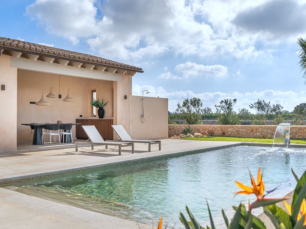 Denne nybyggede finca er færdigbygget på en 14.300 m² stor, landlig og rolig grund i nærheden af Es Llombards. Det er et repræsentativt landsted med en stor pool og ca. 24 m² overdækket terrasse ved poolen samt en anden bygning på ca. 52 m² i typisk landlig stil med udstyr af høj kvalitet. I stueetagen er der et rummeligt indgangsparti, en lys stue og spiseplads med pejs, et integreret, fuldt udstyret køkken med kogeø (Miele eller Gaggenau apparater), et gæstetoilet og et soveværelse med en-suite badeværelse. På øverste etage er der yderligere tre soveværelser, alle med eget badeværelse. Det store soveværelse har en terrasse med smuk udsigt over landskabet. Middelhavshaven har forskellige terrasser og overdækkede siddepladser samt en 48 m² stor swimmingpool med vandfald. En overdækket terrasse med sommerkøkken og udendørs bruser er også inkluderet. En anden bygning, som kan rumme et ekstra soveværelse med en-suite badeværelse, fuldender dette byggeprojekt. Gulvvarme i hele huset og aircondition i alle soveværelser sikrer en behagelig temperatur året rundt. Andre funktioner omfatter automatisk vanding, varmtvandsbehandling ved hjælp af solpaneler, luftvarmepumper, et alarmsystem, udendørs kameraer og et "Sonos"-musiksystem. Landsbyen Es Llombards ligger kun 3 minutters kørsel væk, og landsbyen Santanyí med sit farverige ugentlige marked og forskellige butikker ligger kun 6 minutters kørsel væk. Lufthavnen ligger ca. 50 km væk.