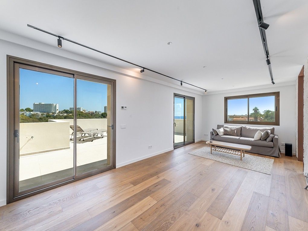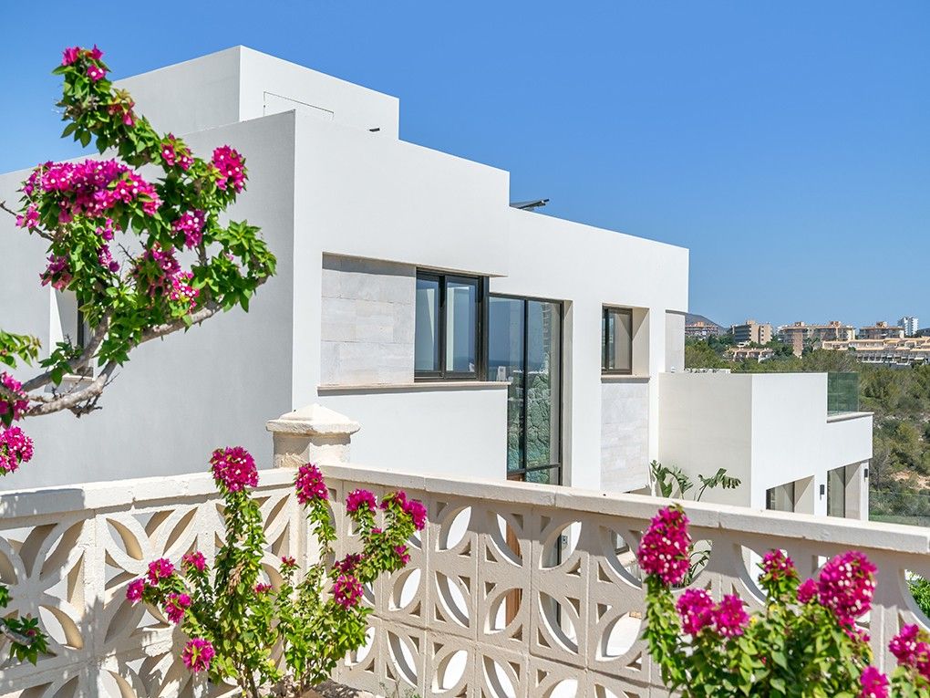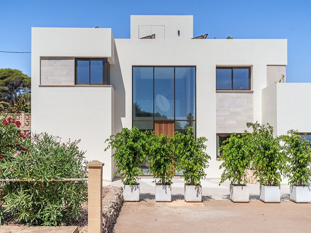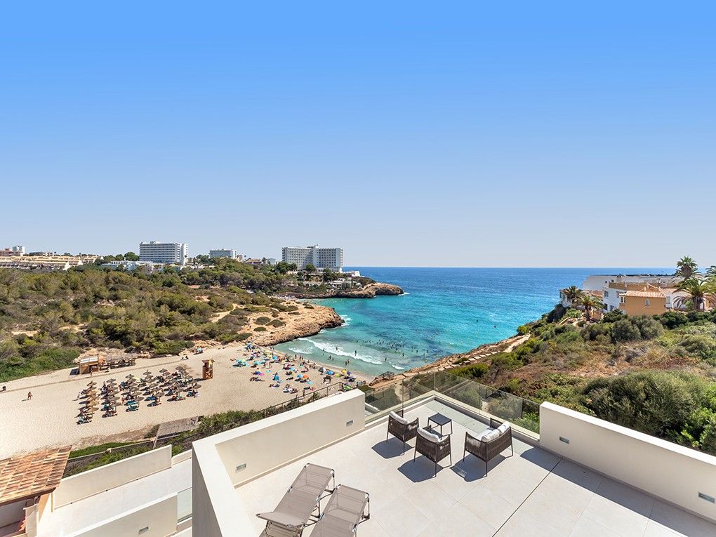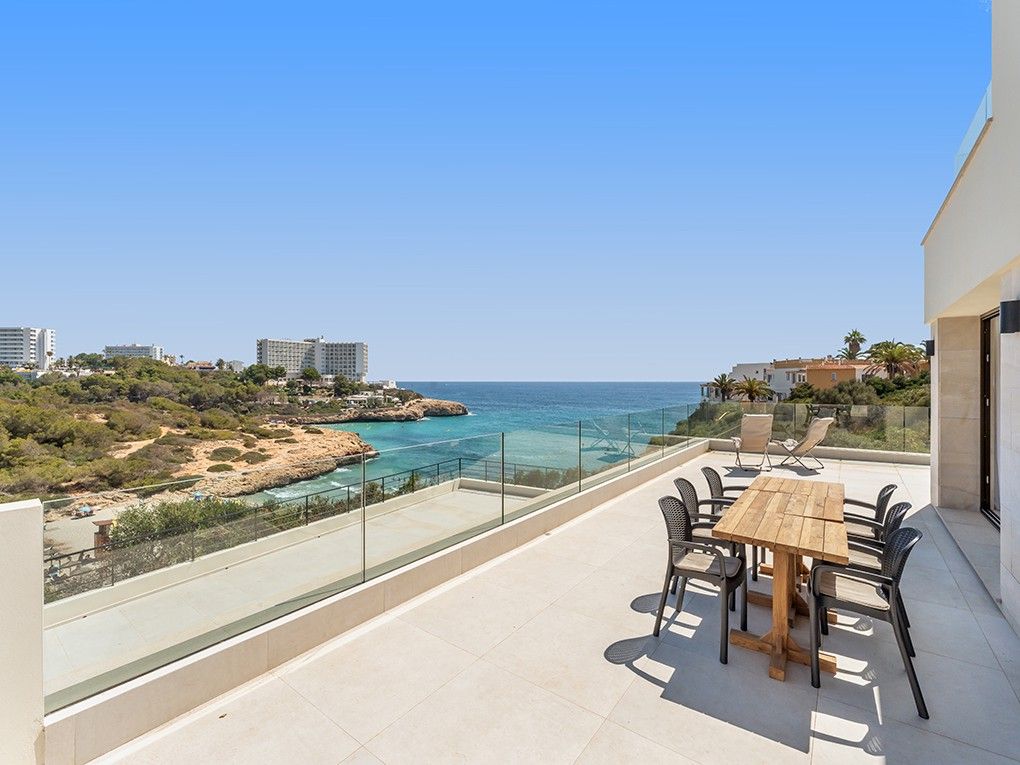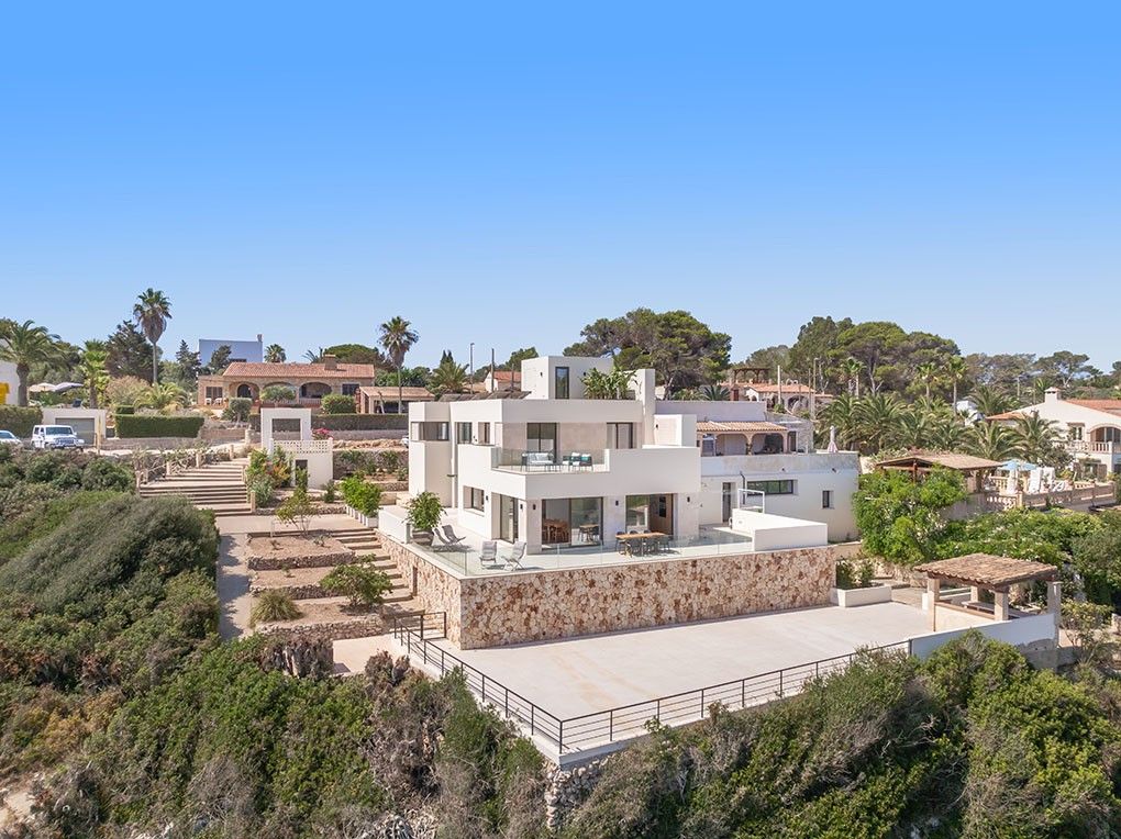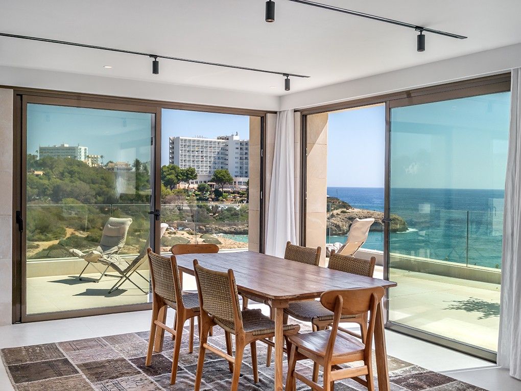 Kun få meter fra den fantastiske Cala Domingos-bugt ligger denne nyrenoverede villa majestætisk på en bjergskråning. Ejeren har nænsomt restaureret ejendommen med materialer af høj kvalitet og sans for detaljer, hvilket har skabt en sand perle for elskere af moderne arkitektur. Når man kommer ind, bliver man mødt af en lys foyer med dobbelt loftshøjde og en stilfuld naturstensvæg. Til højre er der et charmerende modtagelsesrum, som fører ind i det åbne køkken med spiseplads. Herfra kan man nyde en storslået udsigt over bugten og havet, og man har direkte adgang til den rummelige terrasse. Villaens venstre fløj huser to hyggelige soveværelser, der deler et badeværelse. Et stort multifunktionsrum, et fitnesscenter med brusebad og sauna, et gæstetoilet og et andet rum, der støder op til dobbeltgaragen, fuldender denne etage. På øverste etage finder du det store soveværelse med walk-in closet, et stort badeværelse og en komfortabel stue, der åbner ud til en privat terrasse med havudsigt. På anden sal er der endnu en lille terrasse med tekniske faciliteter og solcelleanlæg. Foran køkkenterrassen er der en ekstra stor terrasse, som giver plads til en valgfri pool. Yderligere to små lejligheder i stueetagen, som er perfekte til personale eller som opbevaringsrum, er inkluderet i salget. Over dem, på øverste etage, er der også to lejligheder, som er under separat ejerskab. Ejendommen imponerer med sine lave vedligeholdelseskrav.
