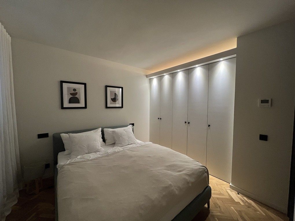 Denne betagende, renoverede og fuldt møblerede luksuslejlighed ligger i centrum af Palma, ikke langt fra det berømte stormagasin El Corte Inglés. Den centrale beliggenhed giver fremragende forbindelser til den gamle bydel, de omkringliggende kvarterer og øens vigtigste transportruter. Lejligheden ligger i en beboelsesejendom af høj kvalitet med førsteklasses faciliteter, herunder tre elevatorer og en skraldeindsamlingsservice. Særligt praktisk: Der er et supermarked i stueetagen, som gør det nemt at foretage de daglige indkøb. Lejligheden ligger på 8. etage, strækker sig over generøse 166 kvm og byder på et gennemtænkt rumlayout. Indgangspartiet fører ind i den rummelige stue med et åbent, luksuriøst designerkøkken, der er udstyret med mærkevareapparater af høj kvalitet. Der er tre soveværelser, hvoraf to har stilfulde en-suite badeværelser. Derudover er der et yderligere rum, der er ideelt til brug som kontor eller bryggers. Det store soveværelse imponerer med en fantastisk udsigt. Et særligt højdepunkt er den 26 m² store terrasse, som er udstyret med en stilfuld spiseplads - perfekt til afslappende aftener eller sociale sammenkomster. Møblerne af høj kvalitet understreger lejlighedens luksuriøse karakter: designermøbler fra førsteklasses italienske mærker, en Miele-vaskemaskine og -tørretumbler samt topmoderne underholdningsteknologi såsom et 65-tommers Sony Bravia-tv og et integreret lydsystem. Beliggenheden byder på en fremragende infrastruktur med en bred vifte af indkøbsmuligheder, caféer og restauranter. Takket være nærheden til den gamle bydel er seværdigheder som La Seu-katedralen og havnen inden for rækkevidde. Desuden gør de nærliggende bus- og motorvejsforbindelser det nemt at komme til lufthavnen og Mallorcas smukke strande. En eksklusiv boligoplevelse til de højeste krav på en førsteklasses beliggenhed!