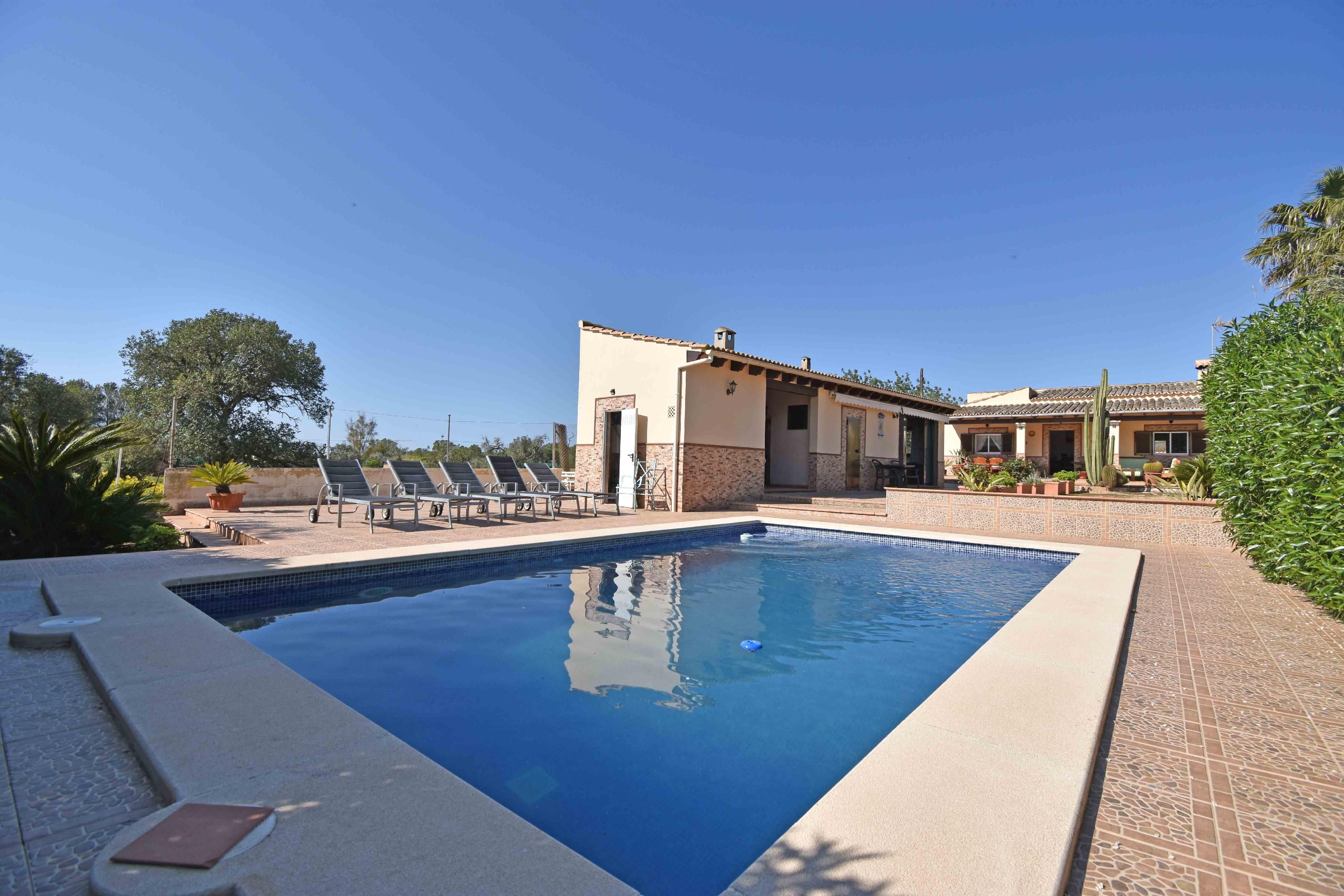 Udenfor er haven smukt anlagt med indfødte planter, herunder palmer, kaktusser og prydplanter, der kræver lidt vedligeholdelse, og som giver ejendommen karakter. Det store, solrige poolområde er omgivet af komfortable liggestole - det ideelle sted at slappe af i de varme måneder. Ved siden af poolen er der et lille uafhængigt gæstehus med køkken, opholdsstue og badeværelse, som er perfekt til grillfester.