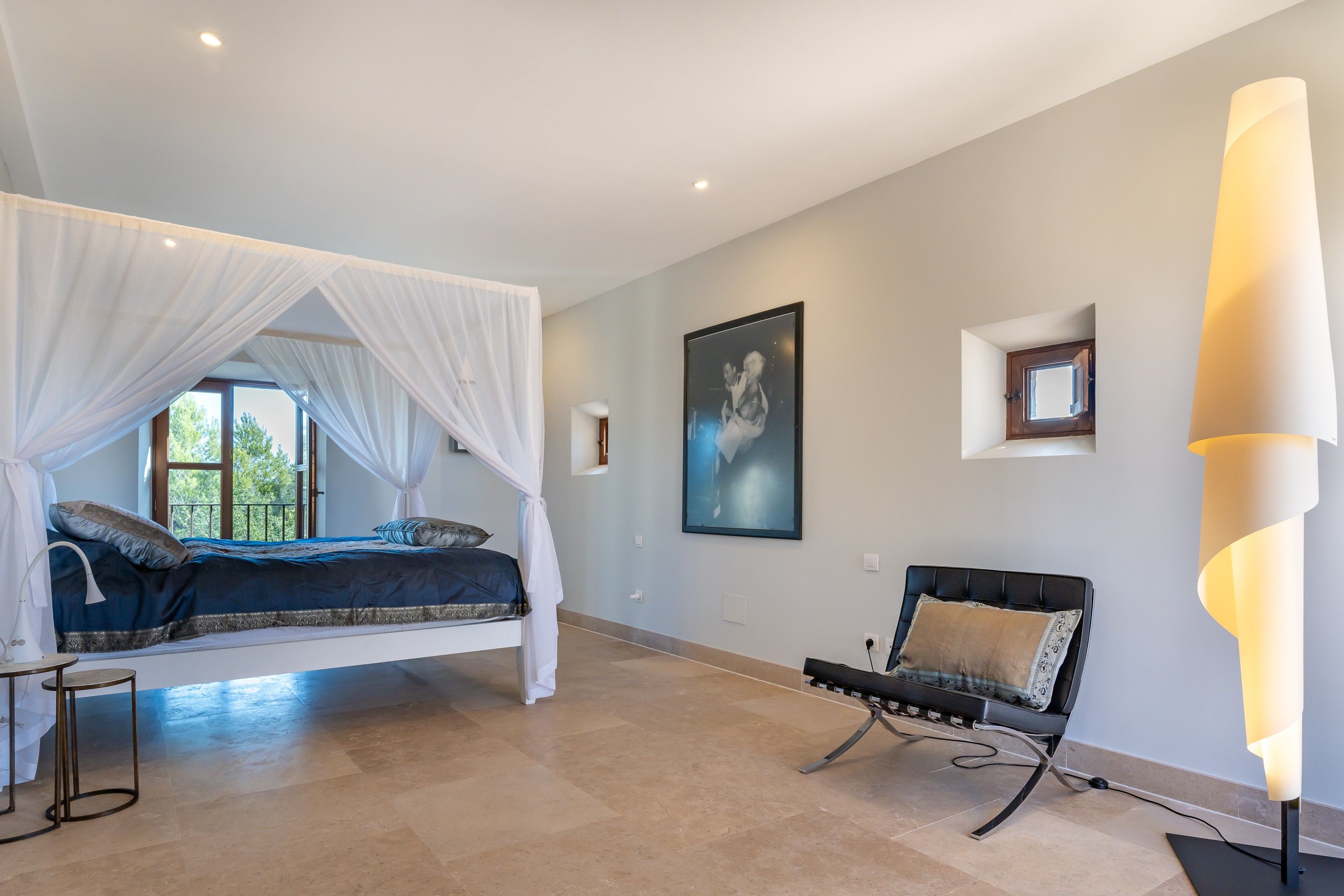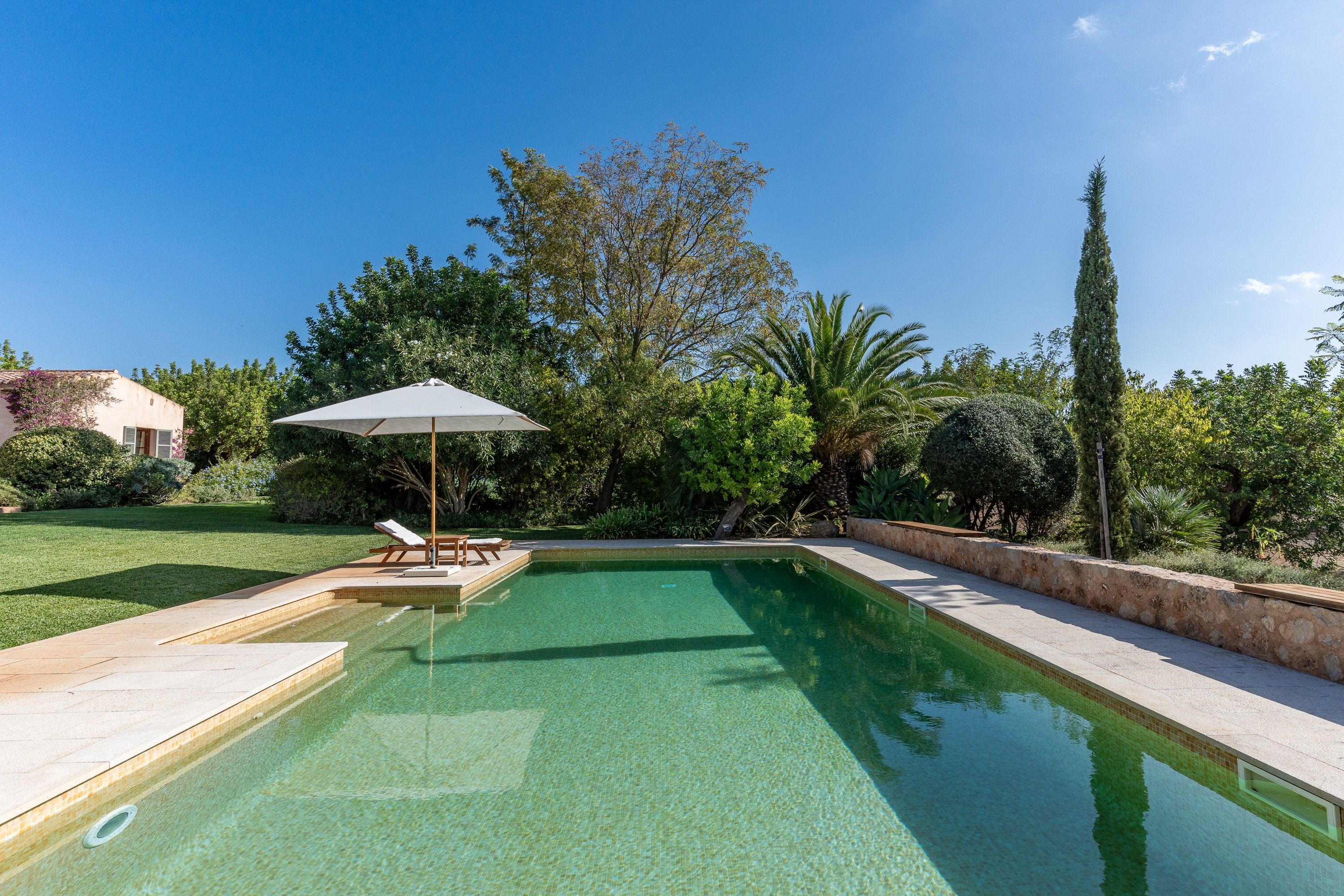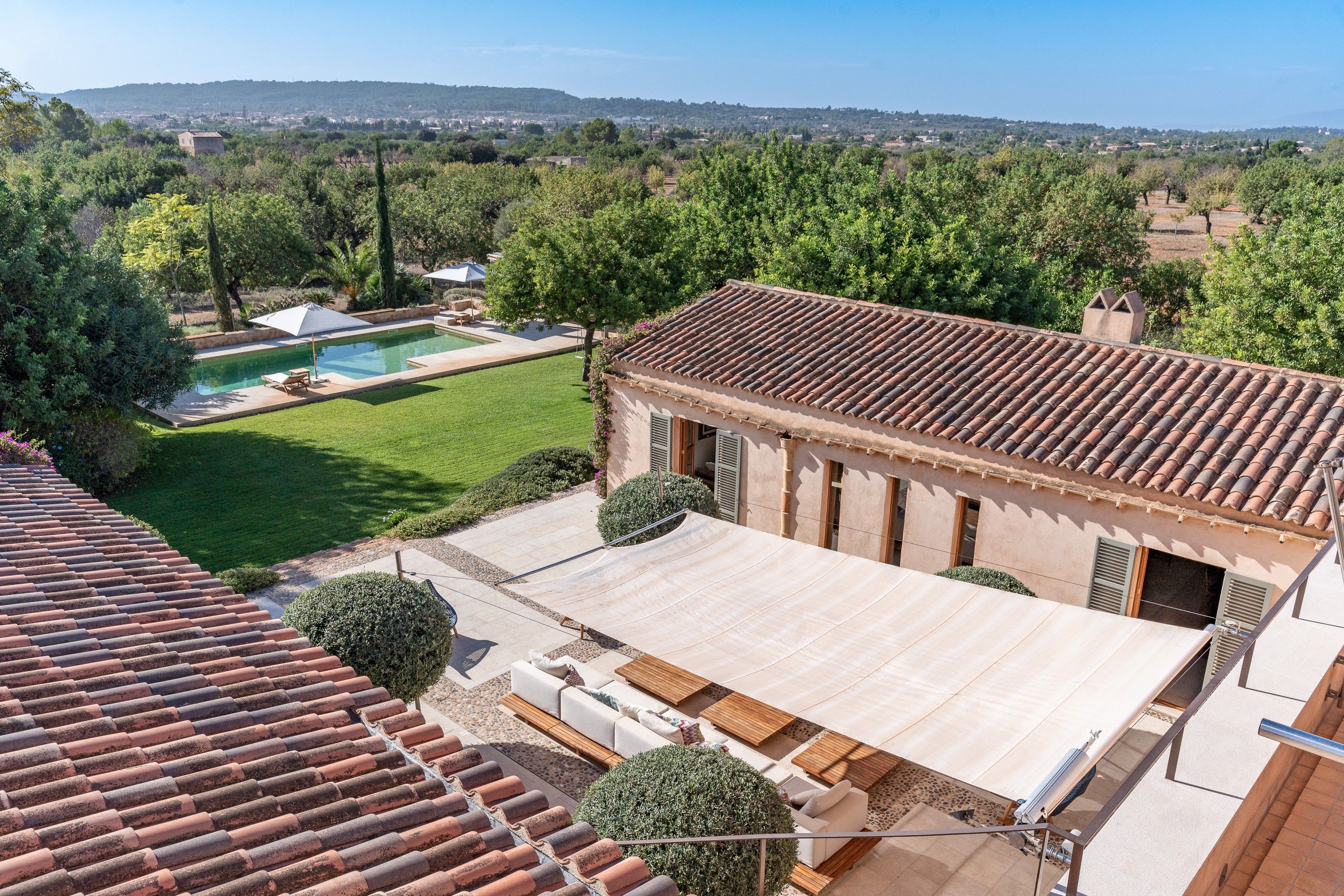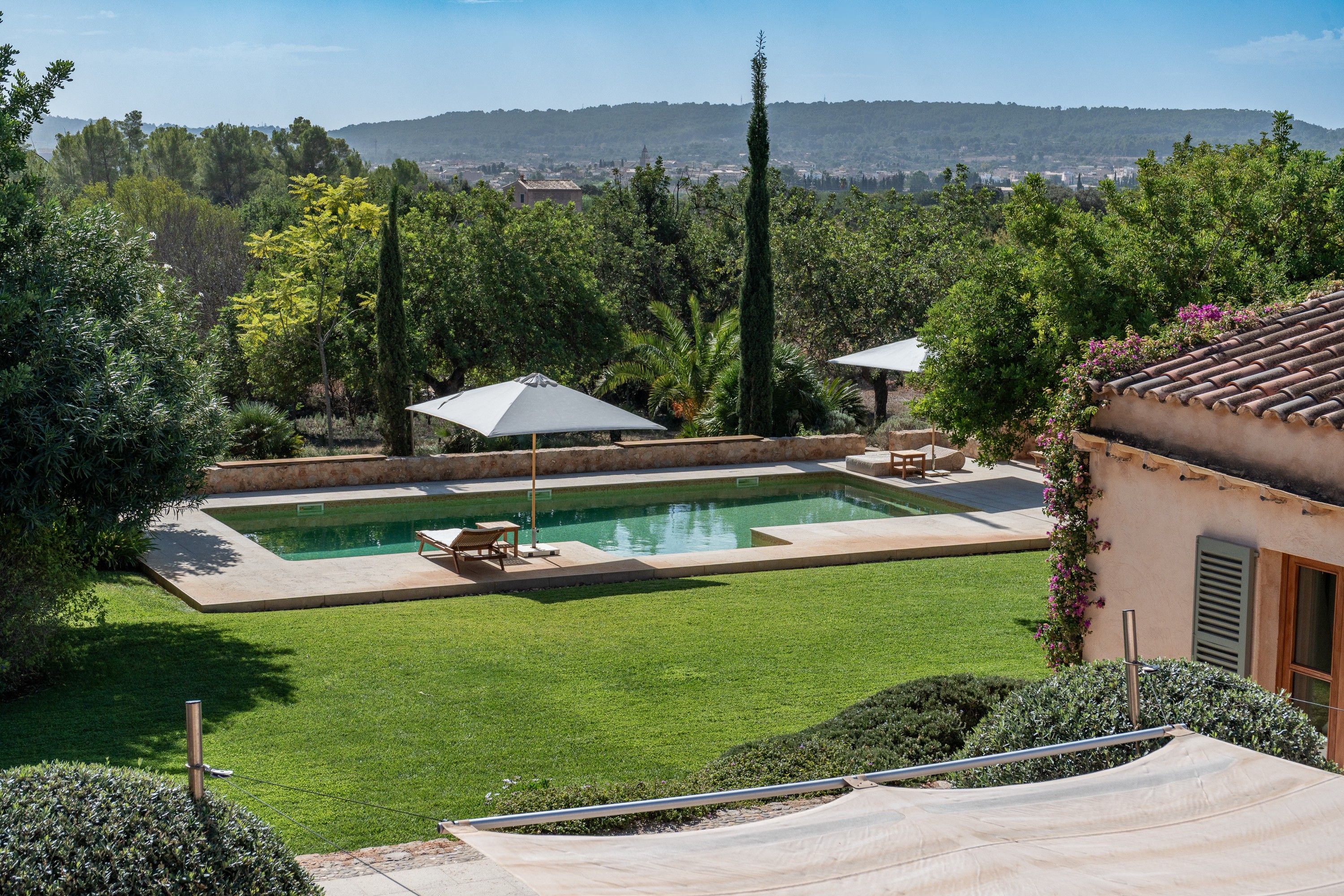 Fantastisk landsted designet af en kendt mallorcinsk arkitekt, der kombinerer traditionelle med moderne elementer. Huset ligger bagerst på grunden med masser af privatliv i en middelhavshave. Den resterende grund blev efterladt naturlig og byder på johannesbrød- og mandeltræer. Huset er bygget over en etage, bortset fra et stentårn, der indeholder hovedsuiten med badeværelse en suite. Alle andre soveværelser med badeværelser en suite samt den rummelige entré, stue/spiseområde med åbent køkken ligger på samme etage. Huset har en U-form, og på terrassen i midten er der oliventræer og et automatisk solsejl. Ejendommen har også en kælder med airconditioneret vinkælder, et stort maskinrum og et stort opbevaringsrum. Udover huset kan man finde en tilstødende bygning, der indeholder et stort vaskeri med masser af opbevaringsplads og overdækket parkering til to biler. Udvendigt er der omhyggeligt anlagte græsplæner og haver omkring huset. Fra to tagterrasser kan man nyde en dejlig udsigt, der strækker sig til landsbyen Santa Maria og til Tramuntana-bjergkæden. Poolen er 12 meter lang og har en skyggefuld terrasse i nærheden. Ejendommen er selvforsynende, elektricitet og varmt vand produceres med solpaneler. Der er en generator til rådighed som back-up. Yderligere funktioner: delvis stenfacade, træbjælker, pejs til at adskille rummet med vindue på begge sider, aircondition, gulvvarme, alarmsystem, egen brønd, automatiske solsejl til terrassen og begge tagterrasser, automatisk port, mulighed for at skabe et femte soveværelse ved at ombygge Master-suiten.
