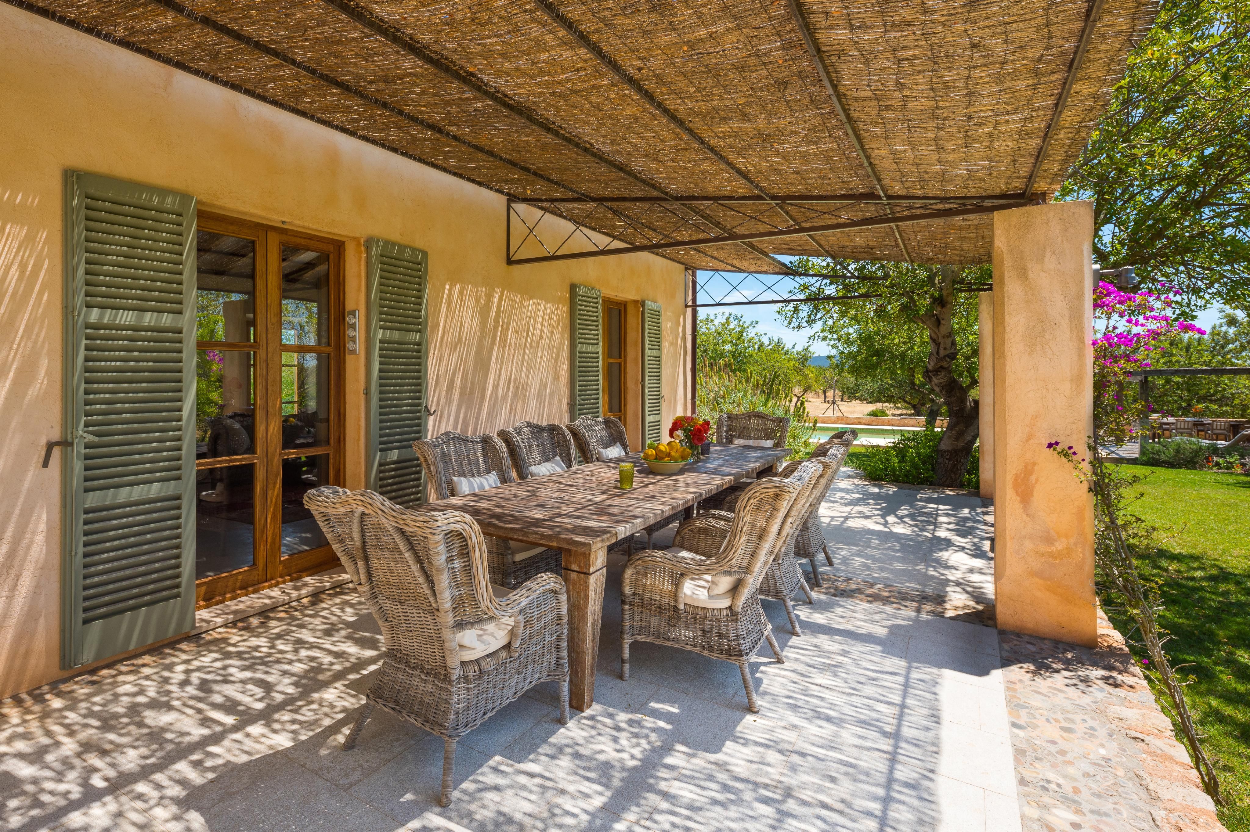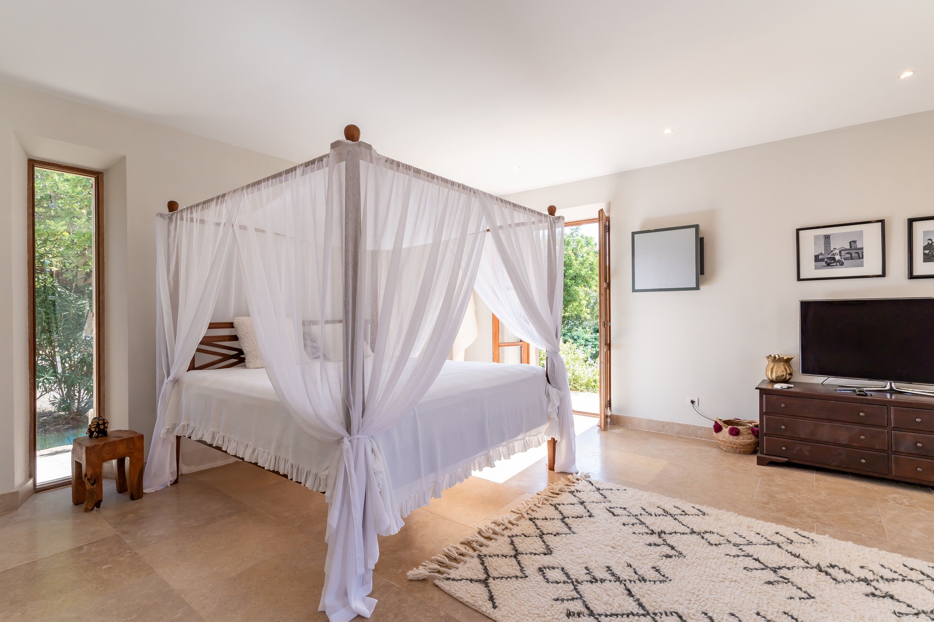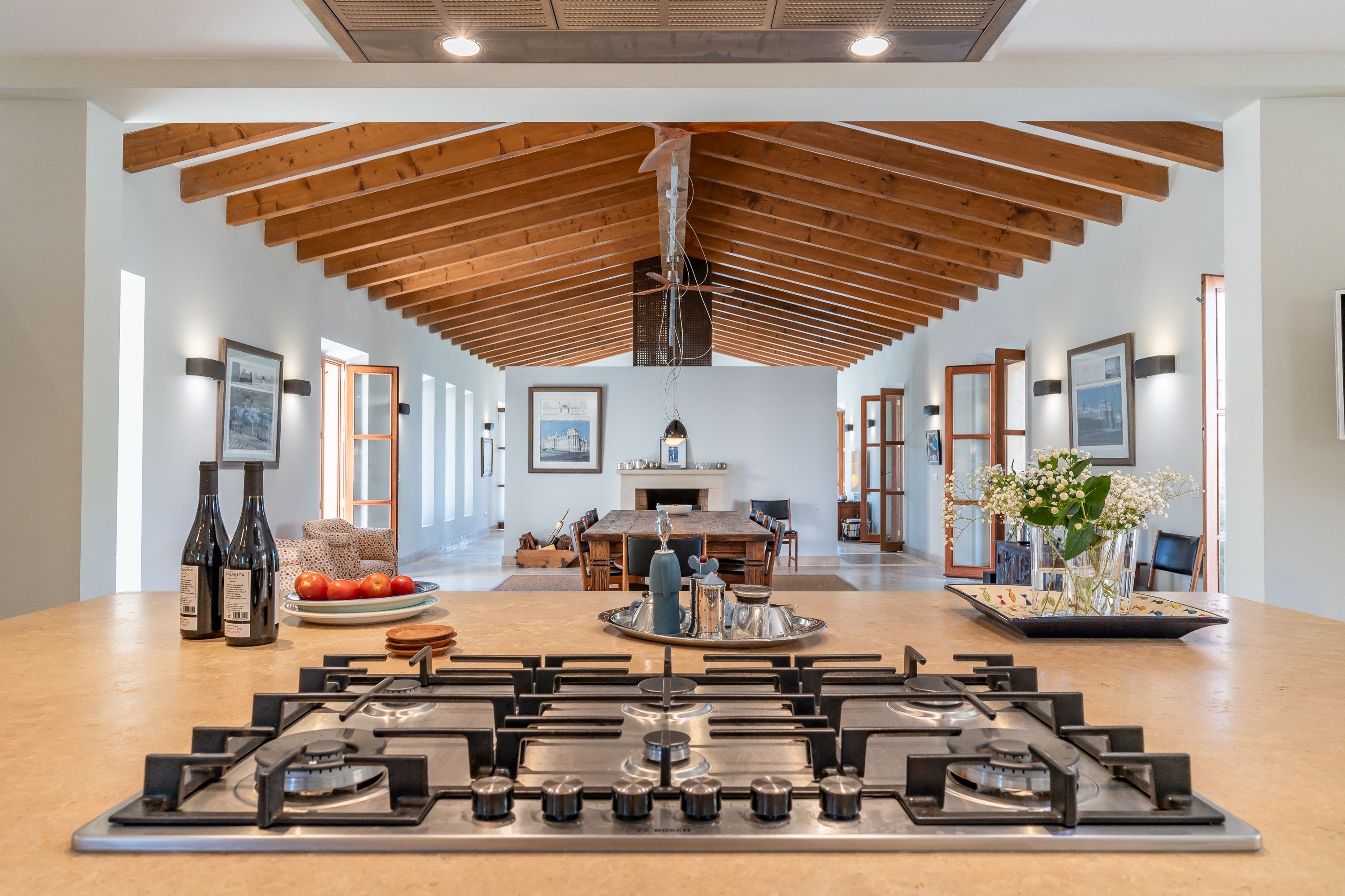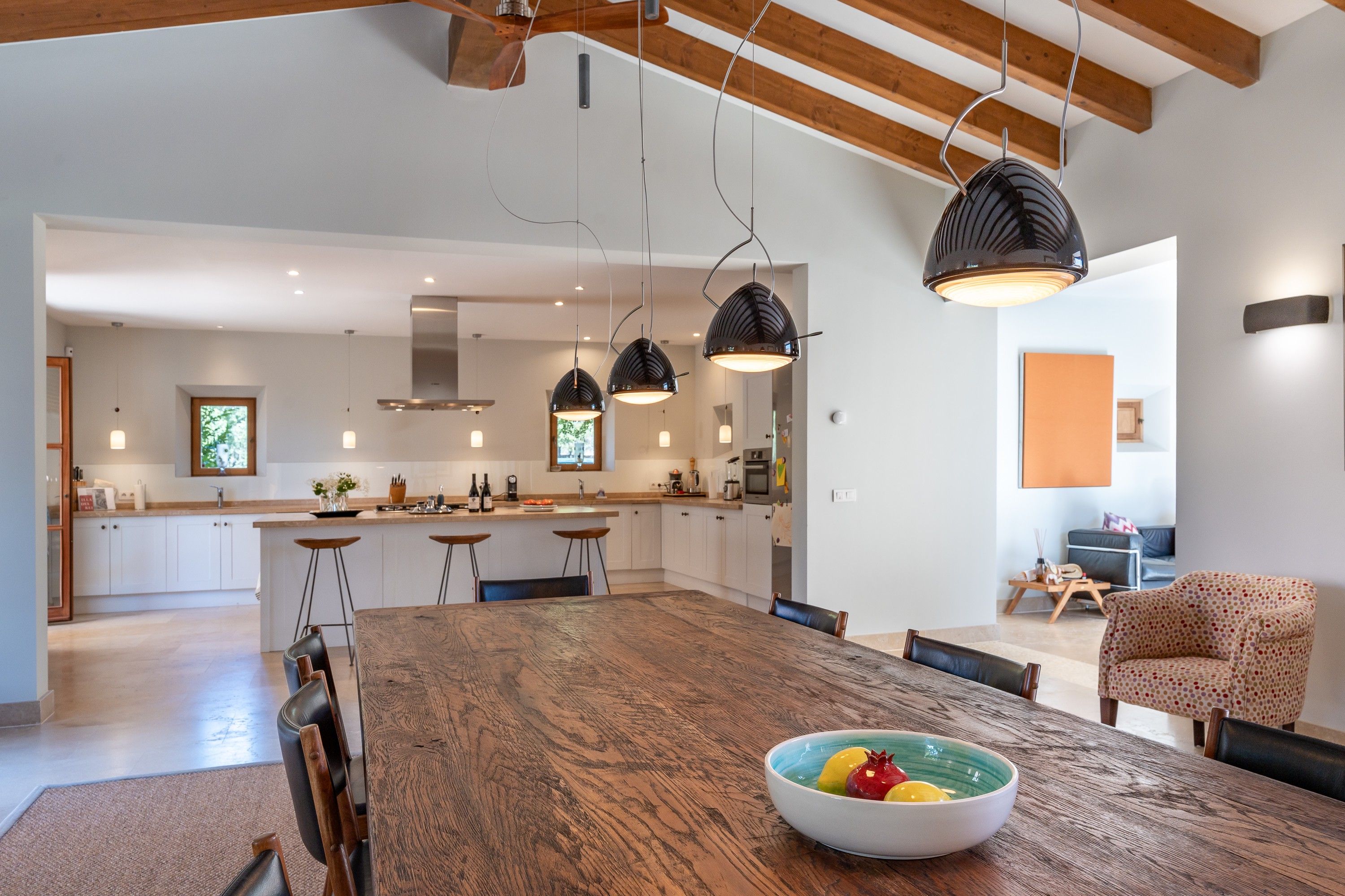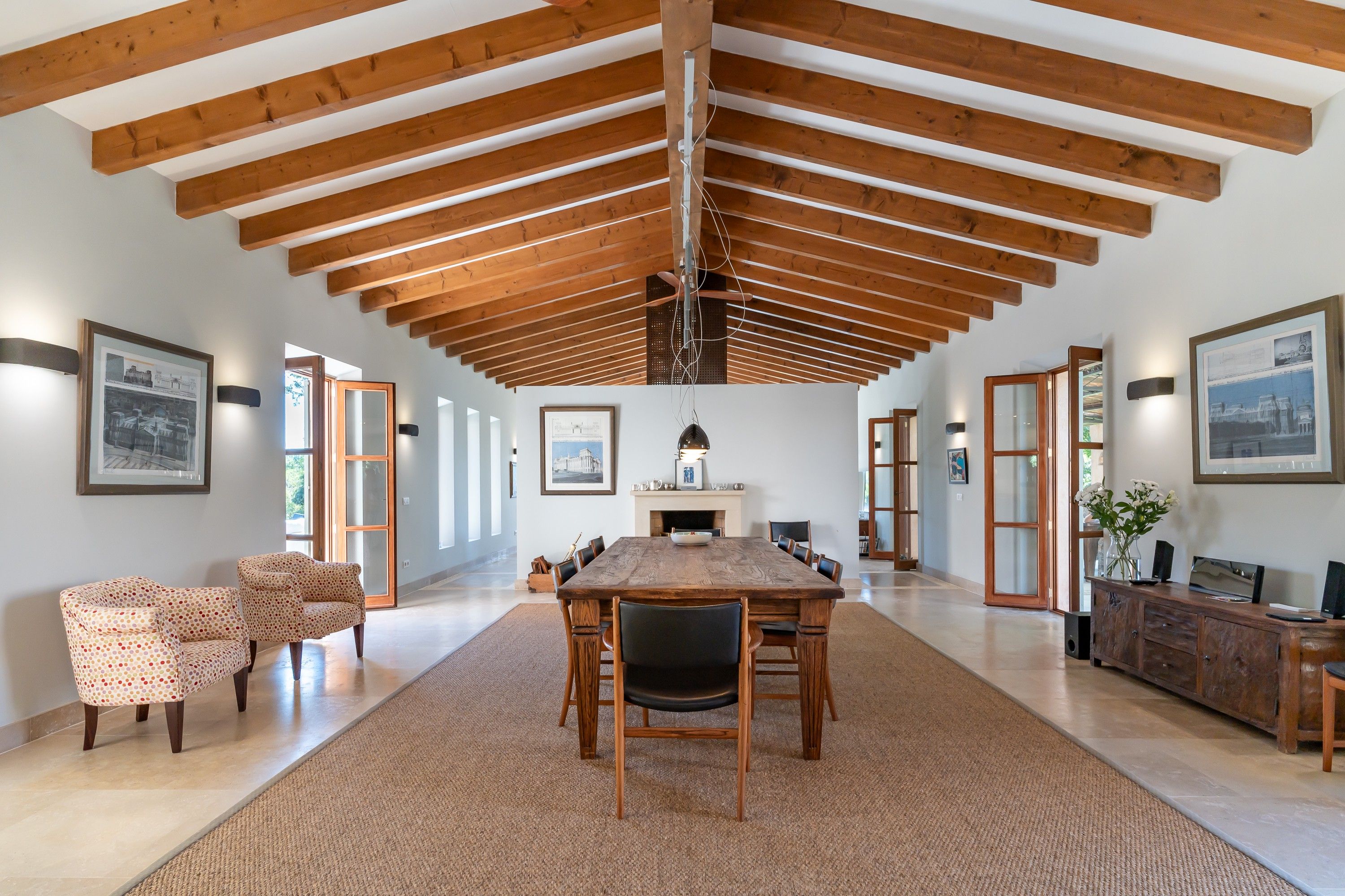 Fantastisk landsted designet af en kendt mallorcinsk arkitekt, der kombinerer traditionelle med moderne elementer. Huset ligger bagerst på grunden med masser af privatliv i en middelhavshave. Den resterende grund blev efterladt naturlig og byder på johannesbrød- og mandeltræer. Huset er bygget over en etage, bortset fra et stentårn, der indeholder hovedsuiten med badeværelse en suite. Alle andre soveværelser med badeværelser en suite samt den rummelige entré, stue/spiseområde med åbent køkken ligger på samme etage. Huset har en U-form, og på terrassen i midten er der oliventræer og et automatisk solsejl. Ejendommen har også en kælder med airconditioneret vinkælder, et stort maskinrum og et stort opbevaringsrum. Udover huset kan man finde en tilstødende bygning, der indeholder et stort vaskeri med masser af opbevaringsplads og overdækket parkering til to biler. Udvendigt er der omhyggeligt anlagte græsplæner og haver omkring huset. Fra to tagterrasser kan man nyde en dejlig udsigt, der strækker sig til landsbyen Santa Maria og til Tramuntana-bjergkæden. Poolen er 12 meter lang og har en skyggefuld terrasse i nærheden. Ejendommen er selvforsynende, elektricitet og varmt vand produceres med solpaneler. Der er en generator til rådighed som back-up. Yderligere funktioner: delvis stenfacade, træbjælker, pejs til at adskille rummet med vindue på begge sider, aircondition, gulvvarme, alarmsystem, egen brønd, automatiske solsejl til terrassen og begge tagterrasser, automatisk port, mulighed for at skabe et femte soveværelse ved at ombygge Master-suiten.