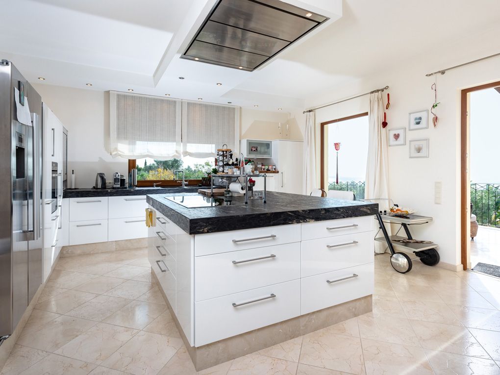 Huset er fordelt på første sal og første sal. Når man kommer ind i huset, kan man fornemme husets store dimensioner. Den imponerende entré med to trapper strækker sig til anden sal. Første sal byder på en rummelig stue/spisestue, der smelter sammen med det veludstyrede køkken. Herfra er der også adgang til verandaen og poolen, som også kan bruges på køligere dage takket være poolopvarmningen. Ved siden af køkkenet er der endnu et køkken og et toilet. Første sal har også et soveværelse, et stort badeværelse og et andet område med sauna og smuk udsigt.