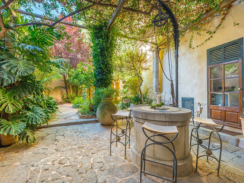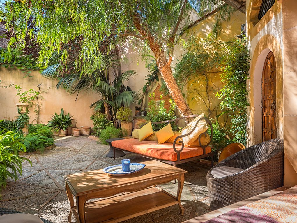 Man kommer ind i huset gennem en traditionel entré med naturstensgulve og højt træbjælkeloft. På bagsiden åbner det op til en romantisk gårdhave i maurisk stil med frodig vegetation og en magisk hytte.