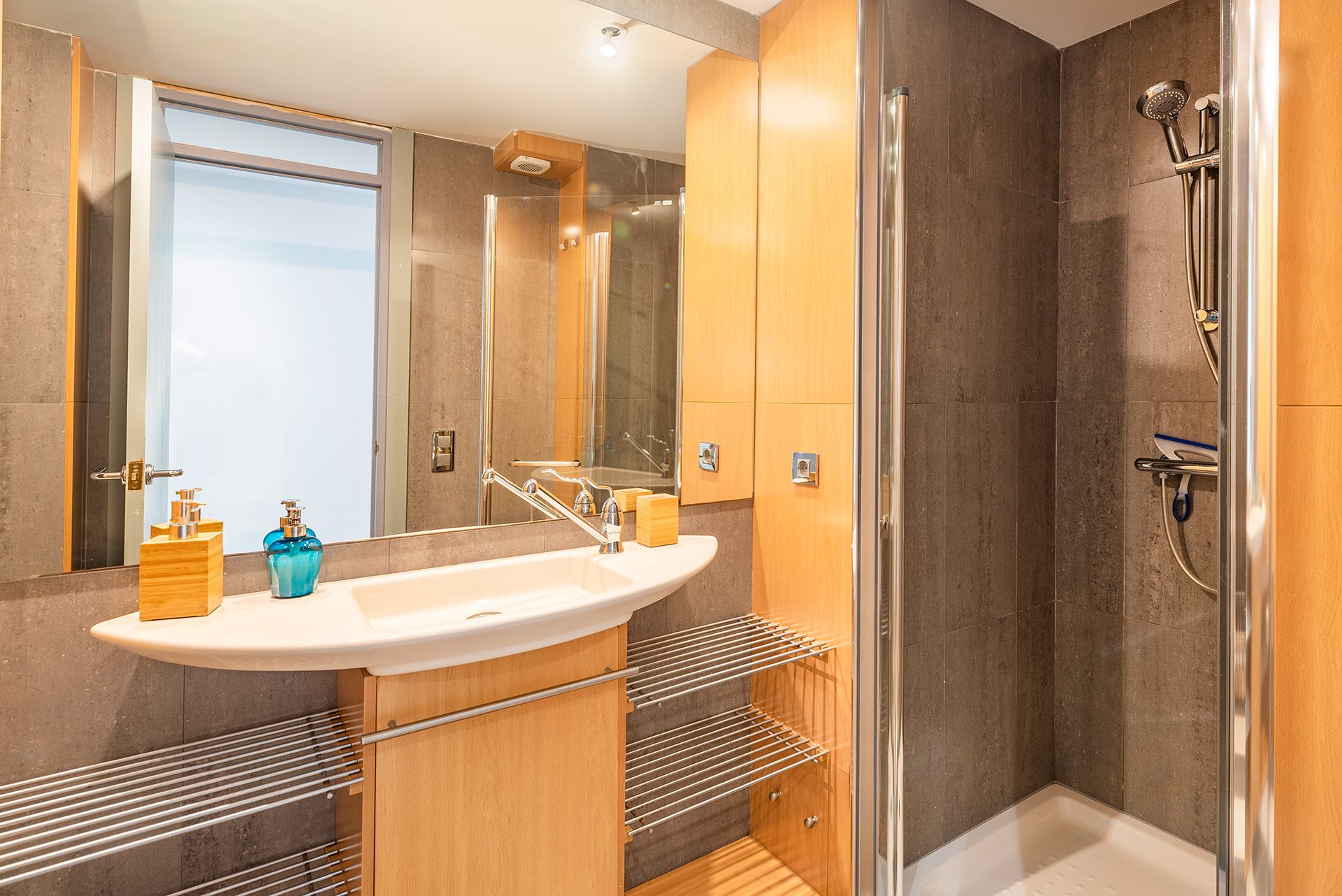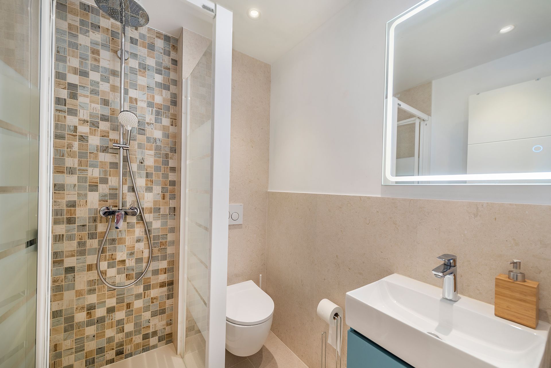 og omhyggeligt udvalgte detaljer giver rummene en tidløs elegance. Dette område ligger på 4. sal. På første etage er der en anden stue med et lille åbent køkken, over hvilket der er tre soveområder med to badeværelser, hvoraf det ene er en suite. På 3. sal er der to soveværelser med dobbeltsenge og to badeværelser samt et opbevaringsrum. Den øverste etage har adgang til den store tagterrasse med smuk udsigt og en automatisk indtrækkelig markise samt endnu et soveværelse.