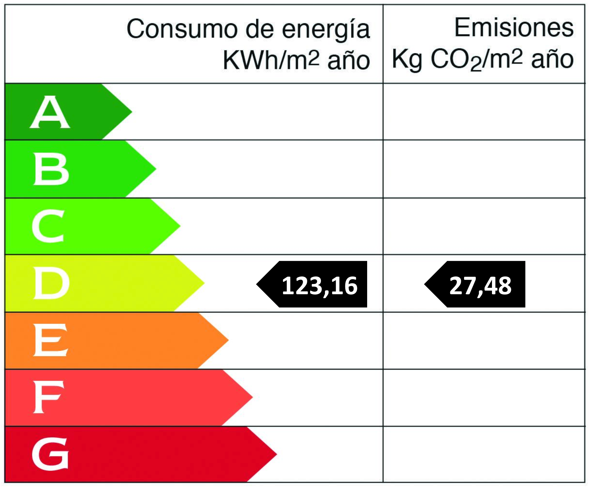 • energiforbrugskoefficient: 123.16 kWh/(m2*a) • CO2-emission: 27.48 kg/m2 • CO2-emissionsklasse: D • Varmeform: Elektrisk opvarmning • Energieffektivitetsklasse: D