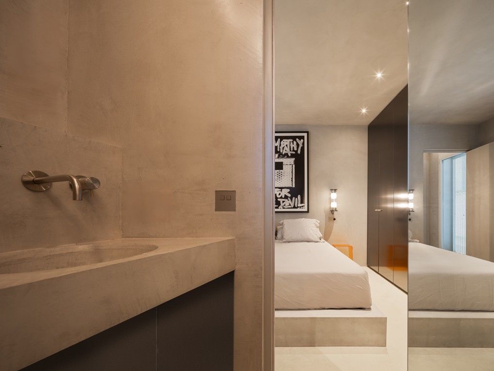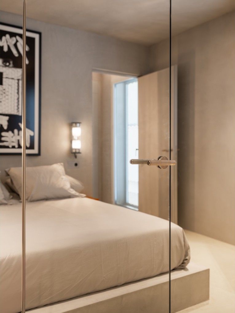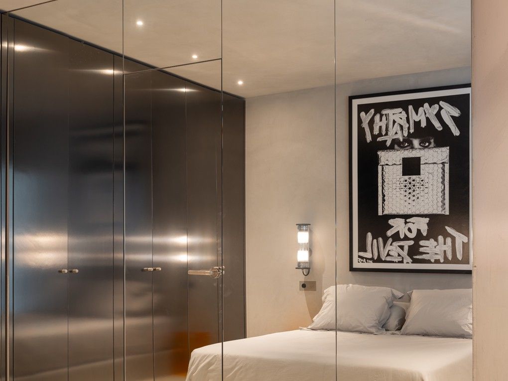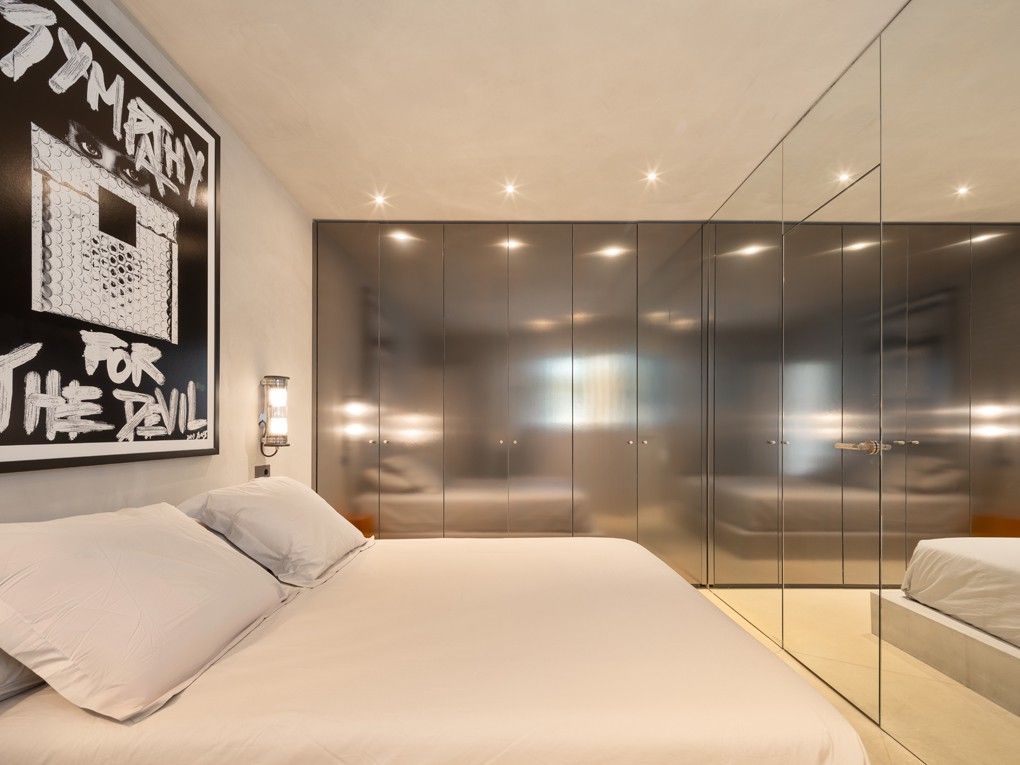 Første sal er dedikeret til et hyggeligt soveværelse med eget badeværelse. De skræddersyede garderobeskabe med markante titaniumdøre giver rummet et strejf af moderne elegance og skaber en rolig og stilfuld ferie.
