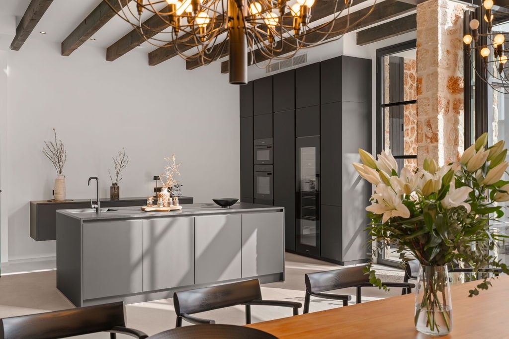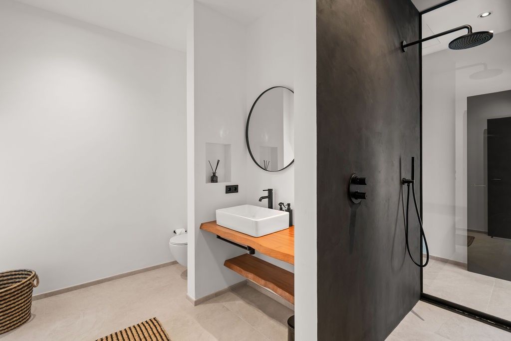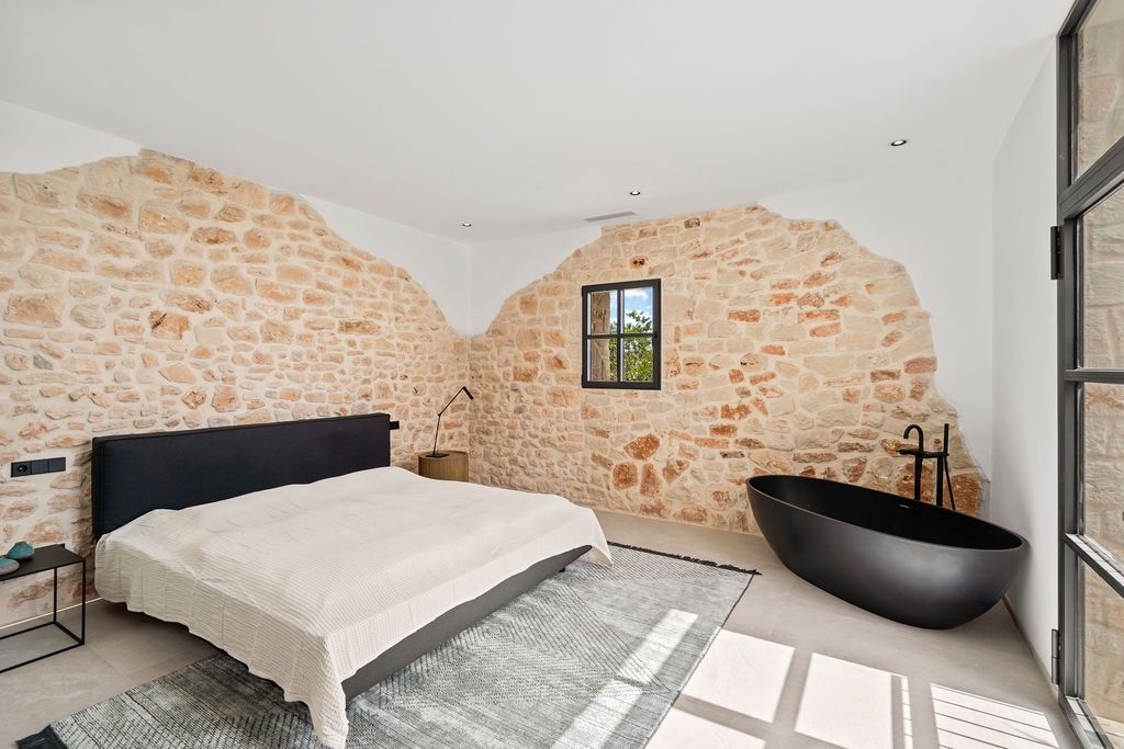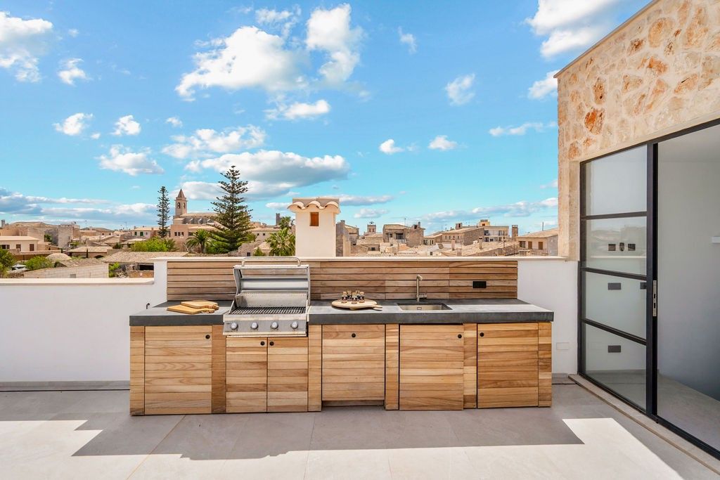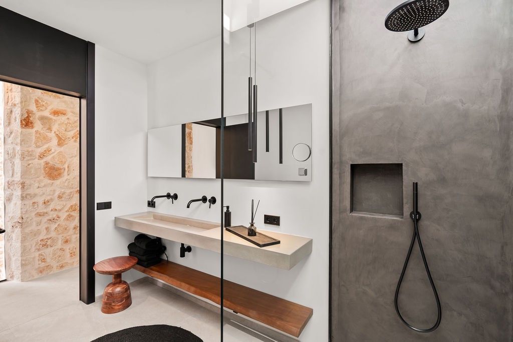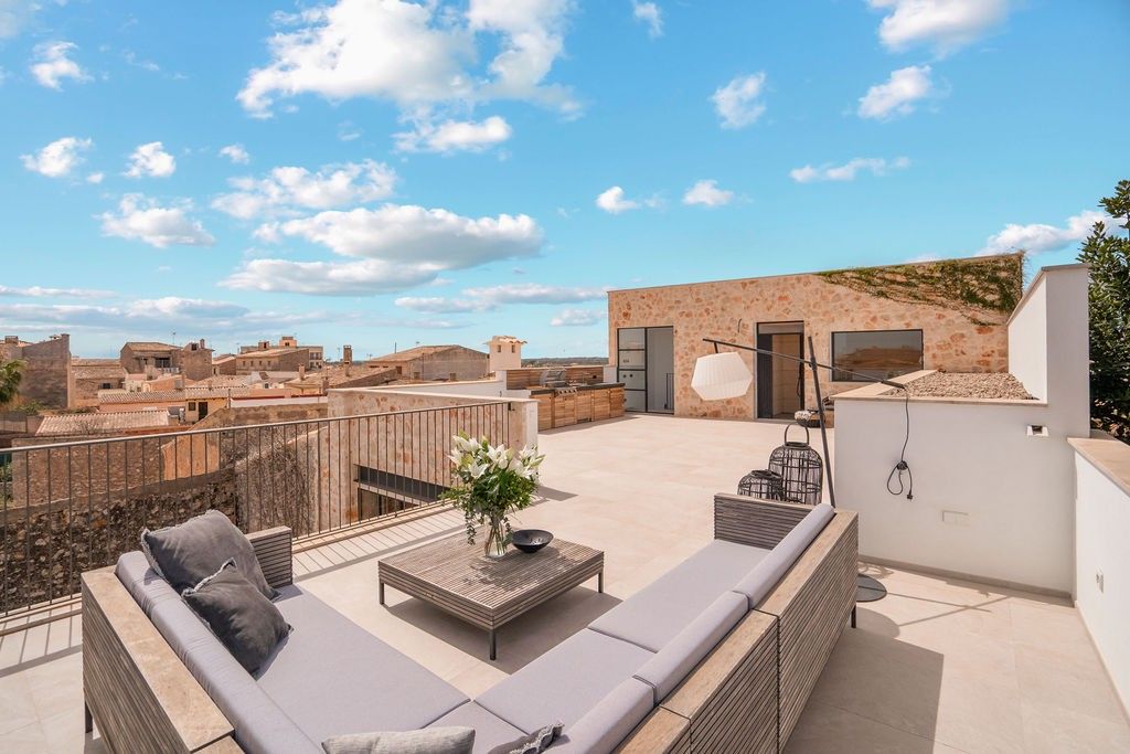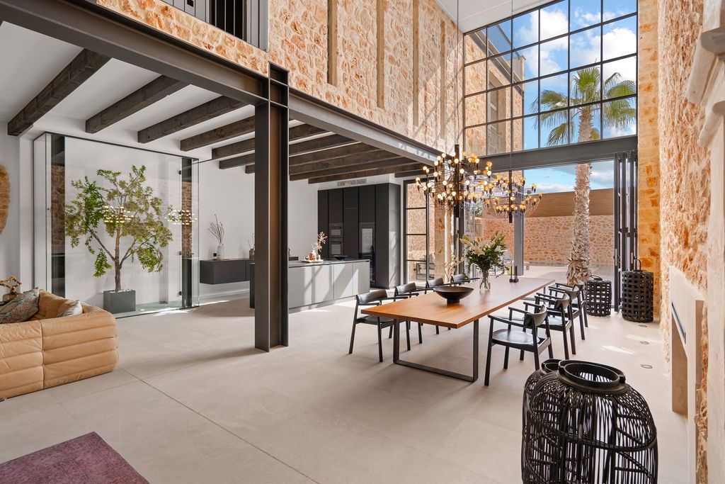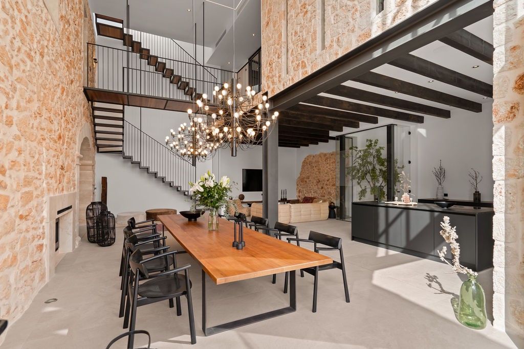 Dette byhus ligger mindre end 3 minutters gang fra hovedtorvet og blev totalrenoveret med stor opmærksomhed på detaljer i 2022. Det fascinerer med en vellykket kombination af traditionelle natursten og moderne metalelementer. Når man kommer ind i huset, mærker man straks den unikke loftskarakter. Stueetagen imponerer med en indbydende indgang, der sømløst går over i det rummelige opholds- og spiseområde med et åbent, moderne køkken. Den imponerende vinduesfront i to etager skaber en generøs atmosfære og lukker masser af naturligt lys ind. Palmetræet i gårdhaven giver ikke kun skygge, men fungerer også som et ægte blikfang indefra. En moderne trappe fører op til første sal, hvor der er tre lyse soveværelser med hver sit badeværelse. Et slående sort badekar giver det store soveværelse et stilfuldt præg. Et omklædningsrum med dagslys fuldender dette område. Den rummelige tagterrasse med udendørs køkken byder på en betagende udsigt over tagene i Santanyi. Her finder du også en rummelig sauna med en tilstødende bruser, som ikke kun tilbyder afslapning, men også en udsigt over kirken i Santanyi. En varmepumpe og individuelt regulerbare klimaanlæg sikrer et behageligt indeklima hele året rundt. Alt i alt præsenterer dette byhus sig som et moderne og unikt mesterværk, som imponerer med sin vellykkede kombination af traditionelle og moderne elementer.